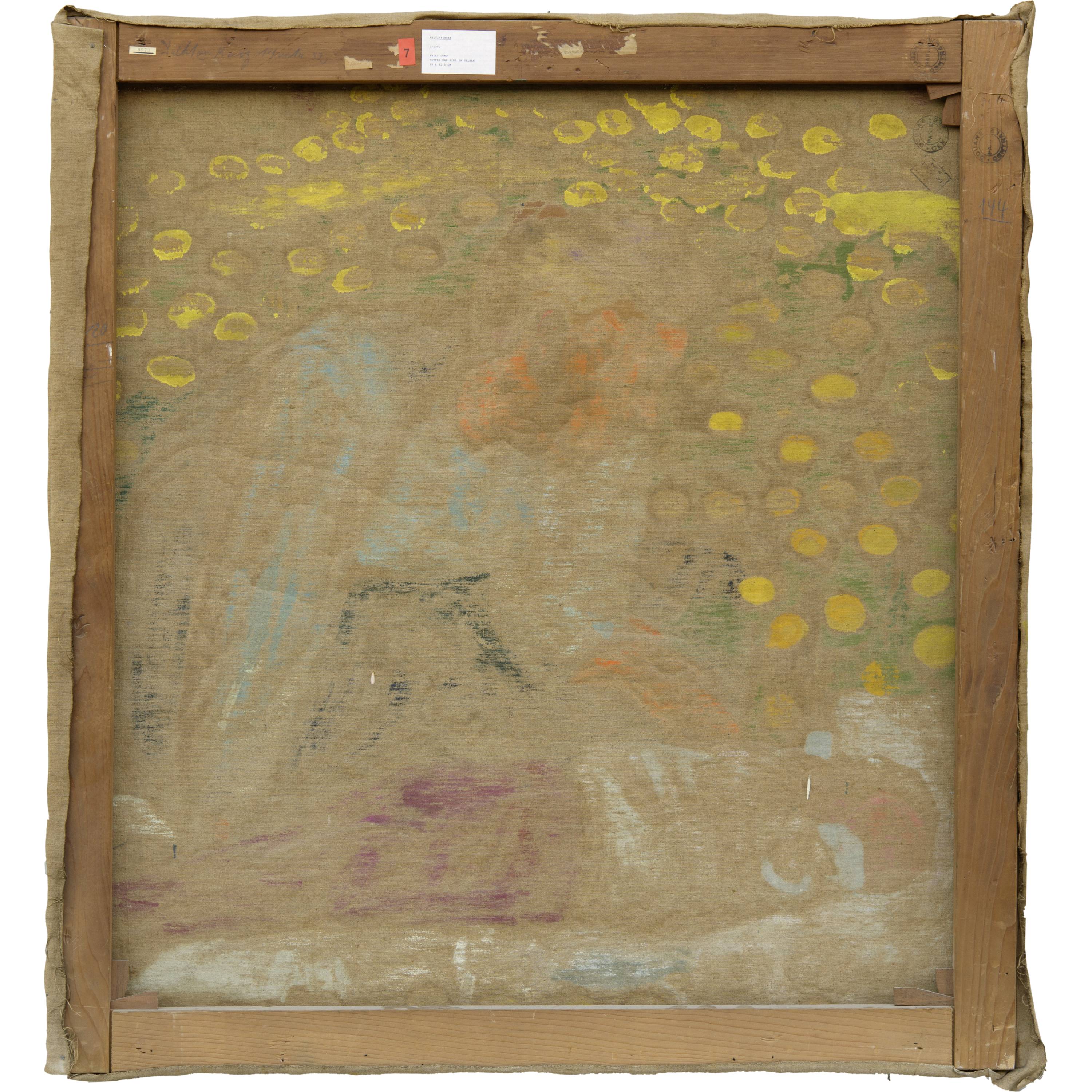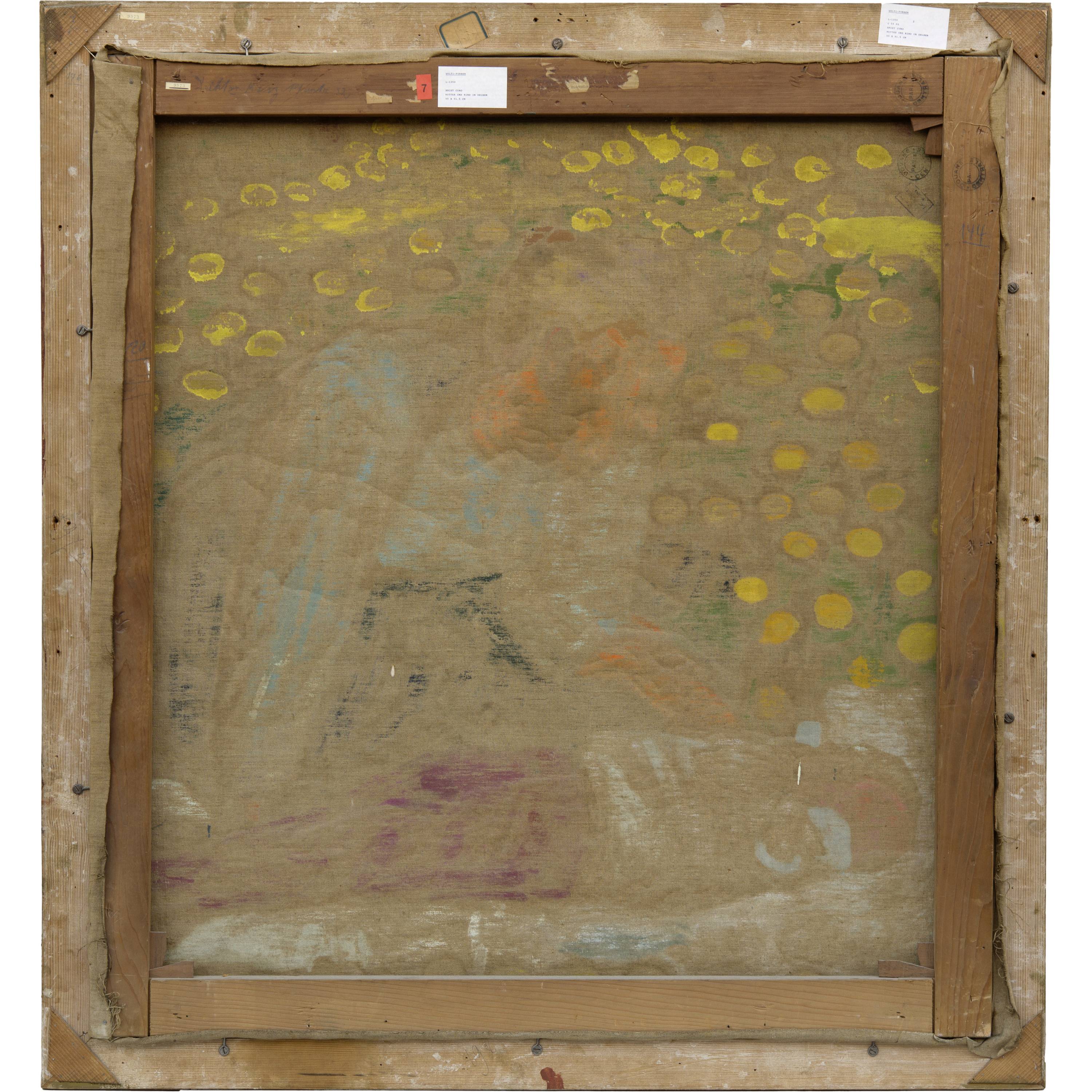 Mit Richard Kislings Hinweis auf ein erstes Bild wird wohl das Bild im Kunstmuseum Basel gemeint sein, das dem vorliegenden in der Komposition der Figuren entspricht. Die detailreichere Ausführung von "Mutter und Kind" in der ersten Fassung sowie die Komposition des Hintergrundes unterscheiden die beiden Werke. Auffallend sind beim vorliegenden Bild die angeschnittenen Baumstämme am hohen Horizont und der kleine, mit Löwenzahn bewachsene Hügel, der das quadratische Format beinahe ganz ausfüllt. Während die Basler Fassung zu Amiets Lebzeiten nicht ausgestellt wurde, war das für Dr. Hermann Kurz gemalte Gemälde öfter in Ausstellungen zu sehen. Drei rückseitig auf der Leinwand und auf dem Keilrahmen angebrachte Pariser Zollstempel weisen zudem auf die grosse internationale Einzelausstellung Cuno Amiets von 1932 in der Galerie Georges Petit in Paris hin