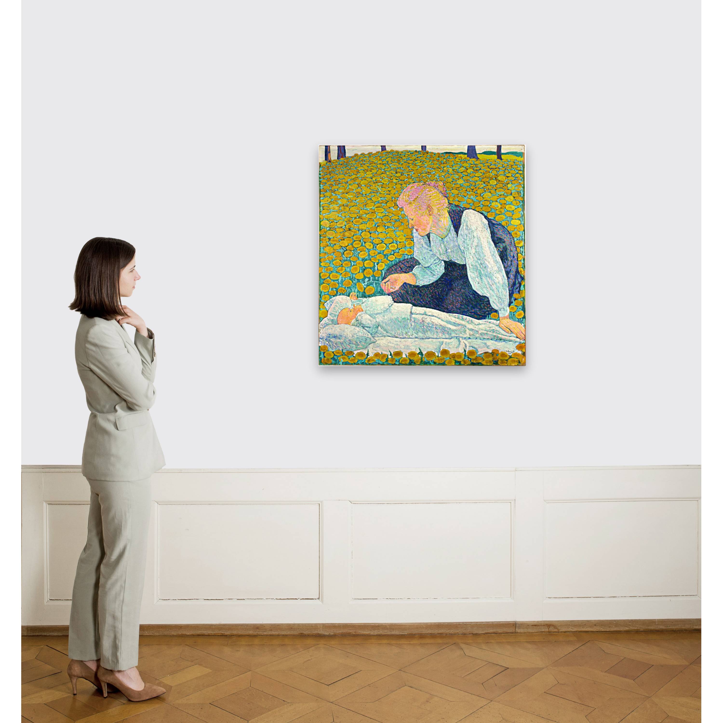 Cuno Amiet malte das Sujet von Mutter und Kind in einem Garten in zwei stilistischen und formal unterschiedlichen Fassungen (WK Nr. 1905.06 und WK Nr. 1906.07). In beiden Fassungen ist Louise Grütter als Modell erkennbar, die Amiet in einer Reihe von Werken ab 1905 als junge Mutter porträtierte. Louise Grütter-Geel war eine Bäuerin aus der Nachbarschaft auf der Oschwand. Sie half in späteren Jahren Anna Amiet bei der Pflege von Haus und Garten