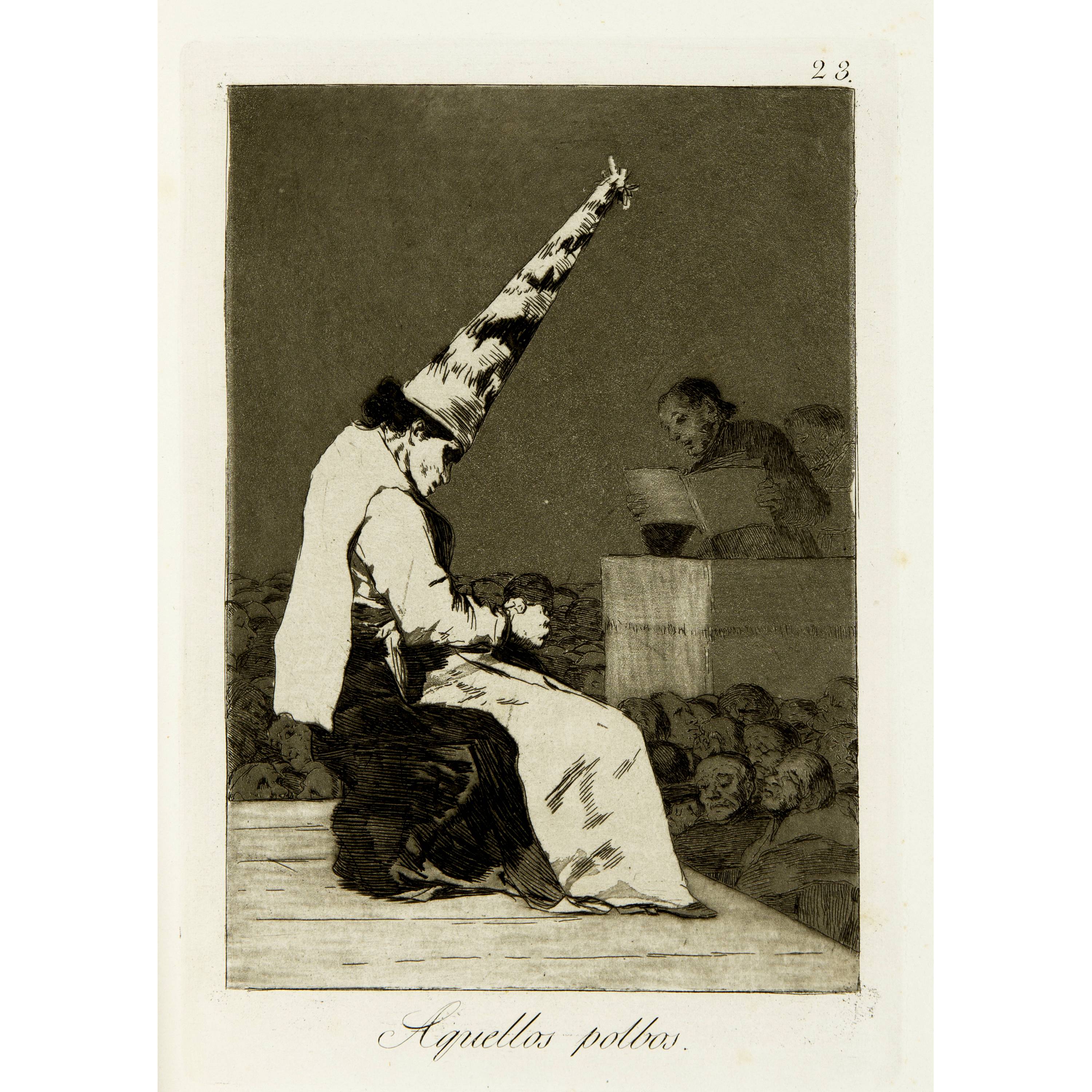 Komplette Ausgabe der Folge, publiziert 1868 von der "Calcografía Nacional" in Madrid in nur kleiner Auflage auf festem Velin. Mit Ausnahme des 1. Blattes mit dem Portrait von Goya alle 79 restlichen Blätter von den noch nicht facettierten Platten gedruckt