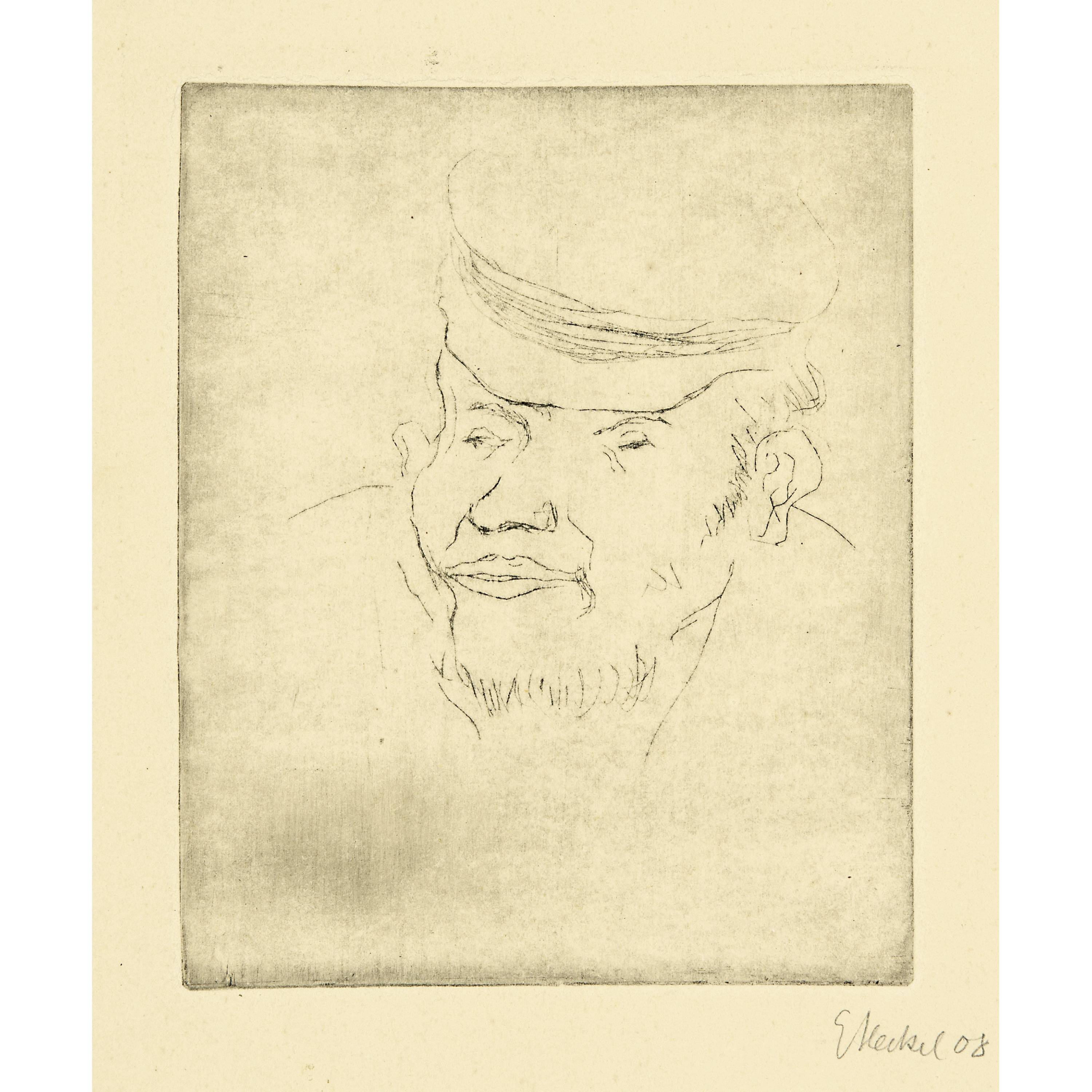 Unten rechts vom Künstler in Bleistift signiert "E Heckel 08", im Unterrand links "1. Druck einer Kalt-Nadel-Radig", unten rechts mit einer monogrammierten Dedikation an "Dr. W."