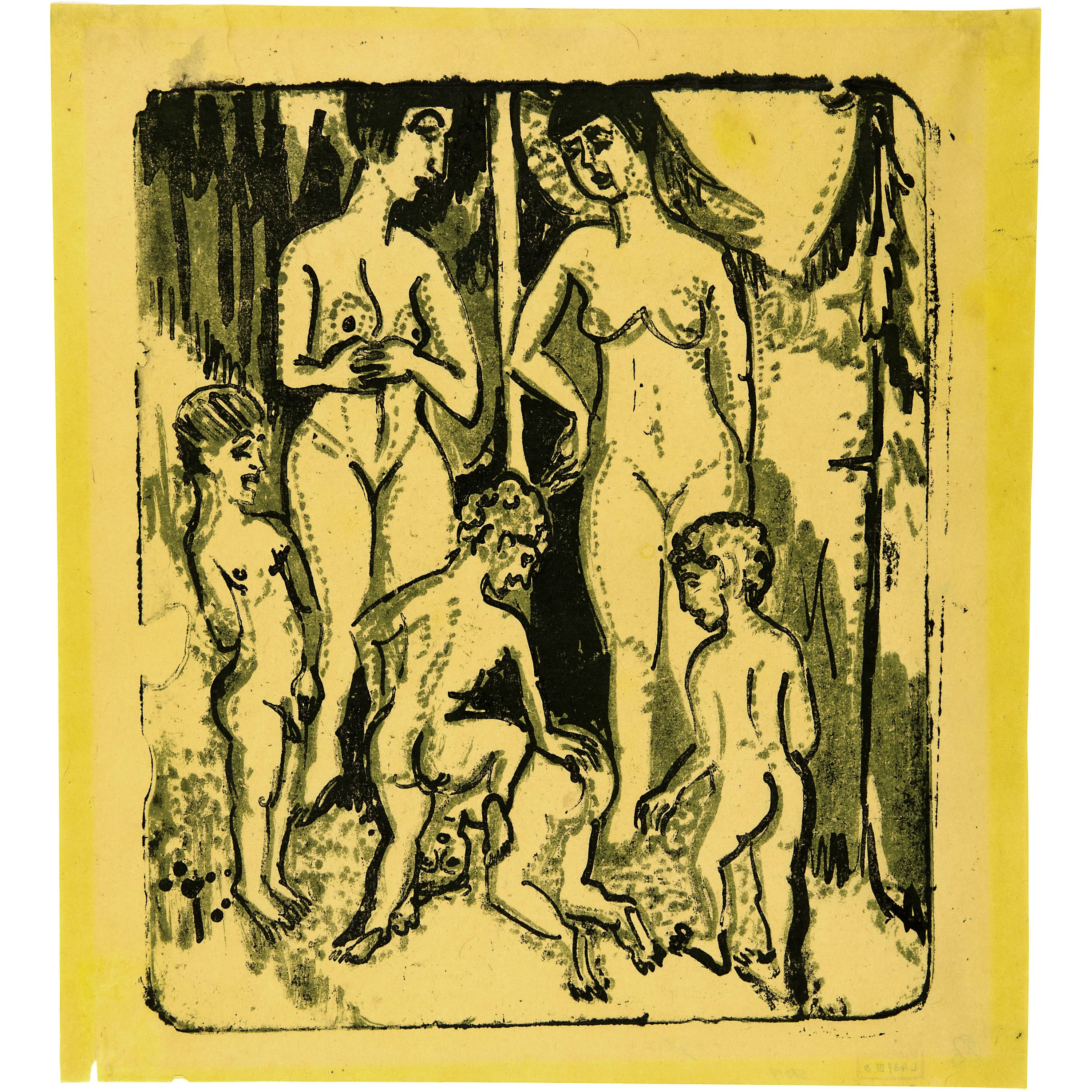 Sehr schöner farbiger Druck von 2 Steinen auf dünnem gelben Bütten. Drucke sind selten, Gercken kann im neuen Werkverzeichnis lediglich 9 Exemplare nachweisen. Im unteren Rand links minimaler Papierverlust