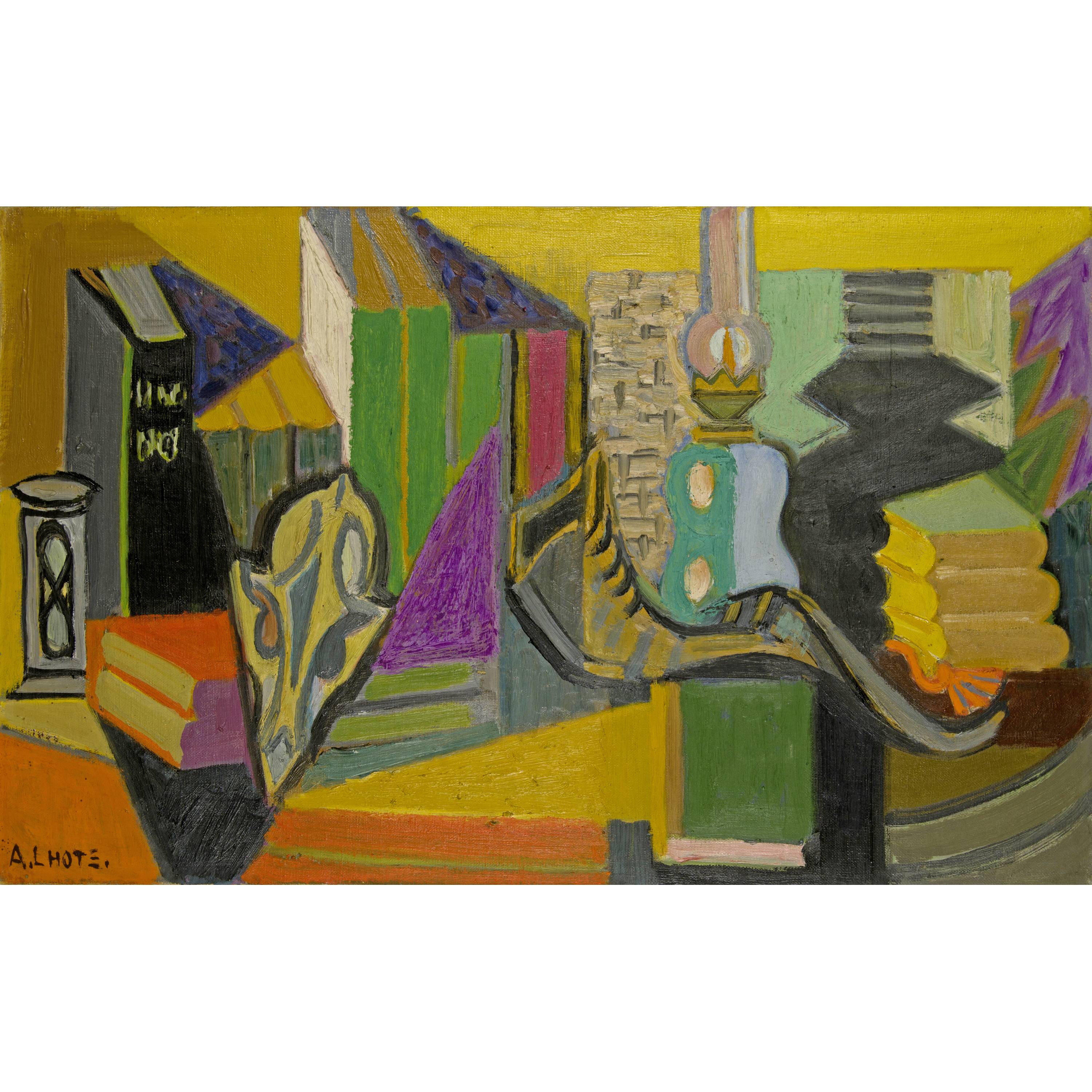 Unten links vom Künstler in Pinsel in schwarzer Ölfarbe signiert "A. LHOTE.". Rückseitig auf dem Chassis in Bleistift von der Hand des Künstlers betitelt "La Lampe"