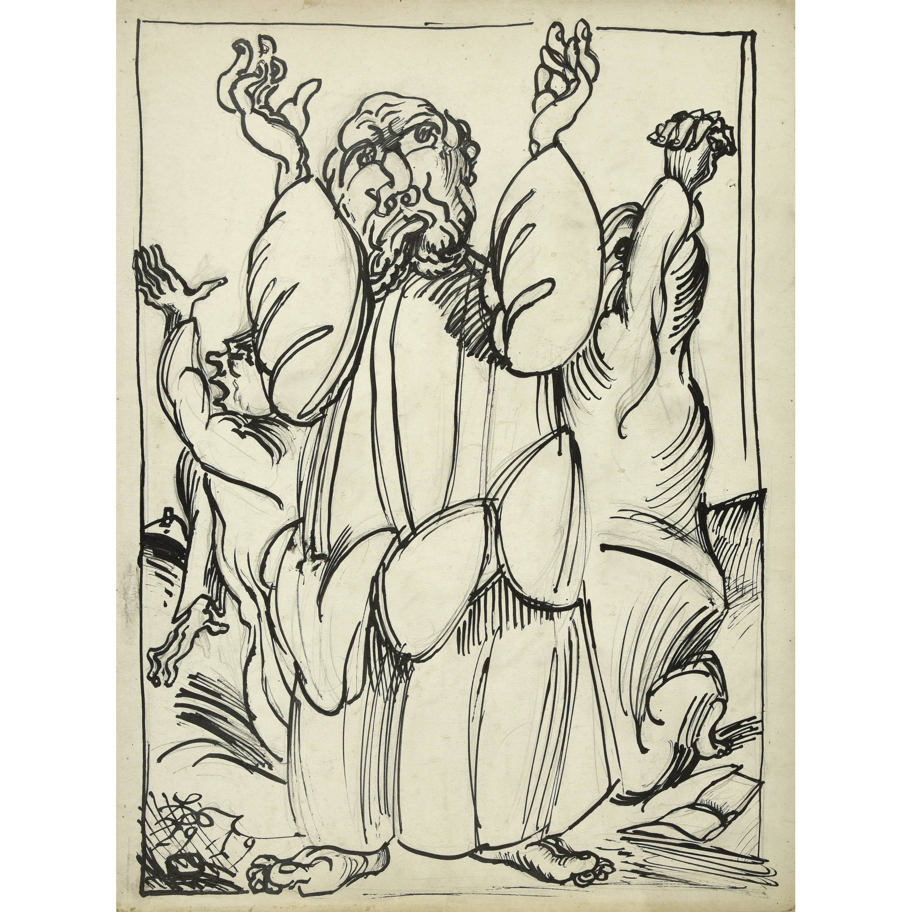Expressive und geschwungen-bewegte Darstellung von drei betenden Figuren. Religiöse Motive wie Propheten spielen im Werk von Meidner immer wieder eine grosse Rolle