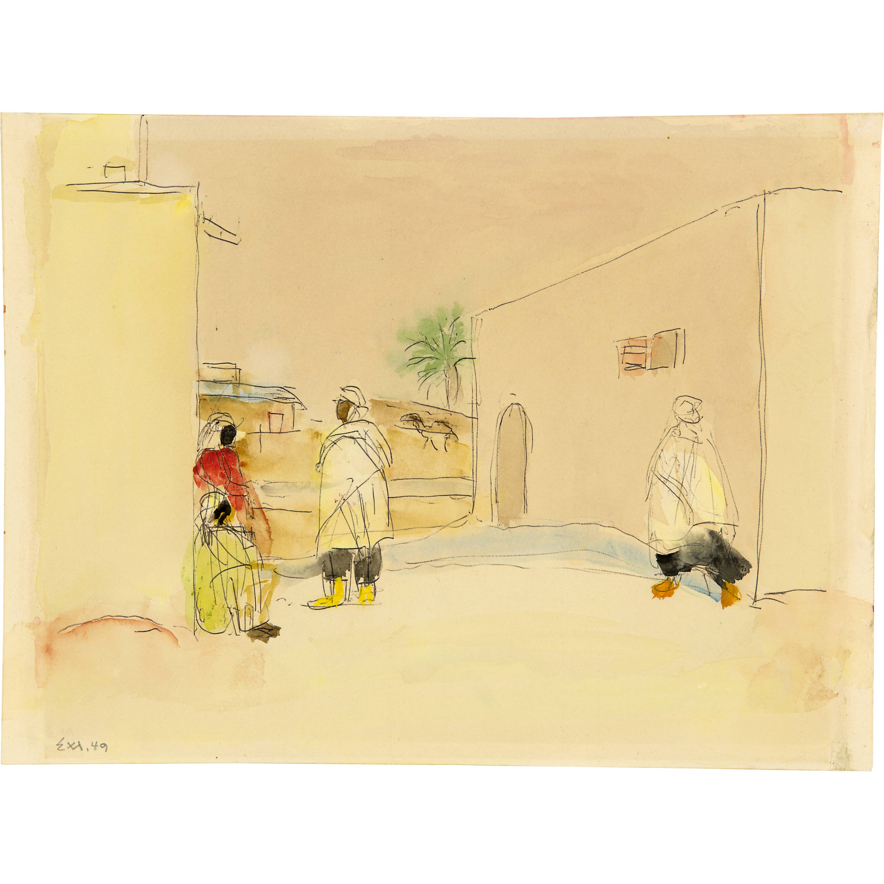 Unten links in Bleistift monogrammiert und datiert "E M. 49". Auf Etikett betitelt, datiert und signiert "Touggourt (Algérie) / 1949 / Ernst Morgenthaler" und unten rechts vom Künstler in Bleistift monogrammiert "EM"