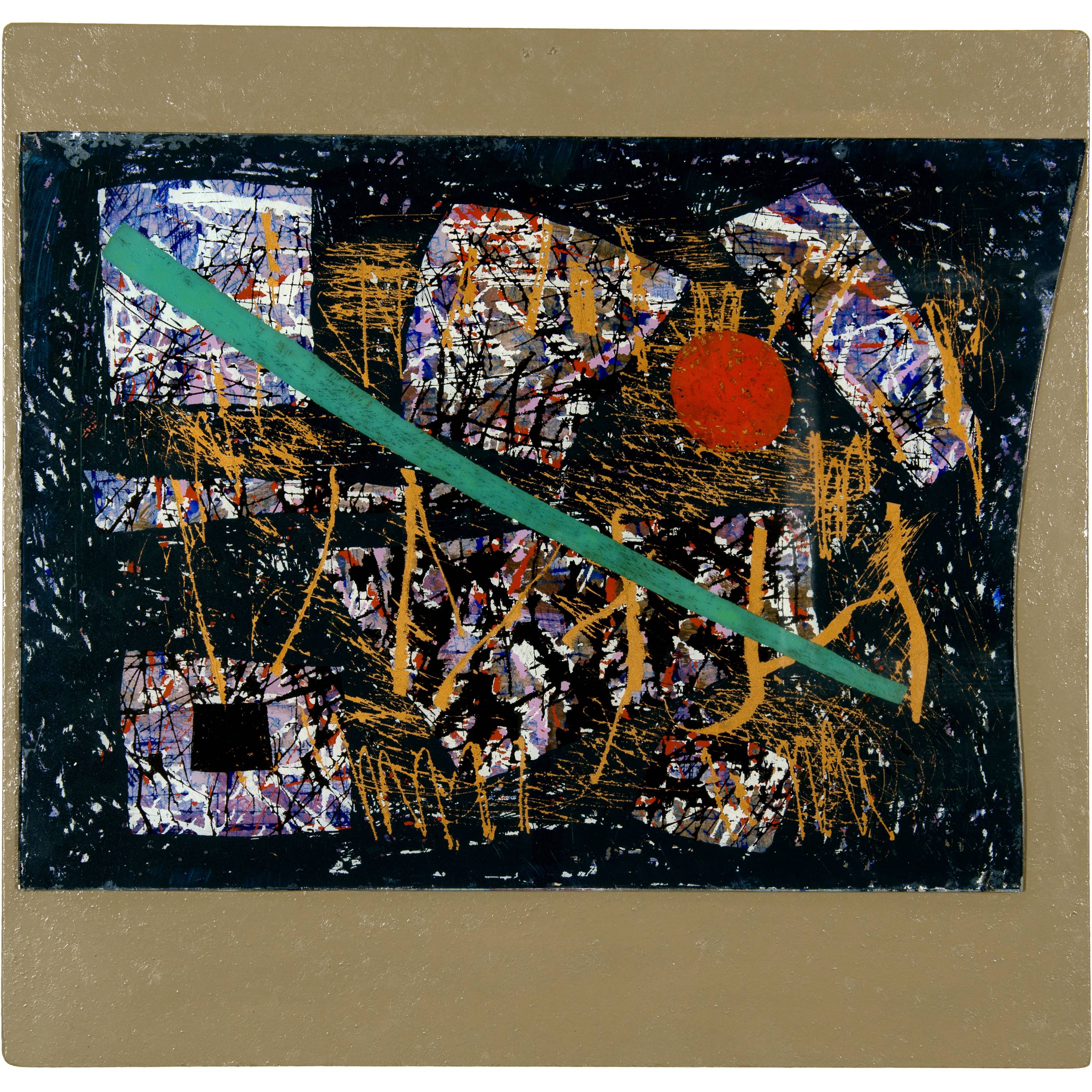 Farbige Hinterglasmalerei, auf bemalte Spanplatte montiert