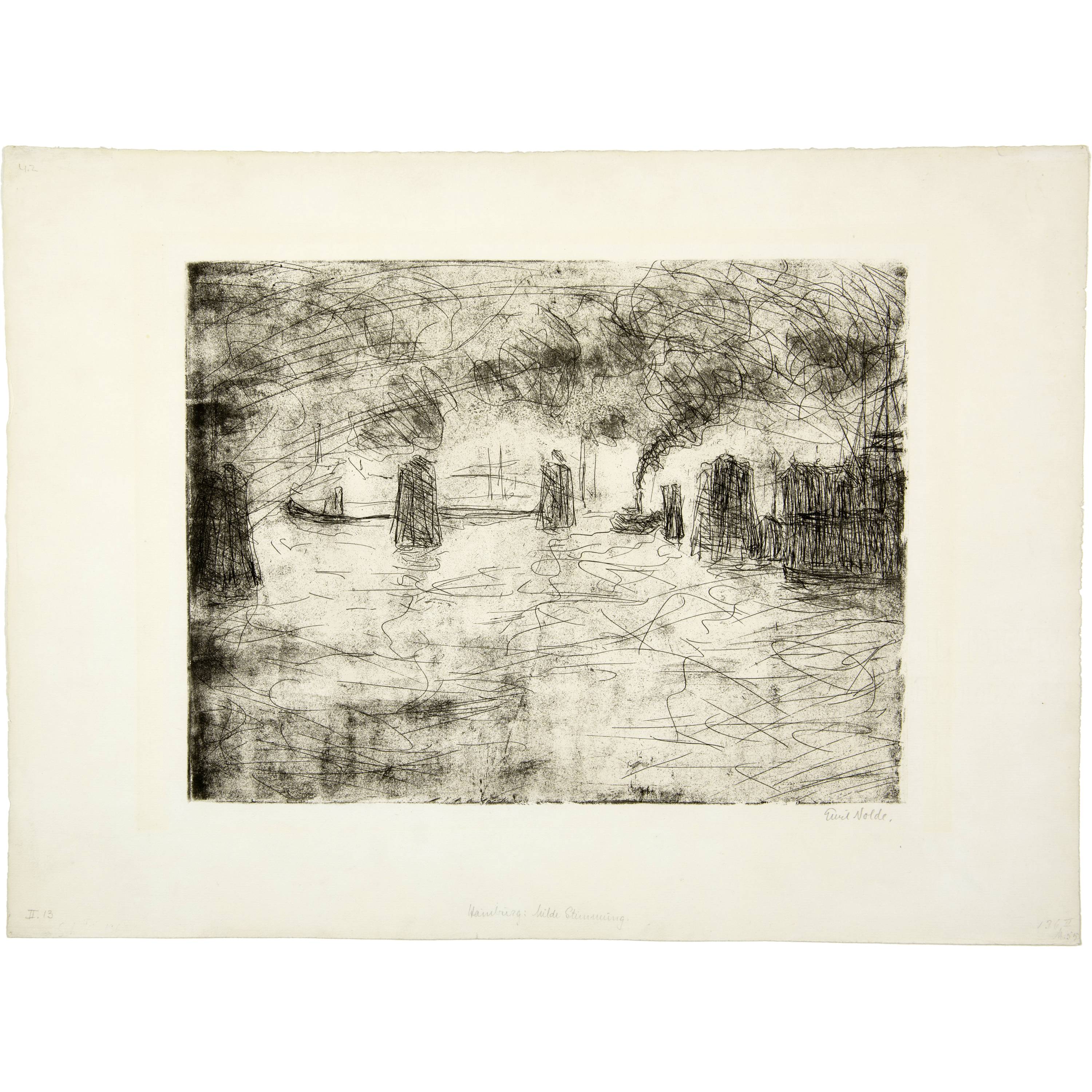 Rechts unterhalb der Plattenkante in Bleistift signiert "Emil Nolde". Unten in der Mitte von Ada Nolde betitelt "Hamburg: Milde Stimmung" und links in der äussersten Ecke als 13. Druck des II. Zustandes nummeriert "II.13"