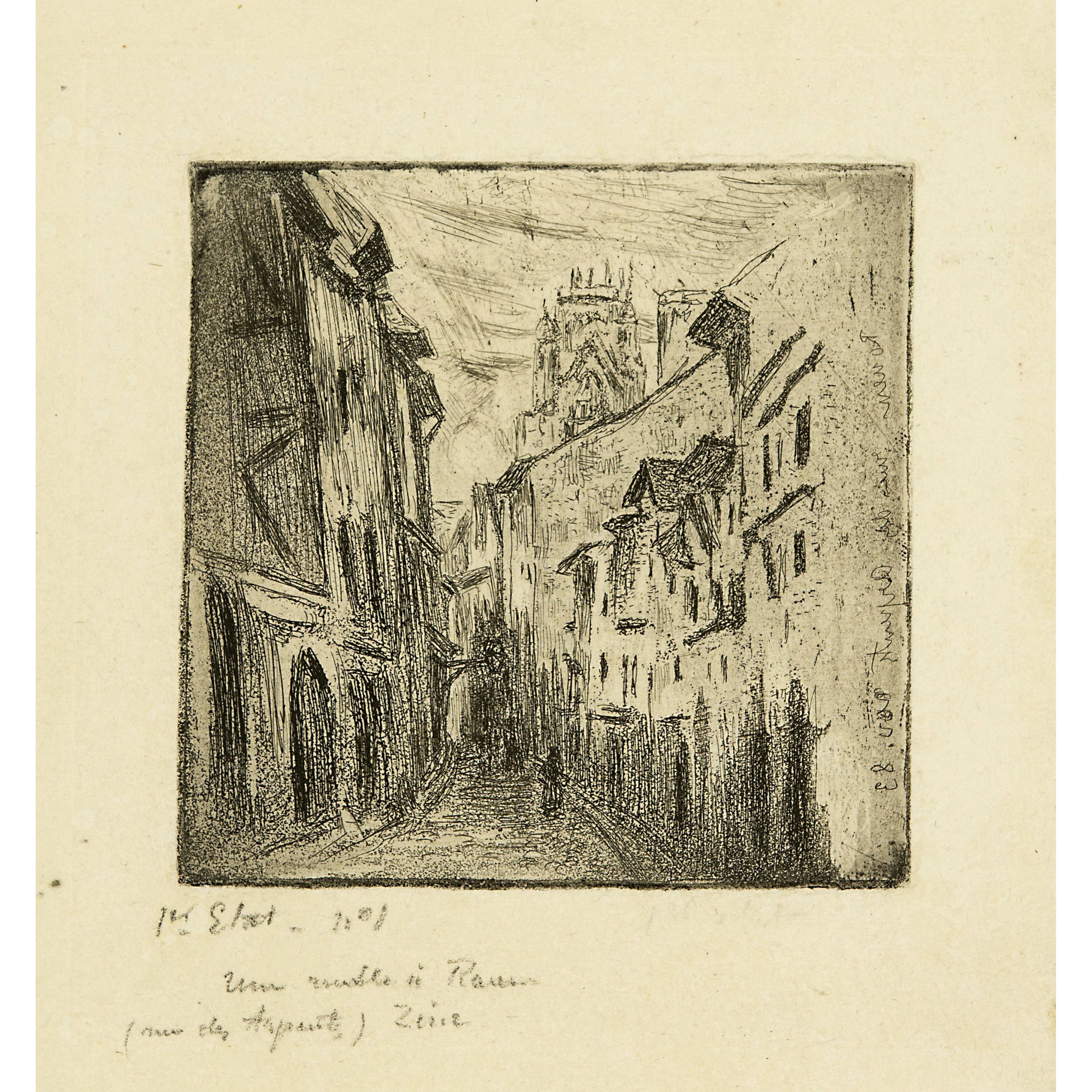 Unten links vom Künstler eigenhändig bezeichnet "1er Etat - n° 1 / Une Ruelle à Rouen / (rue des Arpents) / Zinc"