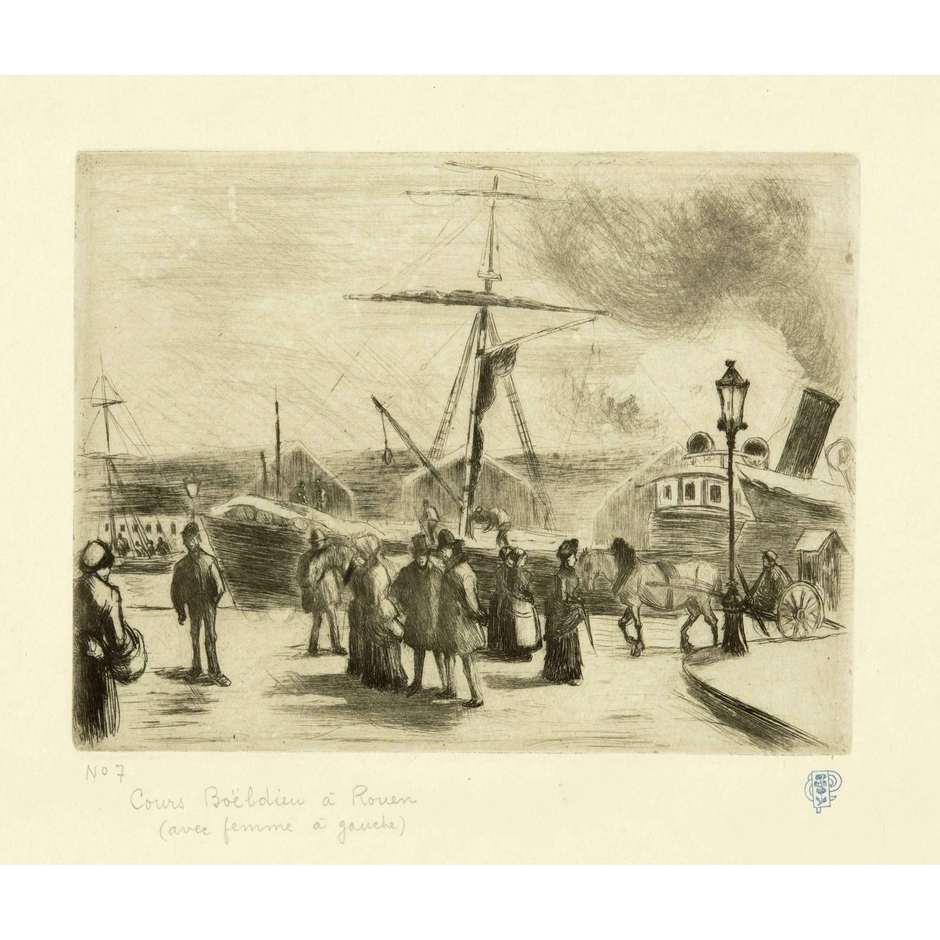 Unten rechts mit dem frühen Monogrammstempel "CP", links nummeriert "N° 7", darunter in Bleistift mit dem Titel "Cours Boëldieu à Rouen / (avec femme à gauche)"