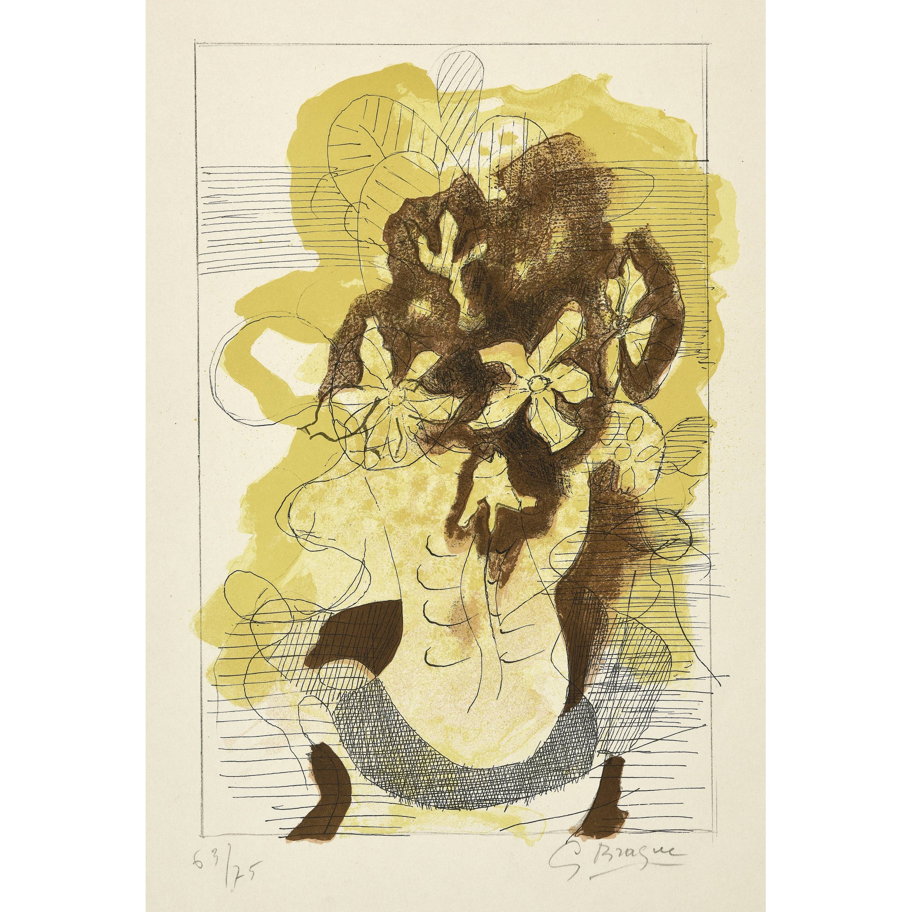 Enthalten sind: Georges Braque. Jonquillles. Interpretationsgraphik nach Braque. 1955-1960. - Raoul Dufy. Versailles. Farbige Lithographie. 1953. - Alfred Manessier. L’Offrande. Farbige Lithographie. 1955. Jacometti LNJ 498. - Georges Rouault. Dame du haut quartier croit prendre pour le ciel place réservée (aus Miserere). Heliogravur. 1922. Rouault 69/b. - Georges Rouault. Confidences ou Tête-à-tête (aus Grotesques). Lithographie. 1926/27(?). Rouault 339/I (v.II). - Georges Rouault. Le Clown jaune (aus Cirque). Farbige Radierung. 1930. Rouault 204. - Edouard Vuillard. Lisez la revue blanche. Une nuit d’avril à Céos, l’image. Lithographie. 1894. Roger-Marx 22/2/II