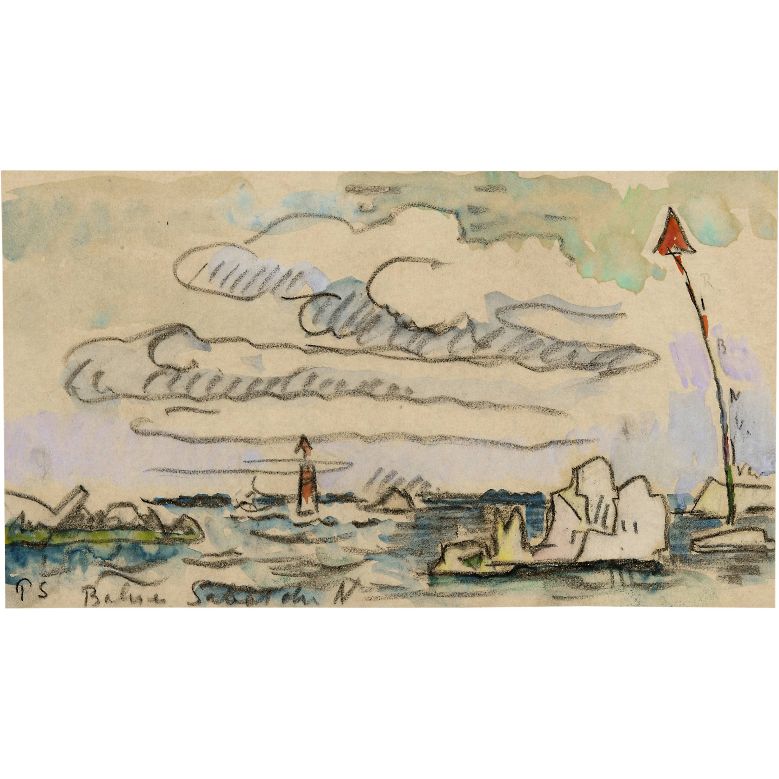 Signac verbrachte seine Sommer von 1923 bis 1930 in Lézardrieux in der Bretagne, wo er die maritime Landschaft in mehreren Aquarellen festhielt. Dargestellt ist eine Ansicht des sich in den Ärmelkanal ergiessenden Flusses Trieux mit seinen charakteristischen Felsformationen und Bojen. Wir danken Marina Ferretti für die Informationen zum Werk