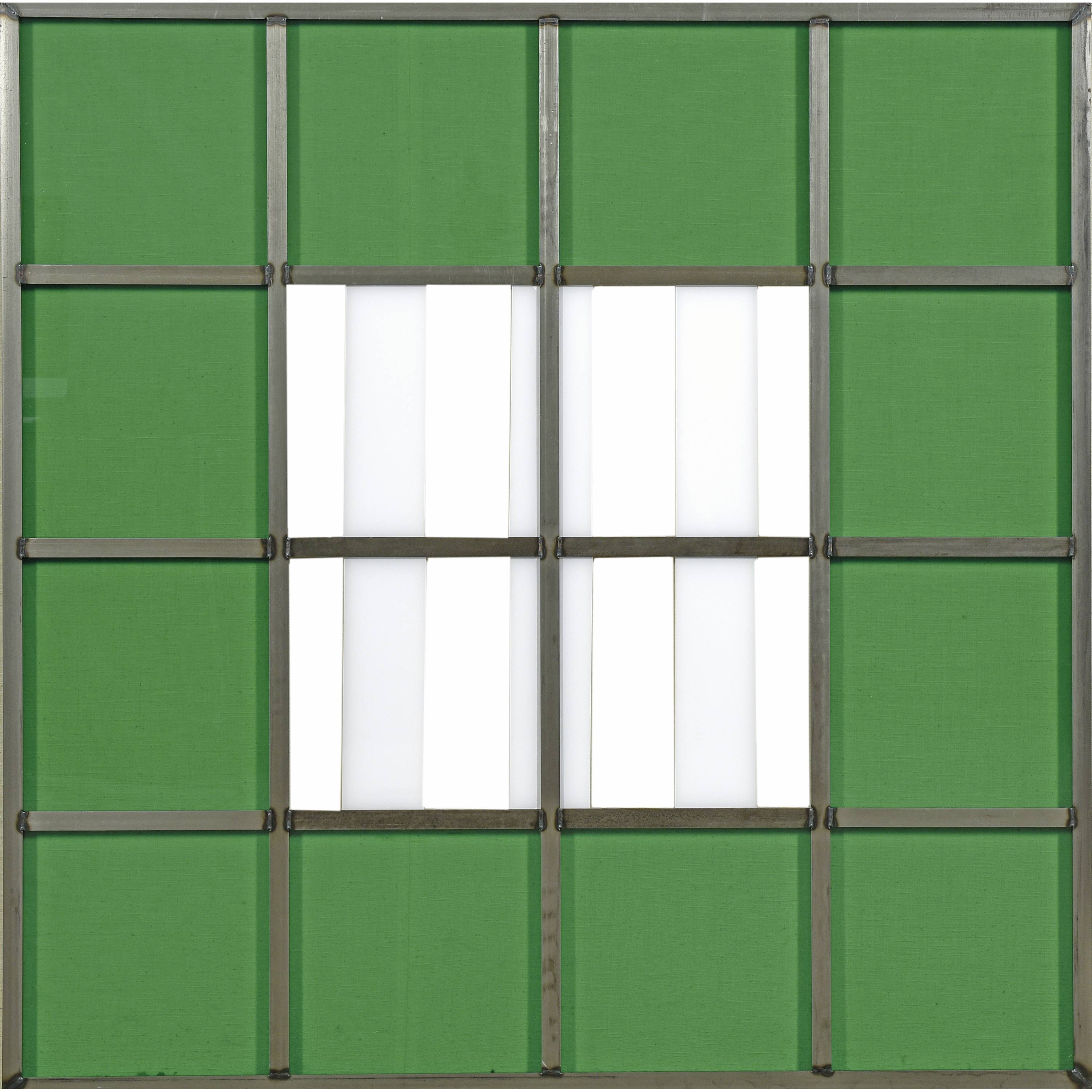 Stahlrahmen, Plexiglasscheiben, Transparentfolie in Grün, weisse Klebefolie