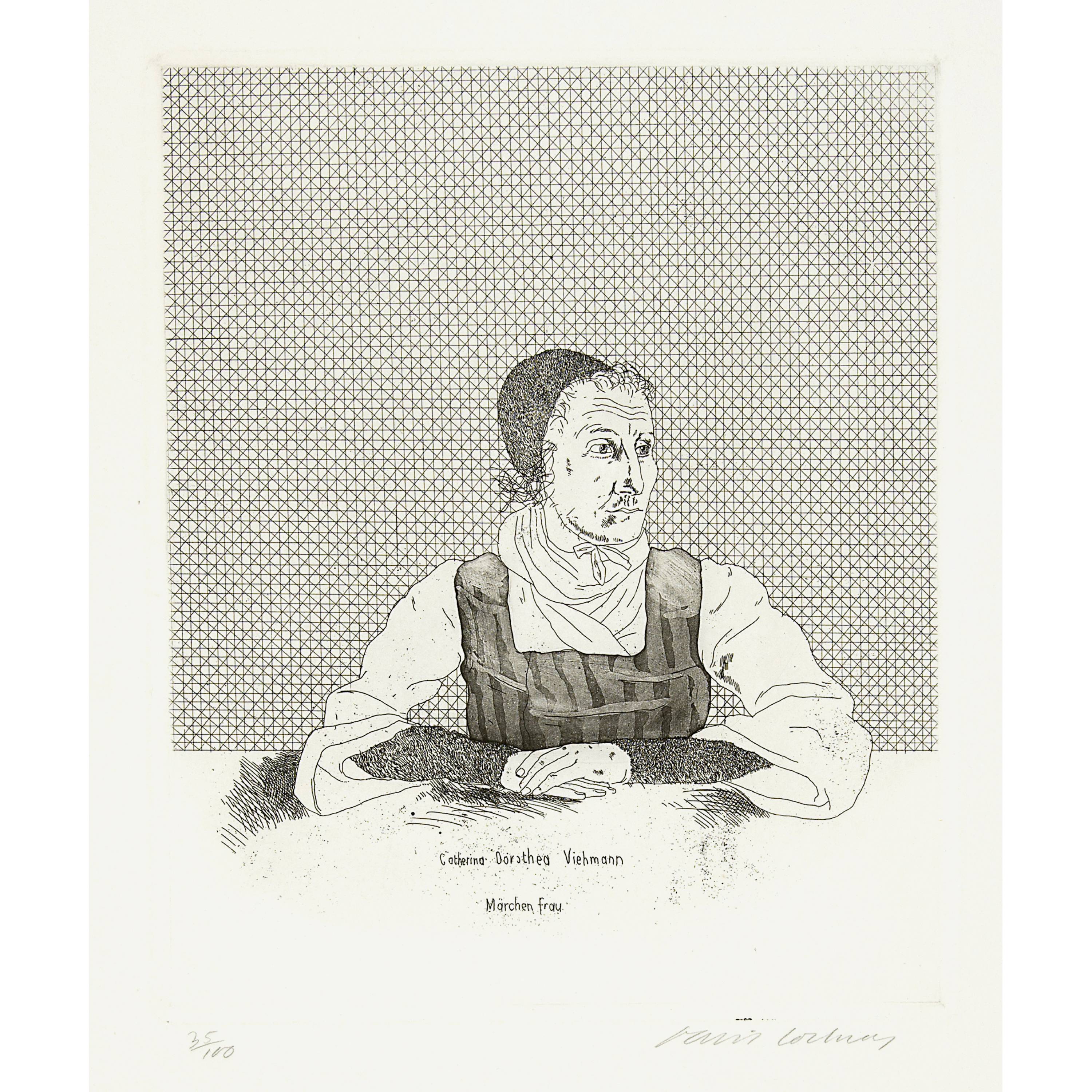 Dabei: Six Fairy Tales from the Brothers Grimm with original etchings by David Hockney. London, Petersburg Press, 1970. 11x7,5 cm. Texte der Märchen und Reproduktionen der Radierungen in einem Minibuch. - Zus. 2 Radierungen und 1 Publikation
