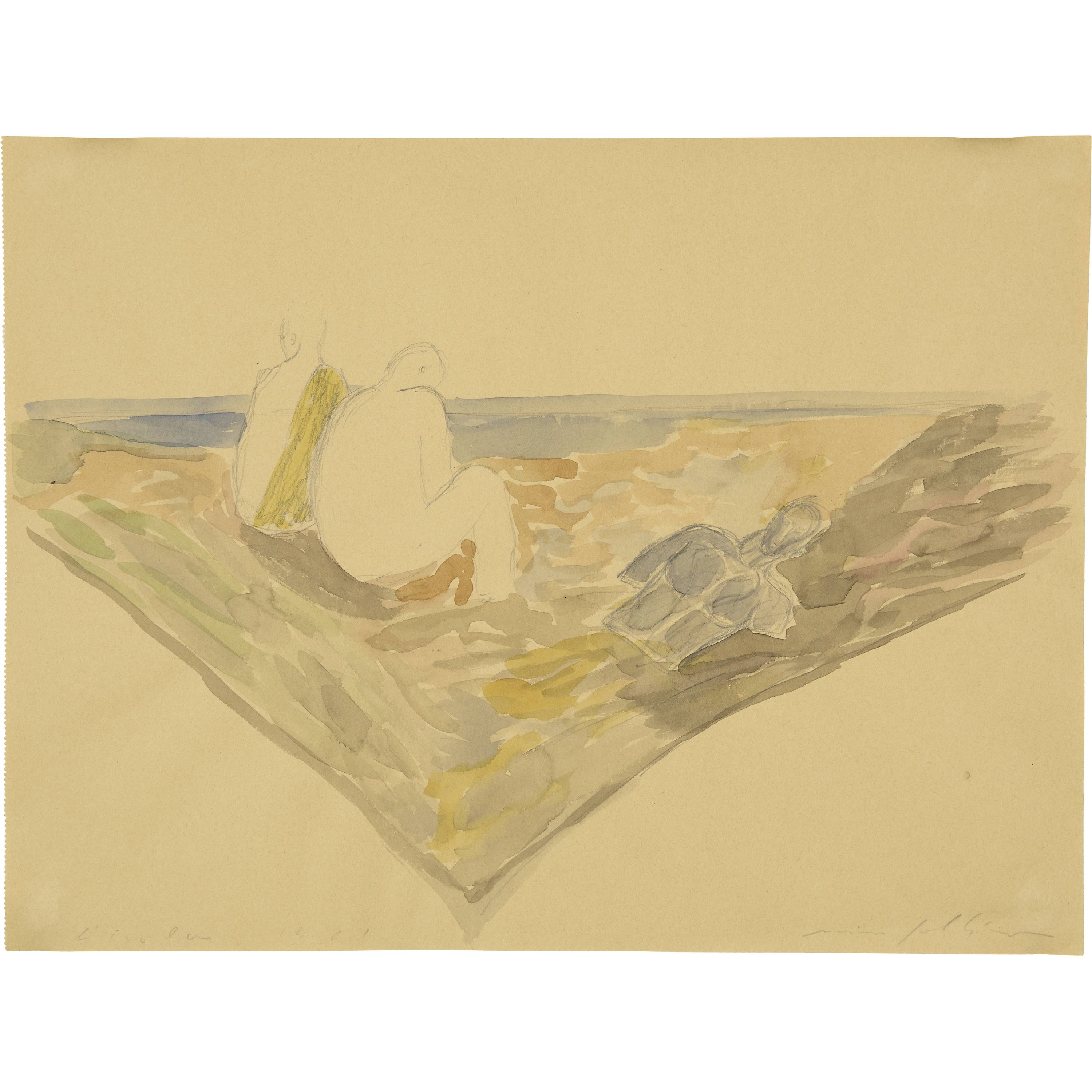 Feine, farblich ausgewogene Zeichnung mit zwei sitzenden Figuren und einem Torso am Strand - der Titel "L'isola" suggeriert die Einsamkeit und Abgeschiedenheit der Dargestellten