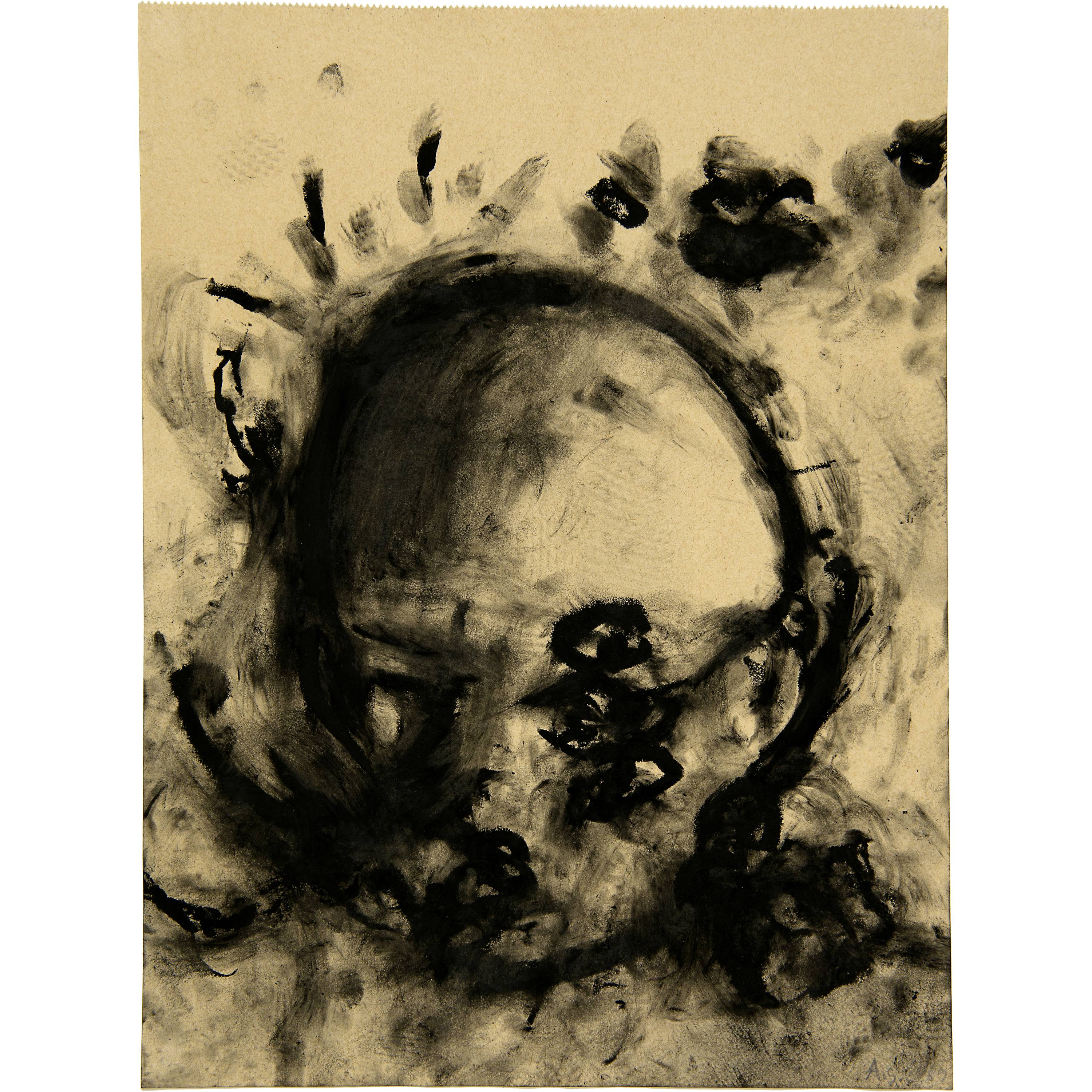 Typisch für eine Serie von Kohlearbeiten auf Papier, die Köpfe erahnen lassen und wohl mit kreisenden, schnellen Bewegungen ausgeführt worden sind. Entstanden während Schniders Aufenthalt in Follonica in Italien 1989/1990, wo er sich in ein leer stehendes Landgut zum Zeichnen zurückzog