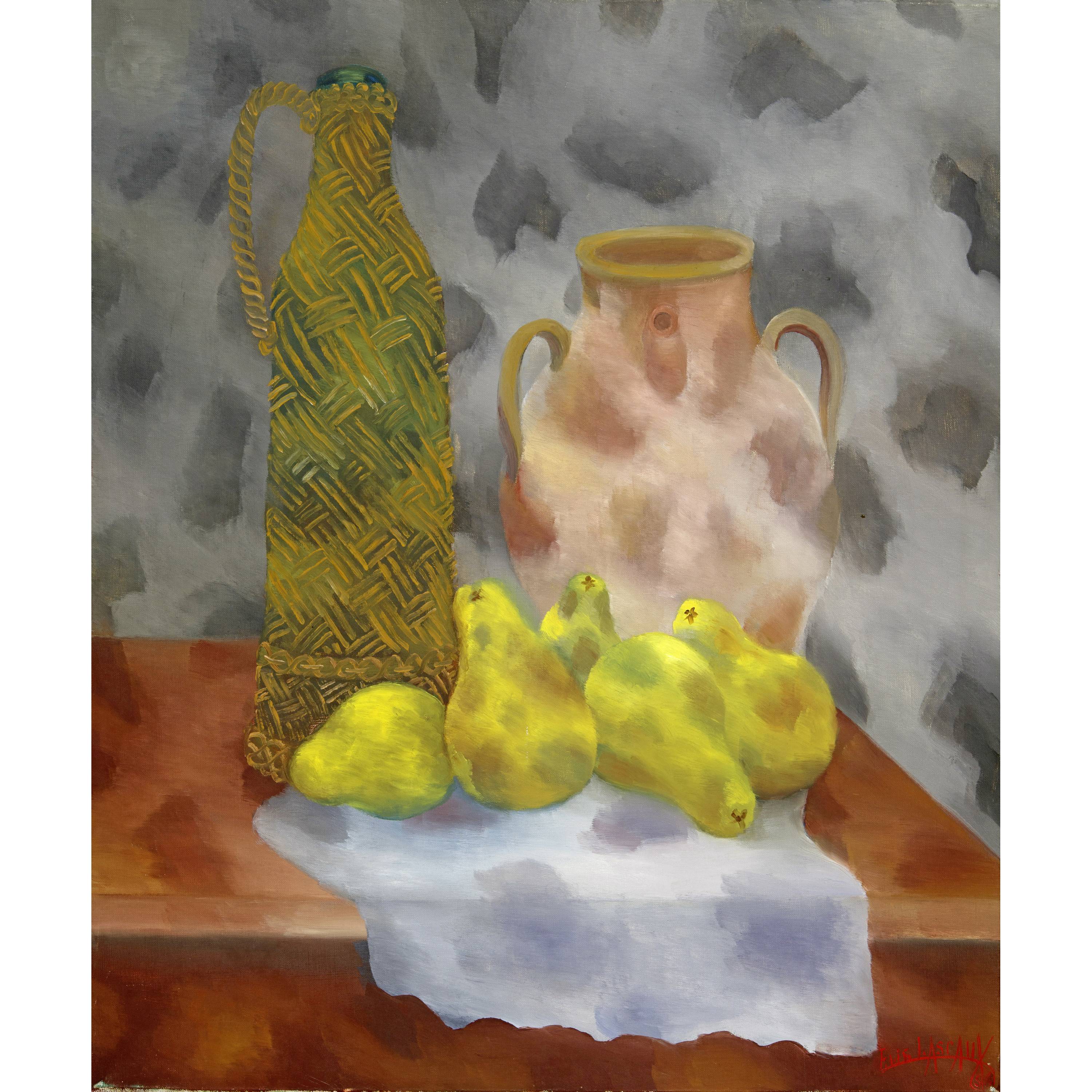 Unten rechts vom Künstler in Rot signiert "Elie Lascaux / 56", rückseitig auf der Leinwand mit dem vollen Titel "La Bouteille / d'Osier" und nochmals signiert und datiert