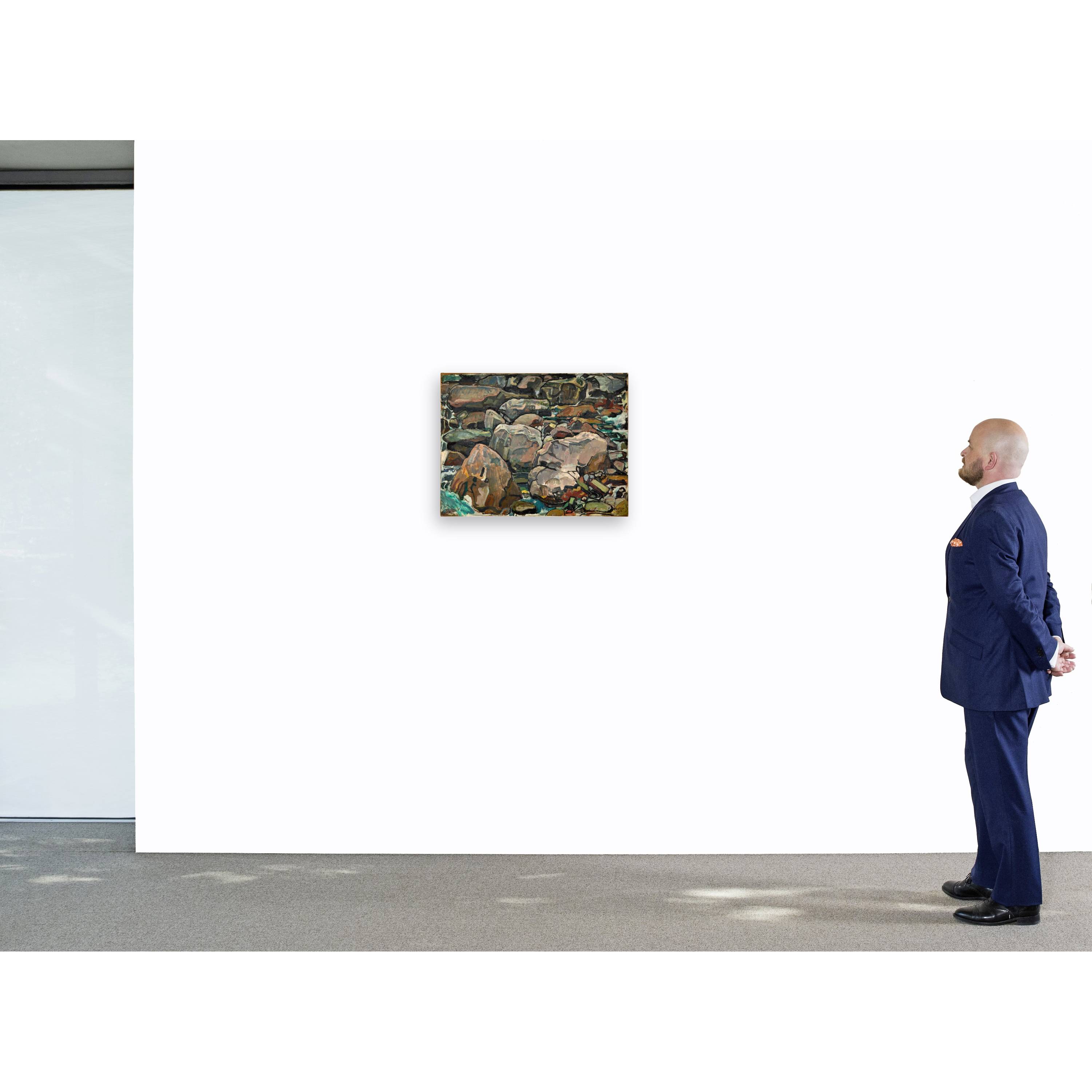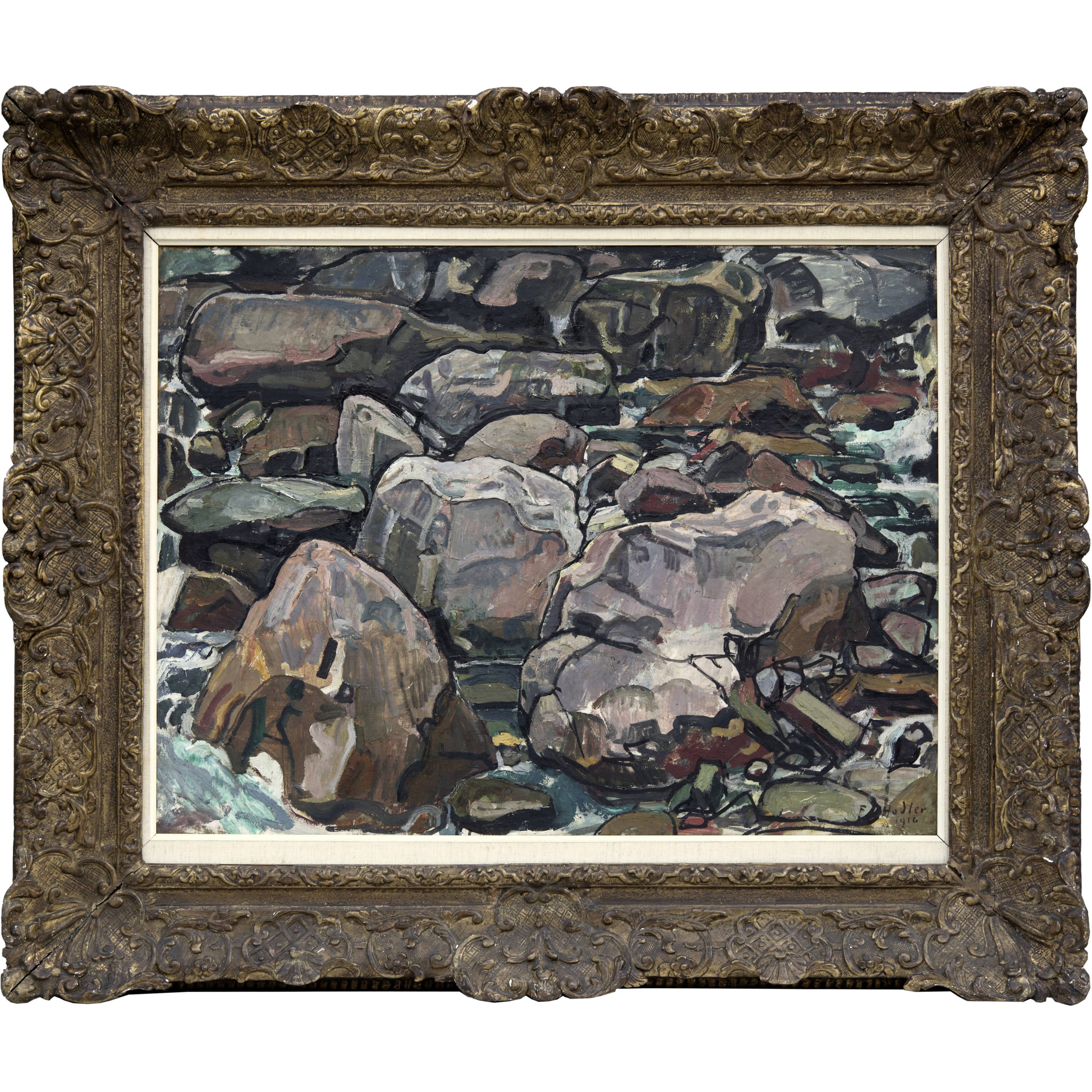 Ferdinand Hodler hielt sich vom Juni bis September 1916 in Champéry auf, eine waldige Gegend reich an Bachläufen, wo er seine Ehefrau Berthe und seine Tochter Paulette besuchte, die die Sommermonate dort verbrachten. Er beschäftigte sich intensiv mit der Landschaft und schrieb an Gertrud Müller am 23.8.1916: "[...] von Morgens früh bis Abends landschafte ich [...]." So entstanden mehrere Bergansichten und Bachbilder. "Bergbach bei Champéry" gehört zu der spannenden Serie, in der der Bachlauf zum Hauptmotiv wird. Die Bilder zeichnen sich speziell durch die Wahl des engen Bildausschnittes in extremer Nahsicht aus, was sie von den früheren Bachlandschaften Mitte der 1870er Jahre unterscheidet, wo er das fliessende Wasser aus der Ferne darstellte. Die verschiedenen Gesteinsformationen und das Spiel des Wassers werden nun zum bestimmenden Bildgegenstand. Mit der Gegenüberstellung von Wasser und Stein drückte der Künstler die unterschiedlichen Eigenschaften der beiden Naturelemente wie Bewegung und Ruhe, Flüssig- und Festigkeit aus. Der Bach sucht sich seinen Weg vom oberen Bildrand zwischen wuchtigen Gesteinsbrocken zum unteren. Die mehrheitlich in grauen und braunen Farbtönen gehaltenen Gesteinsblöcke dominieren die Komposition, während vom eigentlichen Wasserlauf nur ein kleiner Ausschnitt am linken unteren Bildrand wirklich sichtbar wird. Der vielseitige Farbauftrag mit Pinsel, Spachtel und Fingern verleiht dem Gestein eine grosse Plastizität und dem Wasser eine quirlige Lebhaftigkeit, wobei Hodler das Darzustellende oft nur andeutet und es so beinahe abstrakt und sehr modern wirkt