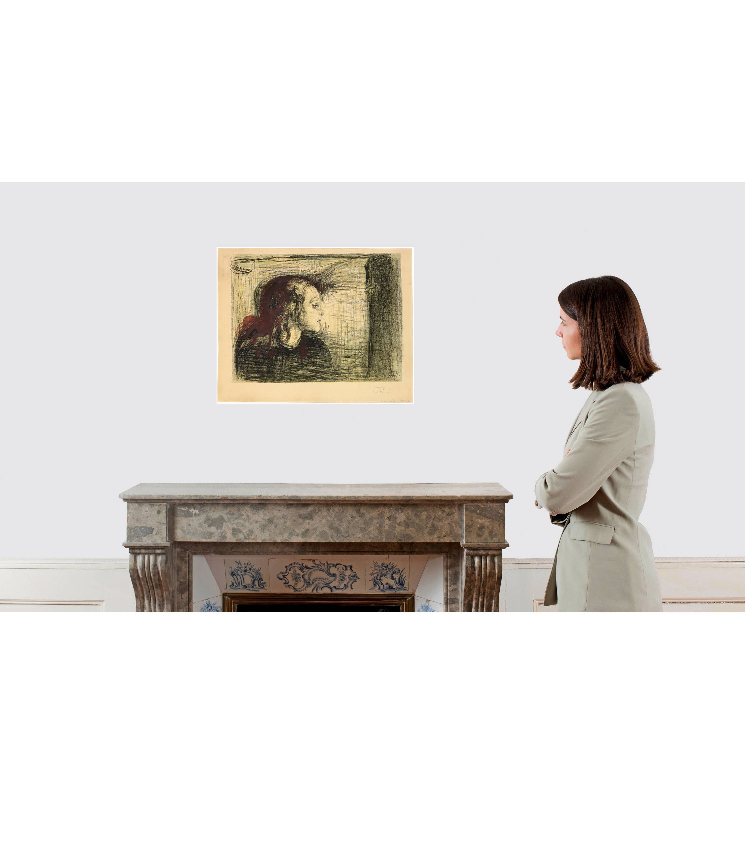 "Das kranke Kind" (norwegisch: "Det syke barn") ist eine thematische Gruppe von sechs Gemälden und einer Reihe von Lithographien, Kaltnadelarbeiten und Radierungen, die der norwegische Künstler zwischen 1885 und 1926 schuf. Alle halten in ähnlicher Manier einen Moment vor dem Tod seiner älteren Schwester Johanne Sophie (1862–1877) fest, die mit fünfzehn Jahren an Tuberkulose starb. Munch kehrte in seiner Kunst immer wieder zu diesem für ihn zutiefst traumatischen Ereignis zurück. Während bei den Gemälden Sophie auf dem Sterbebett mit einer trauernden Frau an der Seite gezeigt wird, hat er für die hier angebotene und berühmteste graphische Version des Motivs bloss die Kopf- und Brustpartie auf dem Kissen festgehalten. Das blasse Mädchen schaut leer und leidend seiner ungewissen Zukunft entgegen, Munch fängt den Moment mit grosser Sensibilität und Einfühlung ein. Sehr fein nuancierter Druck in den vier Farben Schwarz, Grüngrau, Gelb und Rot.