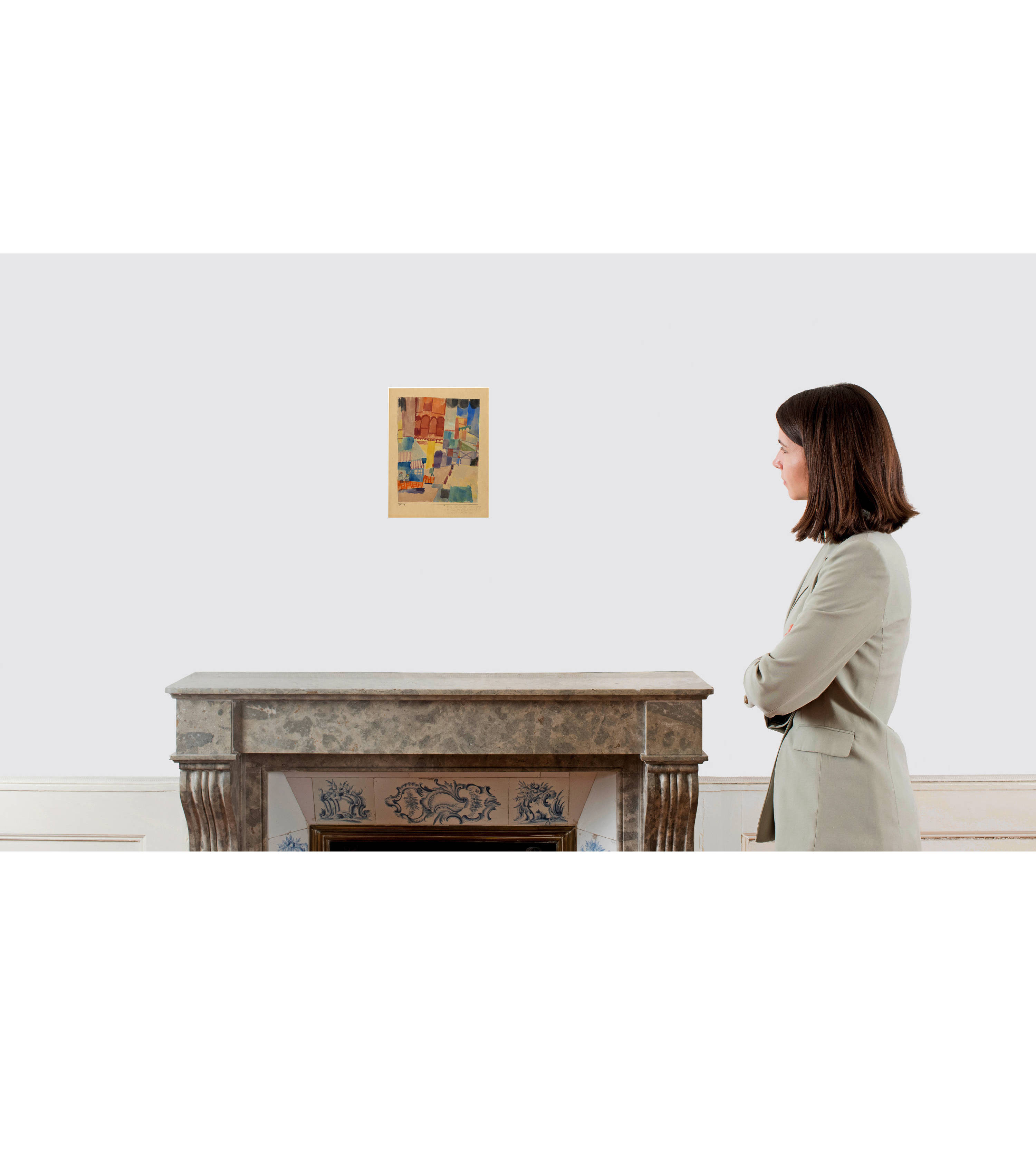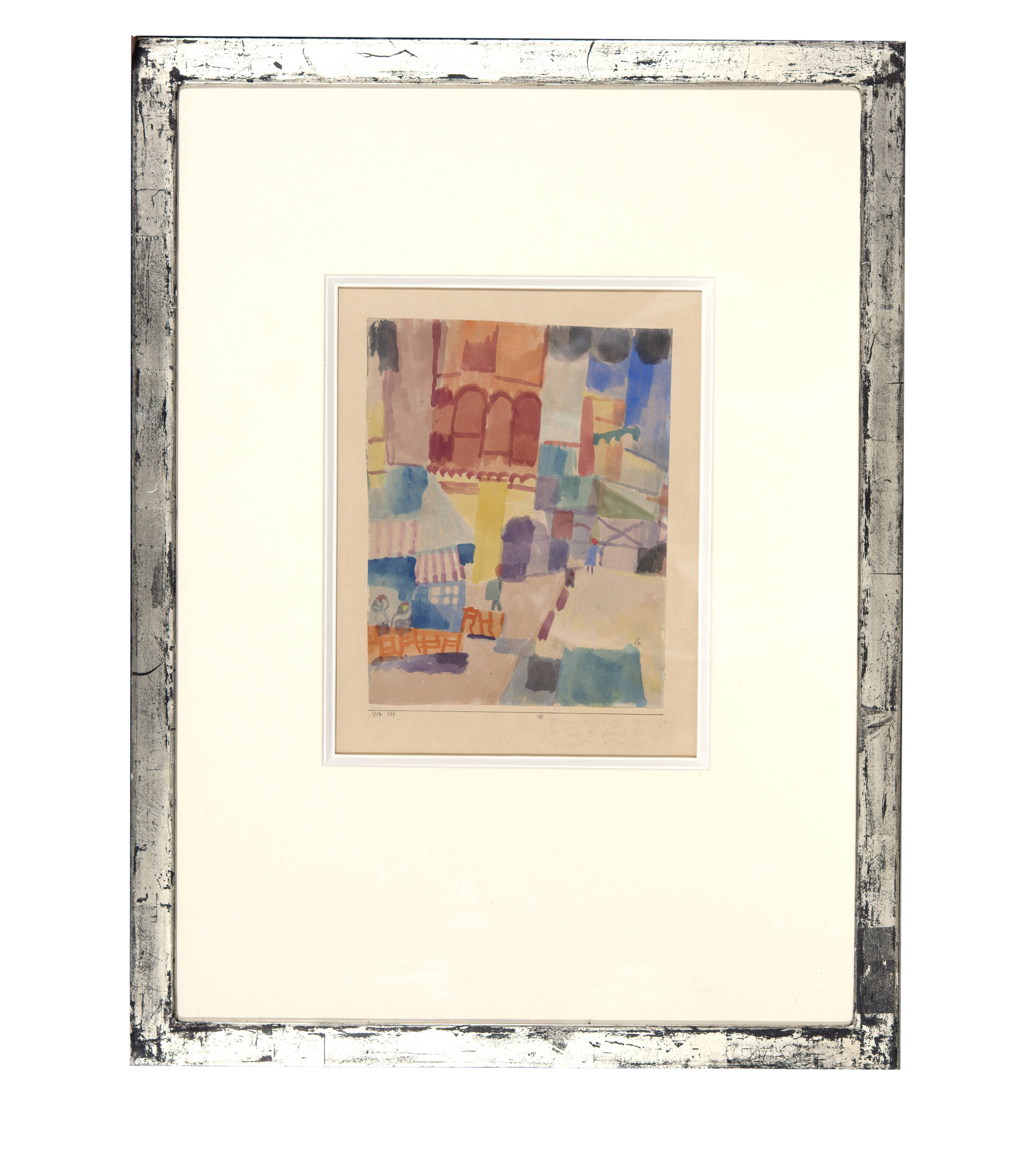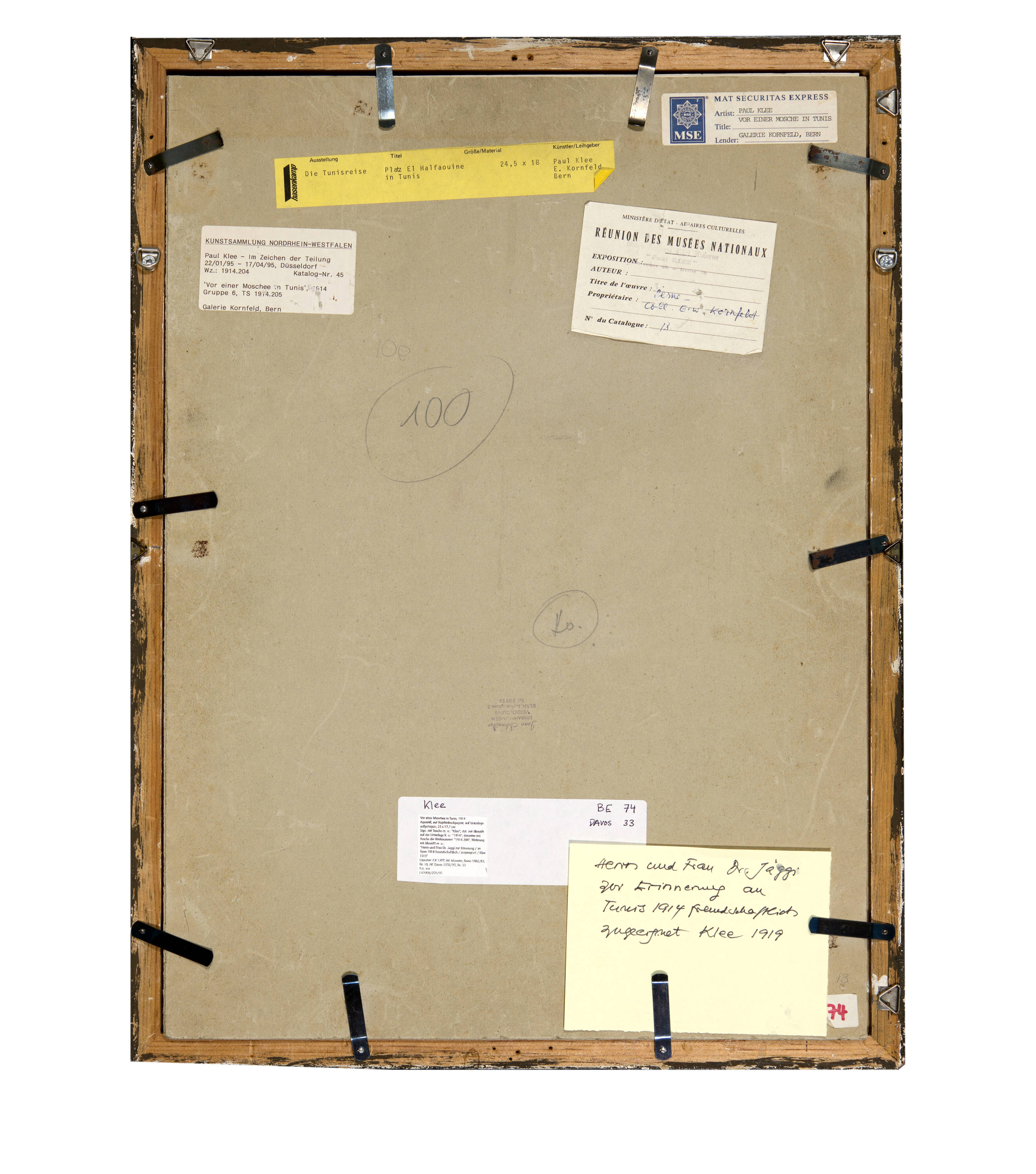 Das hier angebotene Blatt war zuerst grösser angedacht. Paul Klee zerschnitt es später, wie er es immer wieder tat, und schuf aus dem rechten Teil das Werk mit der Nummer 1914.205, "Ohne Titel" (Catalogue Raisonné 1308), ein Blatt, das sich heute in einer amerikanischen Privatsammlung befindet. Dargestellt ist eine Szene vor einer Moschee am Platz El Halfaouine in Tunis. Das Aquarell ist sicherlich auf der Reise vor Ort entstanden und wurde später von Klee neu montiert. Im Sommer 1919 schenkte er das Blatt dem Ehepaar Jäggi, wohl immer noch aus Dank für die herzliche Aufnahme in ihrem Haus in Tunesien. Ein besonders eindrückliches Zeugnis seines Schaffens unter Einfluss der Tunisreise.