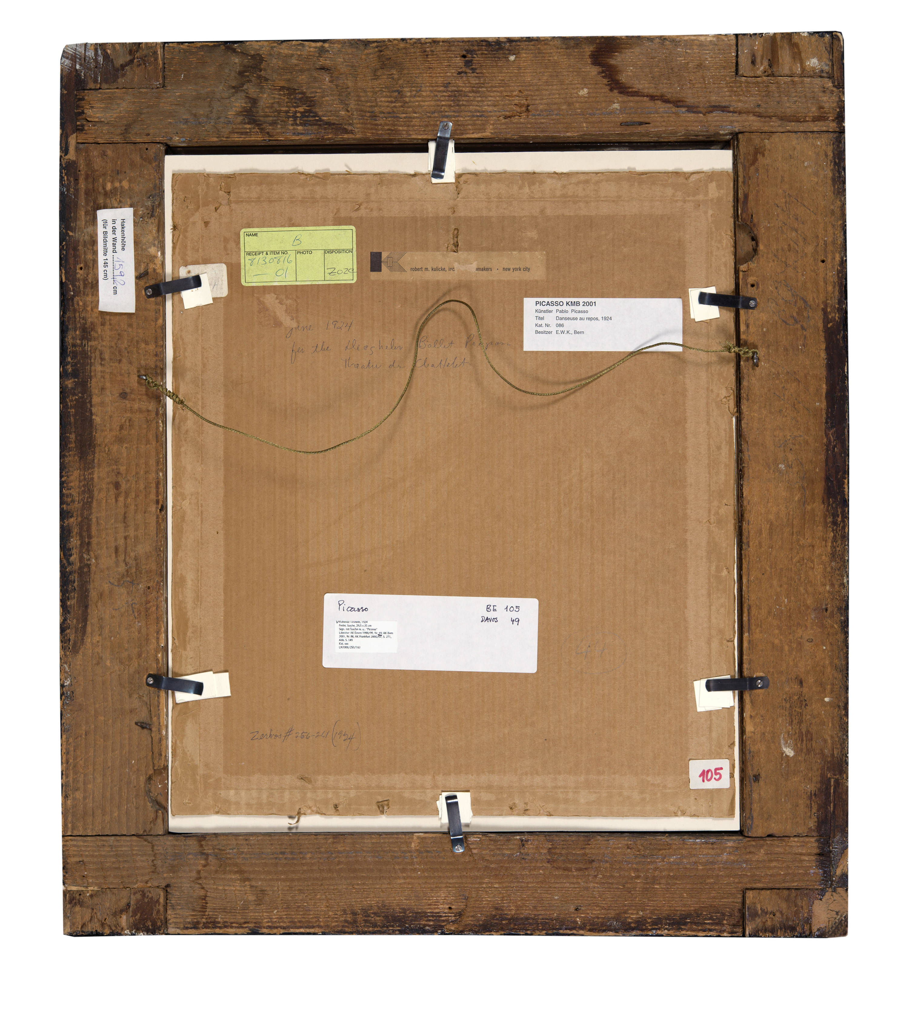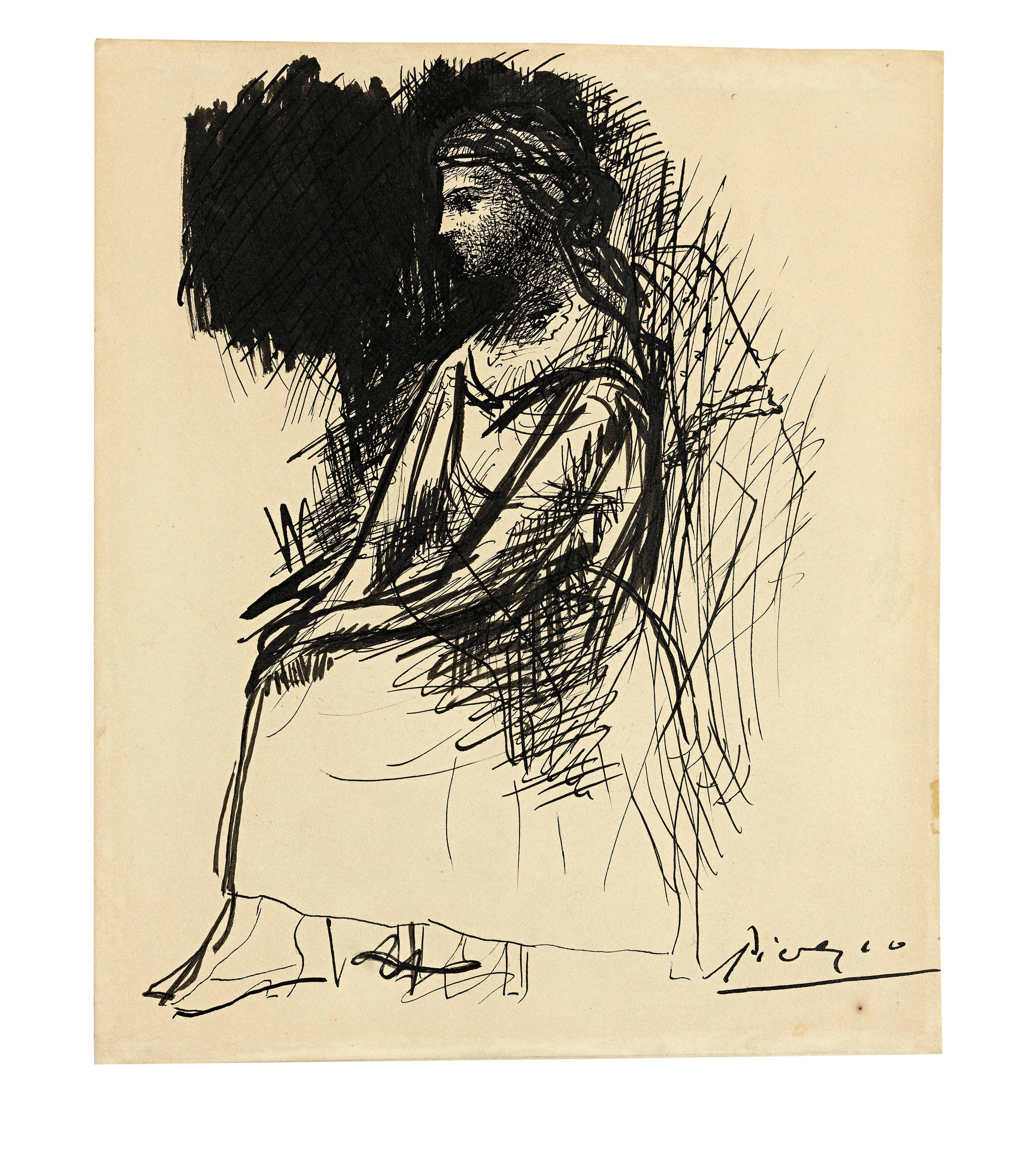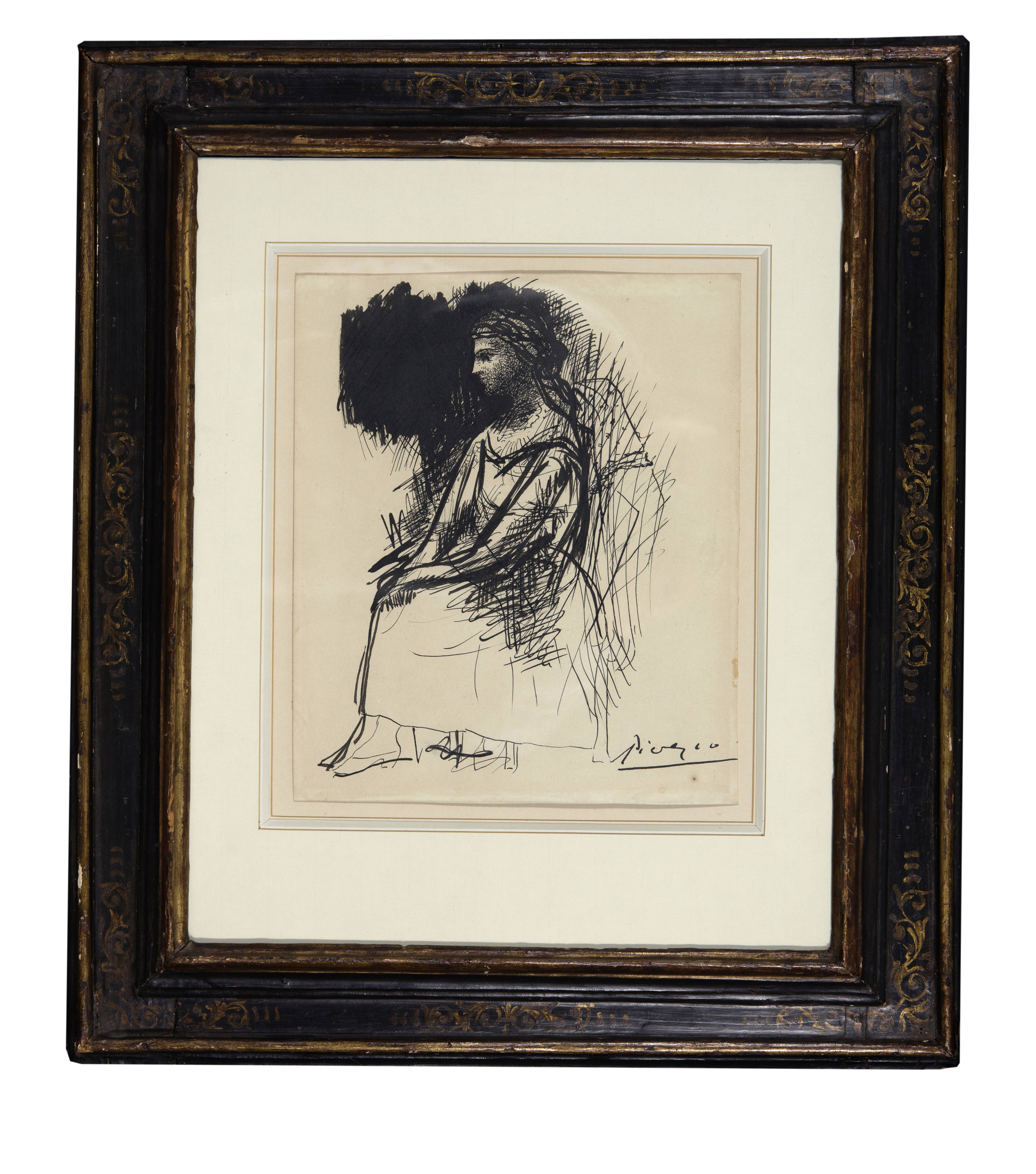 Die hier angebotene Zeichnung könnte die Tänzerin Vera Petrova darstellen, trug sie doch in der Produktion häufig auffällig geflochtenes Haar. Andererseits erinnert die Umsetzung auch an Darstellungen seiner Ehefrau Olga aus derselben Zeit, die er auch immer wieder als Tänzerin darstellte. Die Zeichnung lebt vom freien Duktus der Linien; es scheint, als ob Picasso die Figur aus einem Liniengewirr herausarbeitete und wachsen liess.