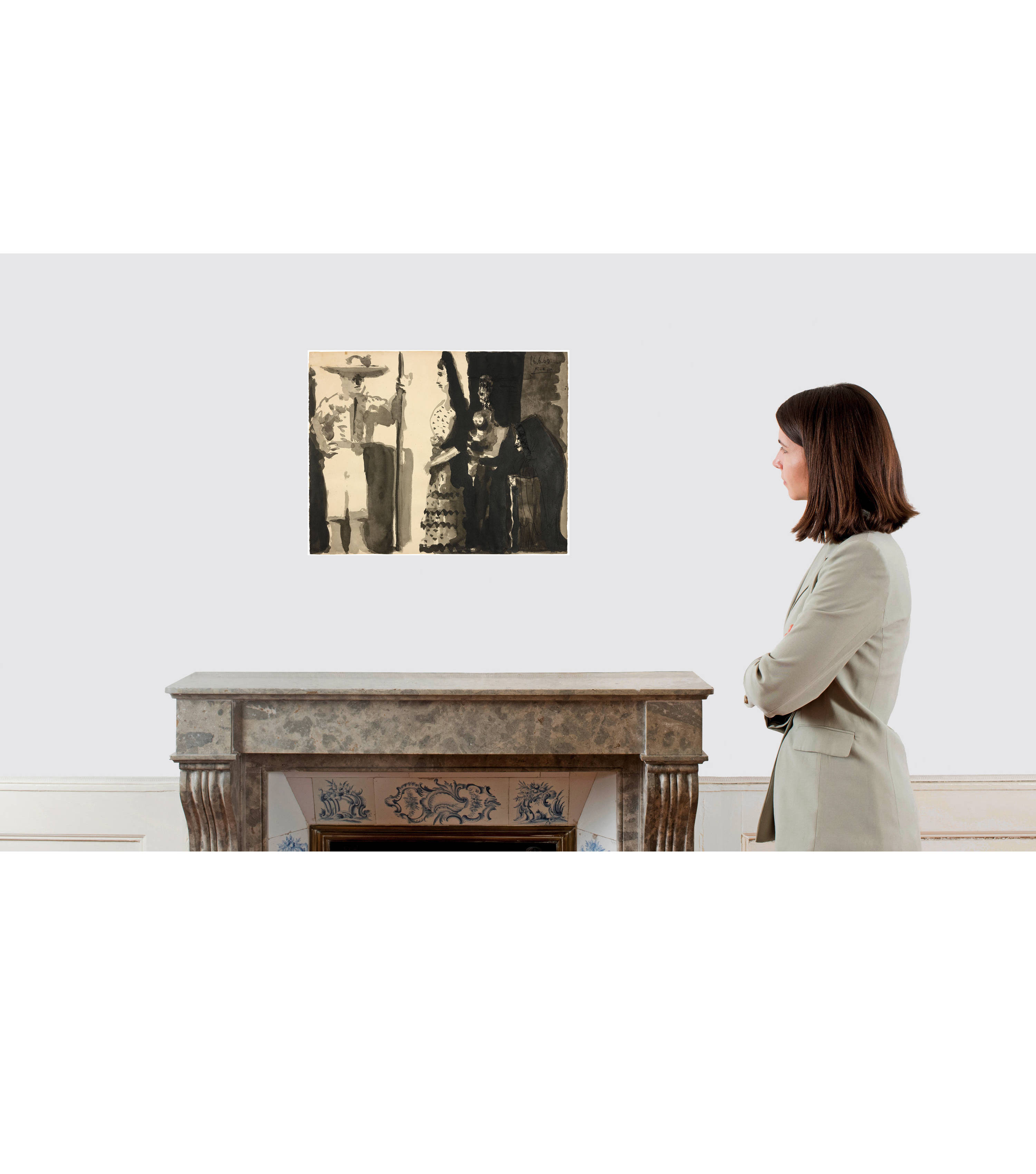 Der Stierkampf repräsentierte Picassos neu erwachtes Interesse am Machismo, ein wichtiges Thema, das sein Spätwerk prägen sollte. So fungierten der Matador oder, wie hier dargestellt, der Picador als Inbegriffe von Männlichkeit und Tapferkeit, quasi als jugendliches Alter Ego des alternden Künstlers. Das vorliegende Blatt gehört zu einer Serie ähnlicher Zeichnungen, die 1960 in der Galerie Louise Leiris ausgestellt wurden. In den Zeichnungen geht es oft auch um Erotik – etwa in der Gestalt von jungen Frauen und Kupplerinnen. Die grossformatige Pinselzeichnung ist ein sehr schönes Beispiel für Picassos meisterhafte Chiaroscuro-Arbeiten.