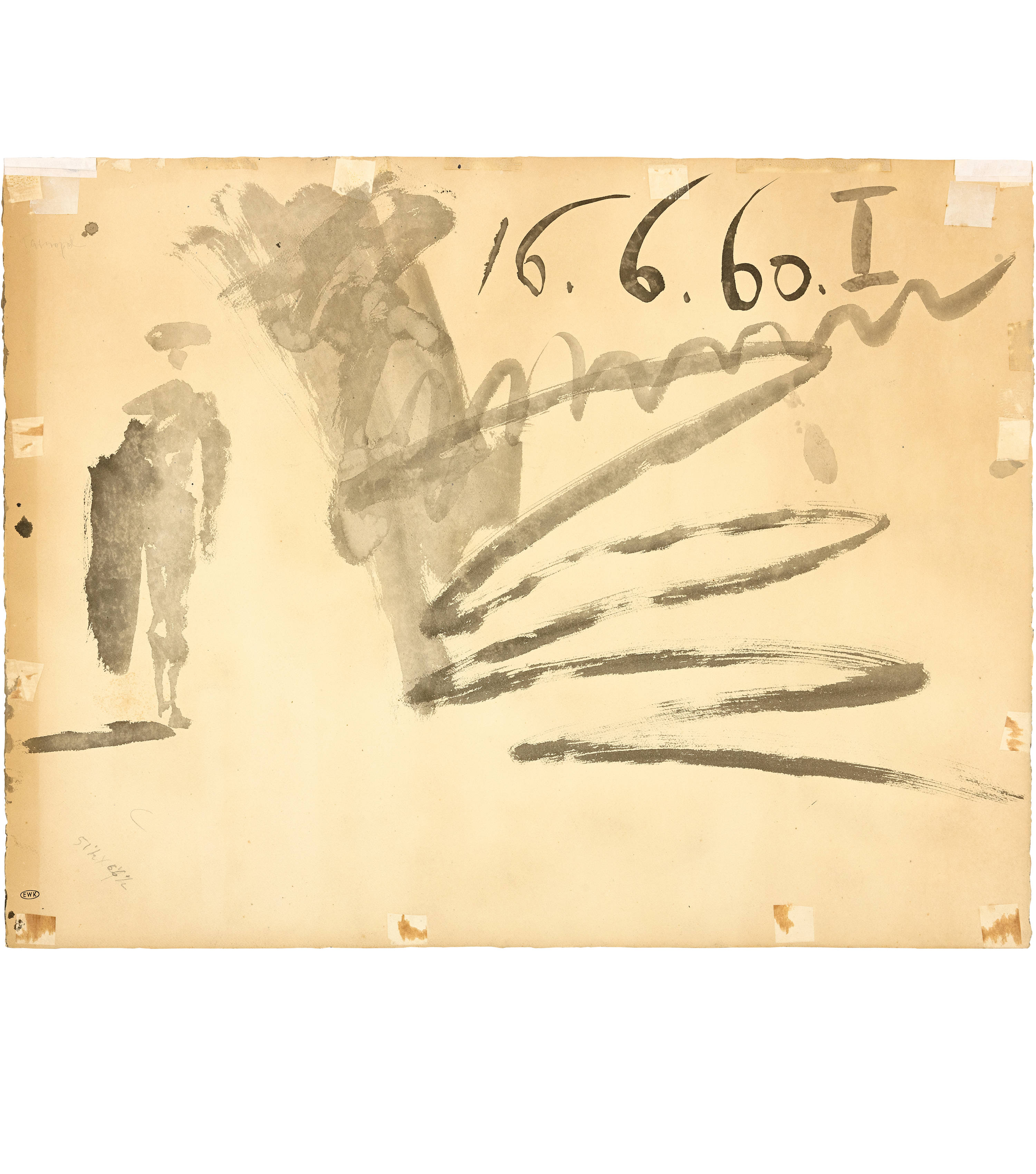 Oben rechts vom Künstler in Tusche datiert, bezeichnet und signiert "16.6.60.I / Picasso". Auf der Rückseite nochmals datiert "16.6.60. I"