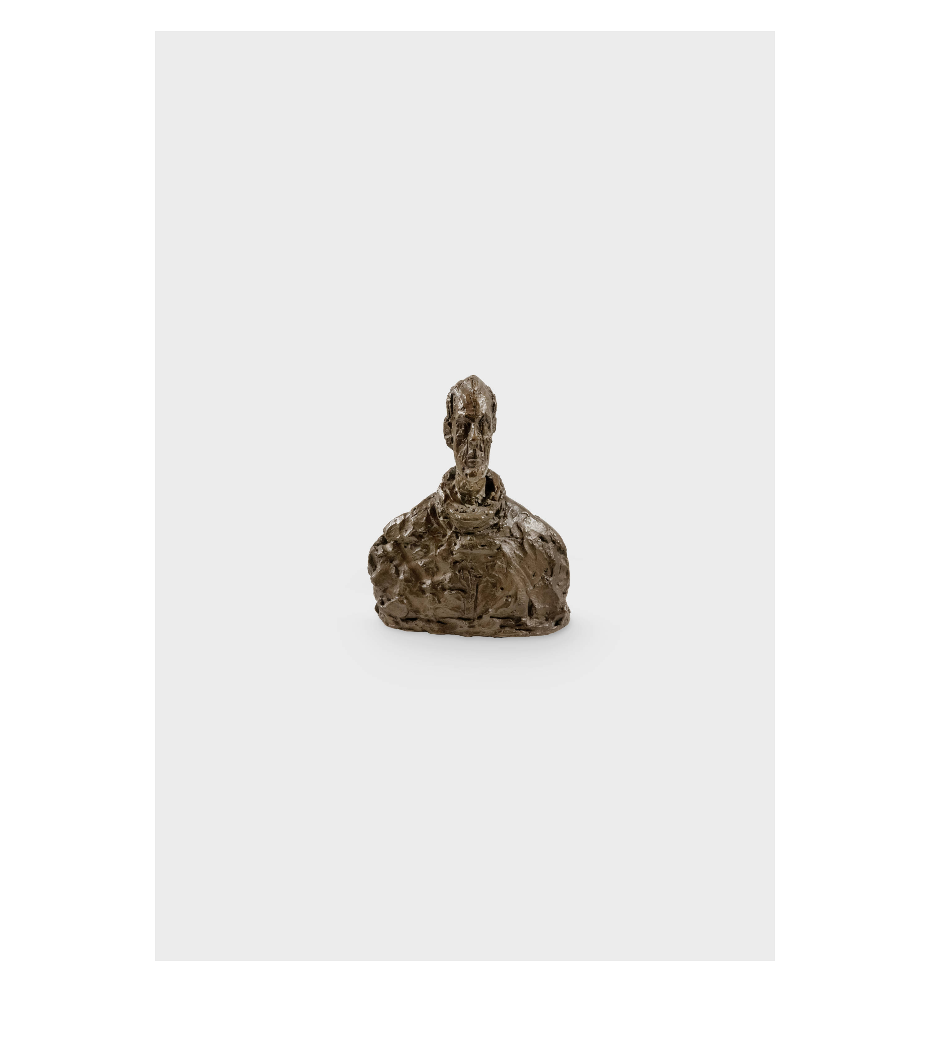 Der in den Miniaturplastiken entwickelte Kontrast von kleinem Kopf mit massivem Sockel erzeugt auch in den Porträts der 1950er Jahre eine einzigartige Spannung. Der massige, in sich geschlossene Torso gibt der schmalen Frontansicht des Gesichts Sicherheit und Gewicht. Die frühe, in der Malerei und Zeichnung erprobte Idee einer Abflachung des Kopfes führte zu einer Fokussierung auf die entscheidenden Wesenszüge der porträtierten Person. In der hier angebotenen Bronze ist es einmal mehr sein Bruder Diego, der Modell sass. "D’après nature" will sagen, dass die vorliegende Plastik im Rahmen einer Porträtsitzung entstanden ist, was später nicht mehr immer der Fall war. Diego trägt einen Rollkragenpullover, was die Plastik formal in die Nähe der Porträtmalerei des 16./17. Jahrhunderts bringt. Die Büste wirkt sehr klassisch in der Komposition; minutiös sind die Merkmale seines Bruders herausgearbeitet. Die seitliche Abflachung des Kopfes führt zur Belebung der Vorderansicht des Gesichts: Das Profil zeigt so den gleichen und doch ganz anderen Diego.