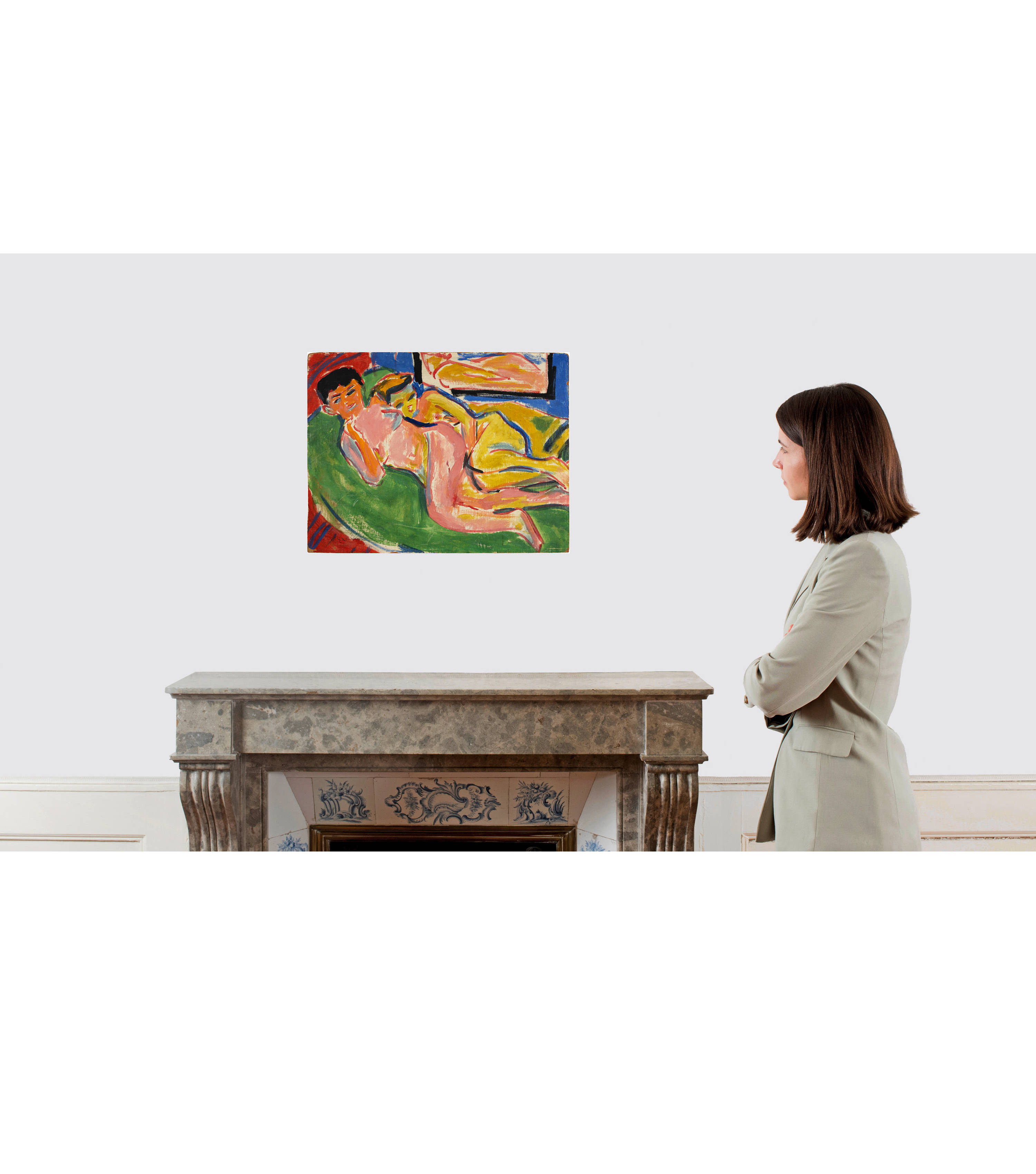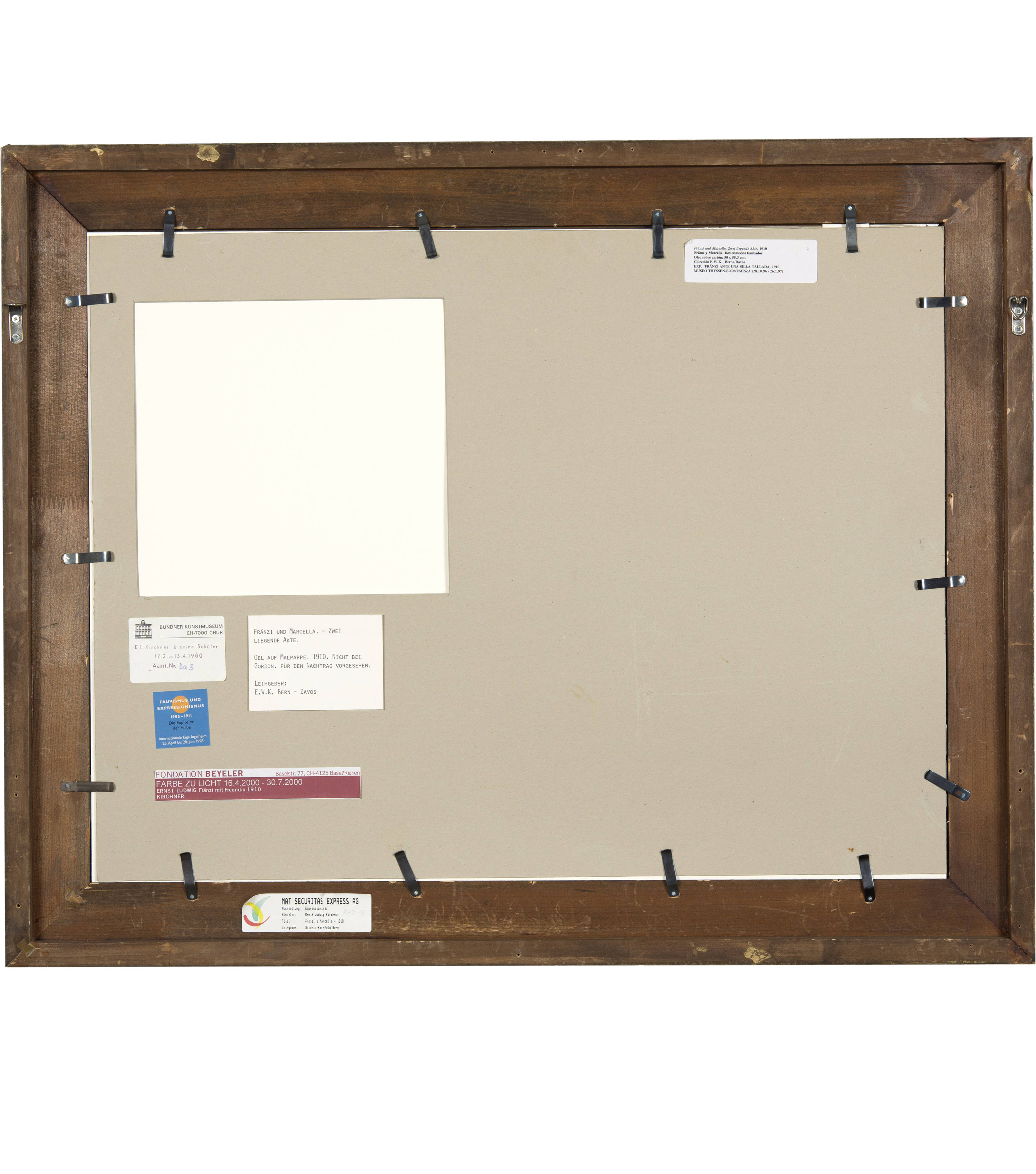 Das Gemälde wurde 1922 vom Arzt Wilhelm Bodenheimer im Kunstsalon von Ludwig Schames in Frankfurt am Main erworben. Es ist anzunehmen, dass das hier angebotene Werk in der grossen Ausstellung von Werken Ernst Ludwig Kirchners vom 22. Januar bis 28. Februar mit 37 Gemälden, 49 Zeichnungen und Graphiken unter der Nummer "36" vertreten war. Für die Ausstellung spricht auch die Preisangabe von 2500 Mark auf der Rückseite des Werkes, ein Ansatz, der der beginnenden Inflationszeit entspricht. Ursprünglich war das Bild auf der rechten Seite einige Zentimeter grösser. Durch den Beschnitt ist die rückseitige Beschriftung leicht verkürzt. Der Karton und die Maltechnik sind vergleichbar mit dem Gemälde "Frau mit schwarzen Strümpfen" von 1909 (Gordon 80). Für dieses Werk dienten Fränzi und Marcella als Modelle, die die Brücke-Künstler wohl im Herbst 1909 kennenlernten.