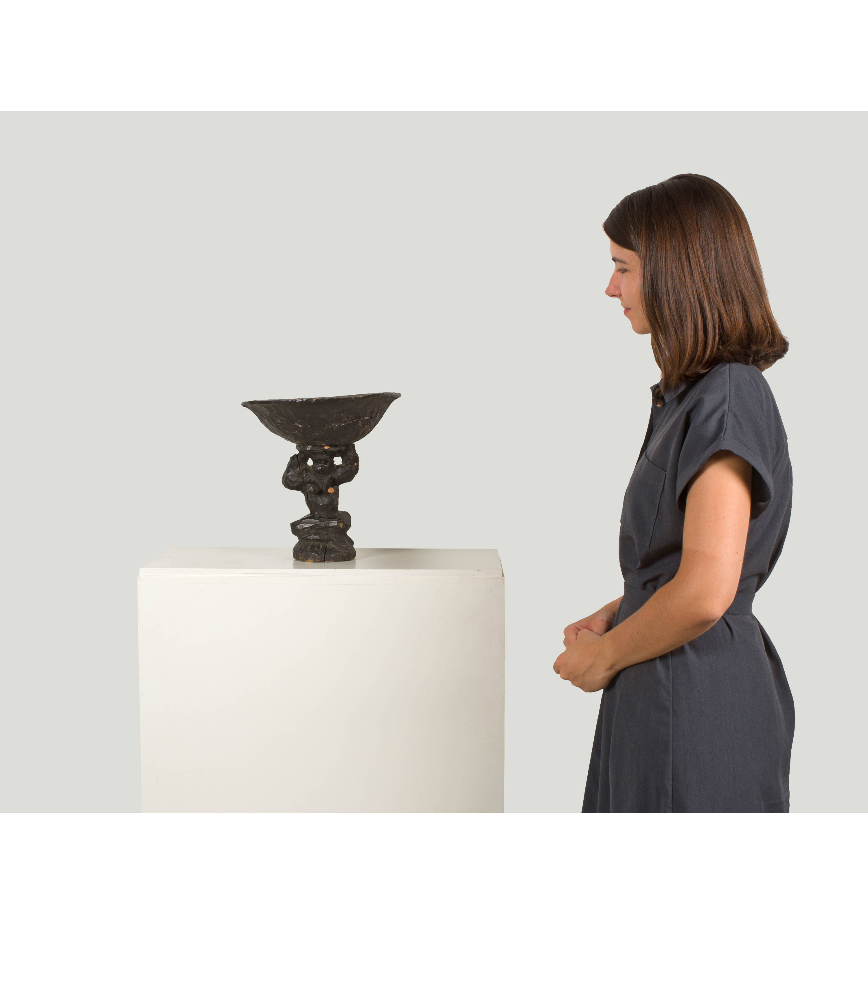 Die Schüssel: mit Spuren von Gips. Mit einem grossen, horizontalen und einem kurzen, vertikalen Riss im Holz, mit Gips alt, wohl vom Künstler ausgebessert, verstrichen und Schwarz gefasst. Der Sockel: am linken Busen der Figur mit einer Fehlstelle. Am Aufsatz für die Schale mit Holzverlust, am linken Figurenarm sowie an anderen Stellen stark berieben, am Sockel mit mehreren Schwundrissen im Holz. In guter Gesamterhaltung.