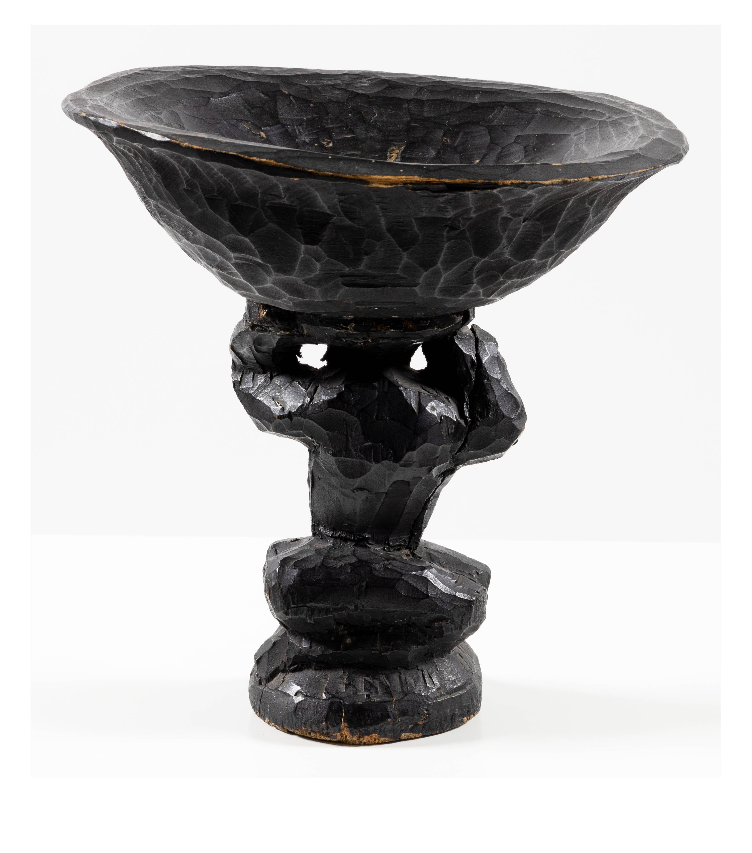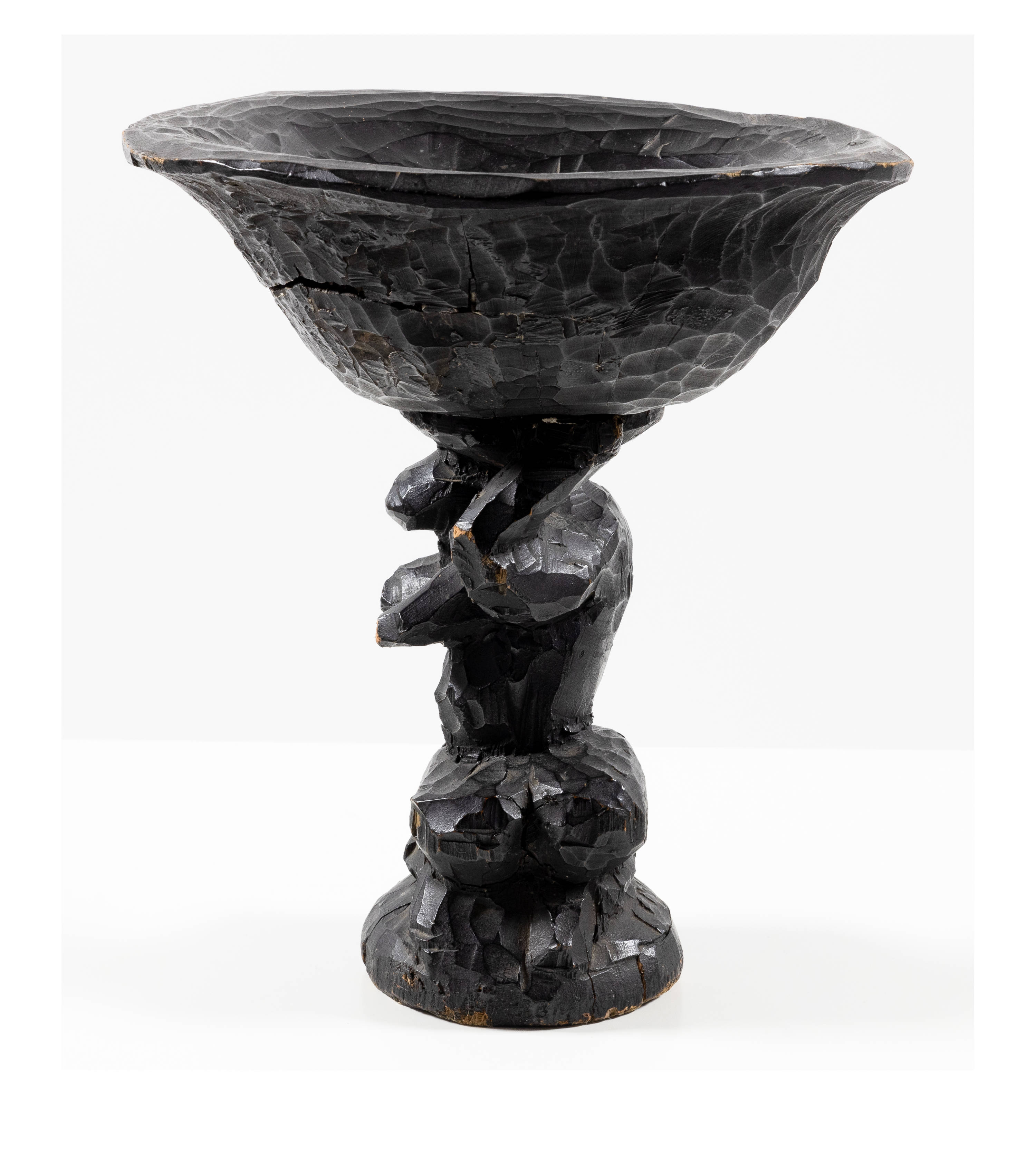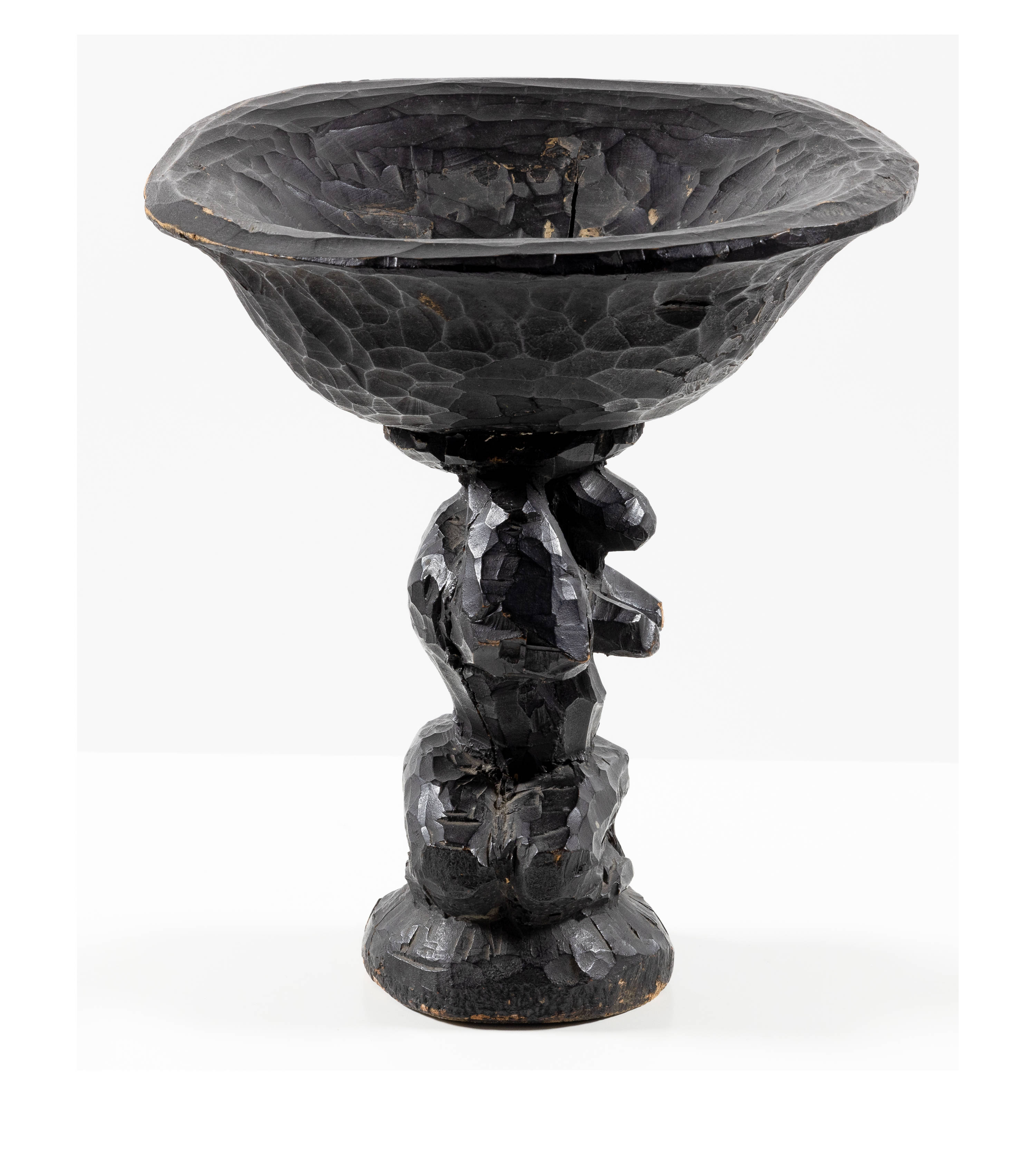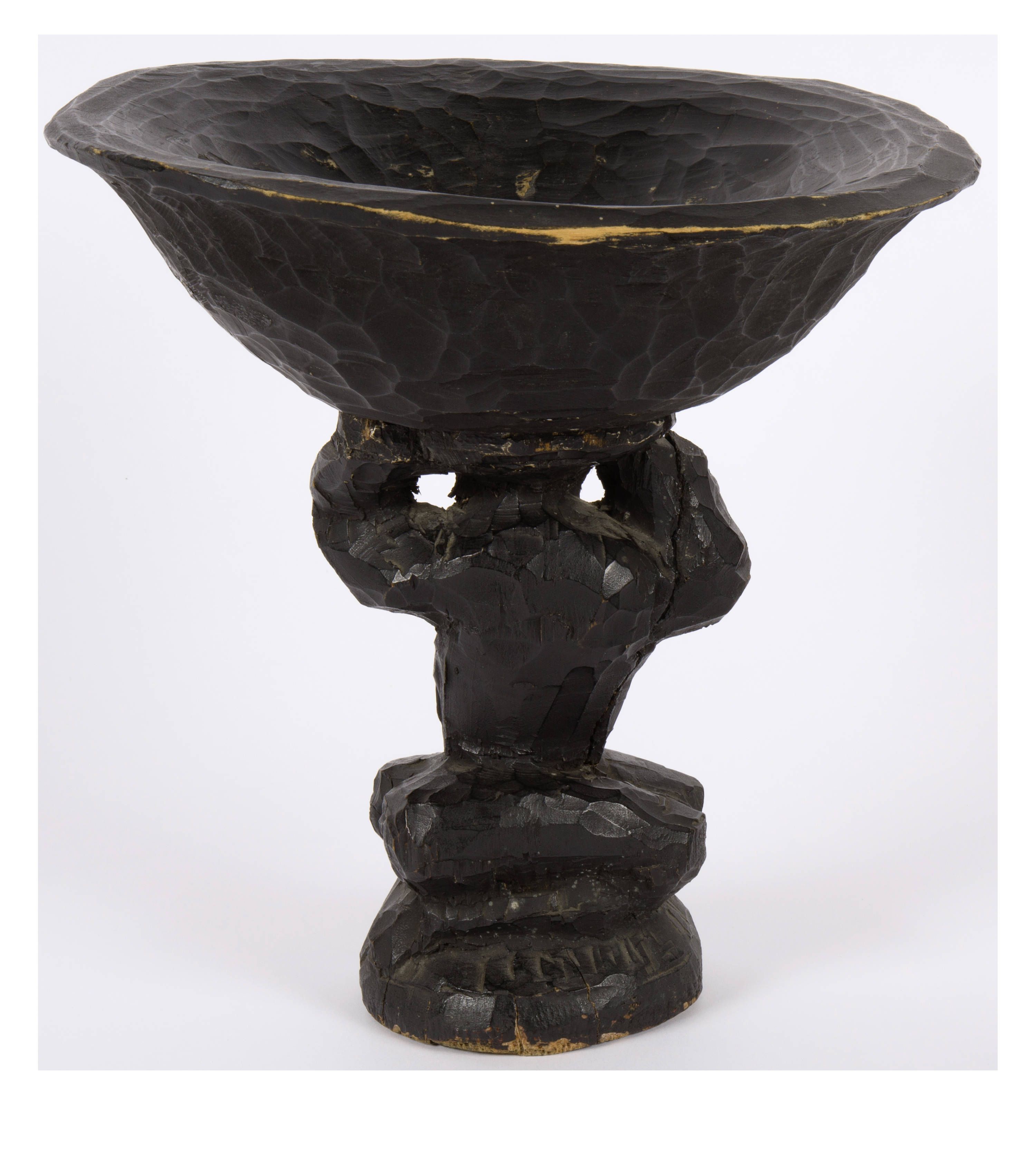 Die zweiteilige, aus Holz geschnitzte und schwarz gefasste Obstschale gehört zu den kunsthandwerklichen Arbeiten, die Kirchner für seine Atelier-Wohnung in Dresden schuf. Wie eine Karyatide hält eine kniende Frau die Schale mit beiden Armen. Die Obstschale ist auf dem um 1912 entstandenen Gemälde "Stillleben mit Gläsern" (Gordon 269) und auf der Lithographie "Erotische Szene VII" von 1910 (Gercken 490, dort als Hocker interpretiert) abgebildet, was eine Datierung der Schale um 1910 nahelegt.