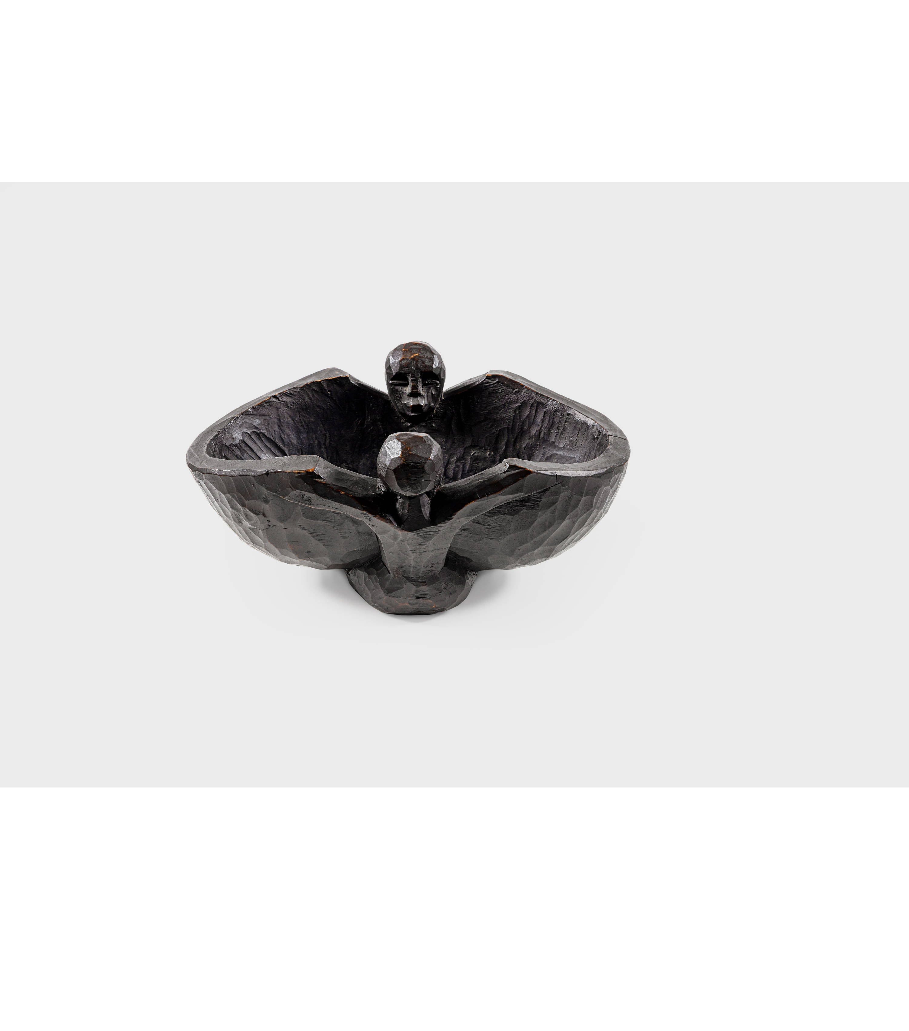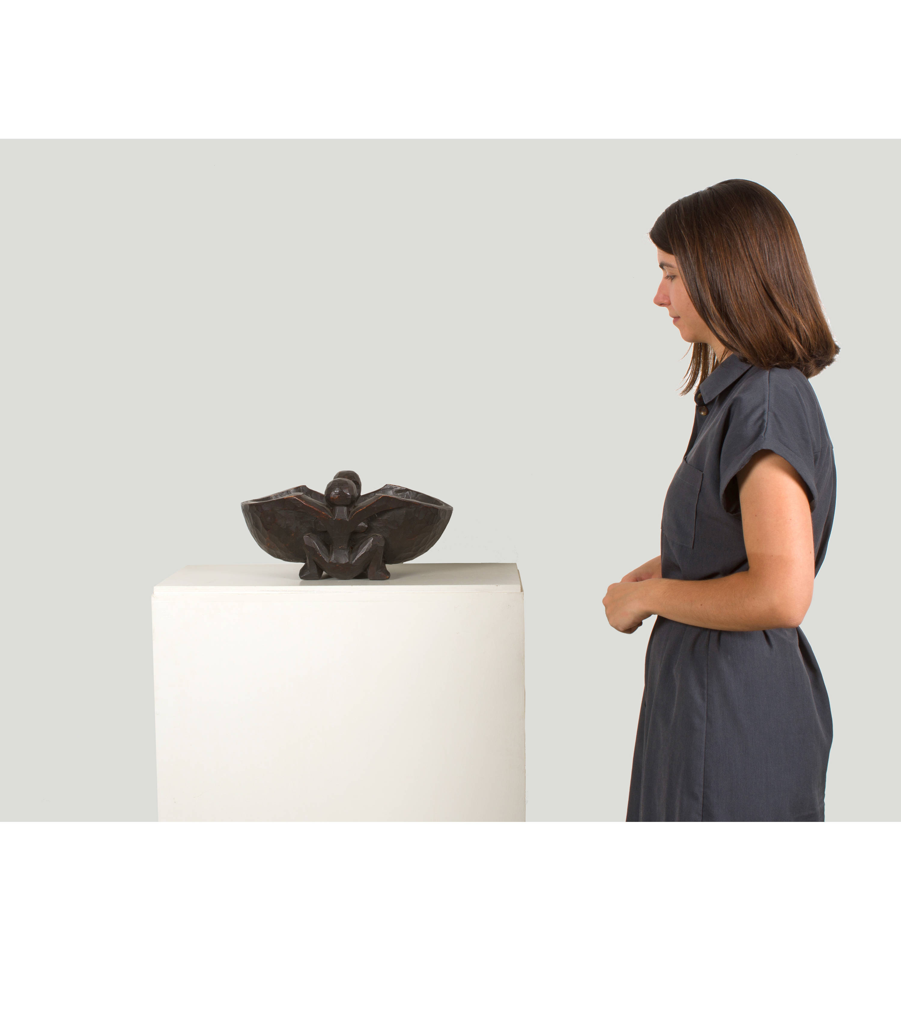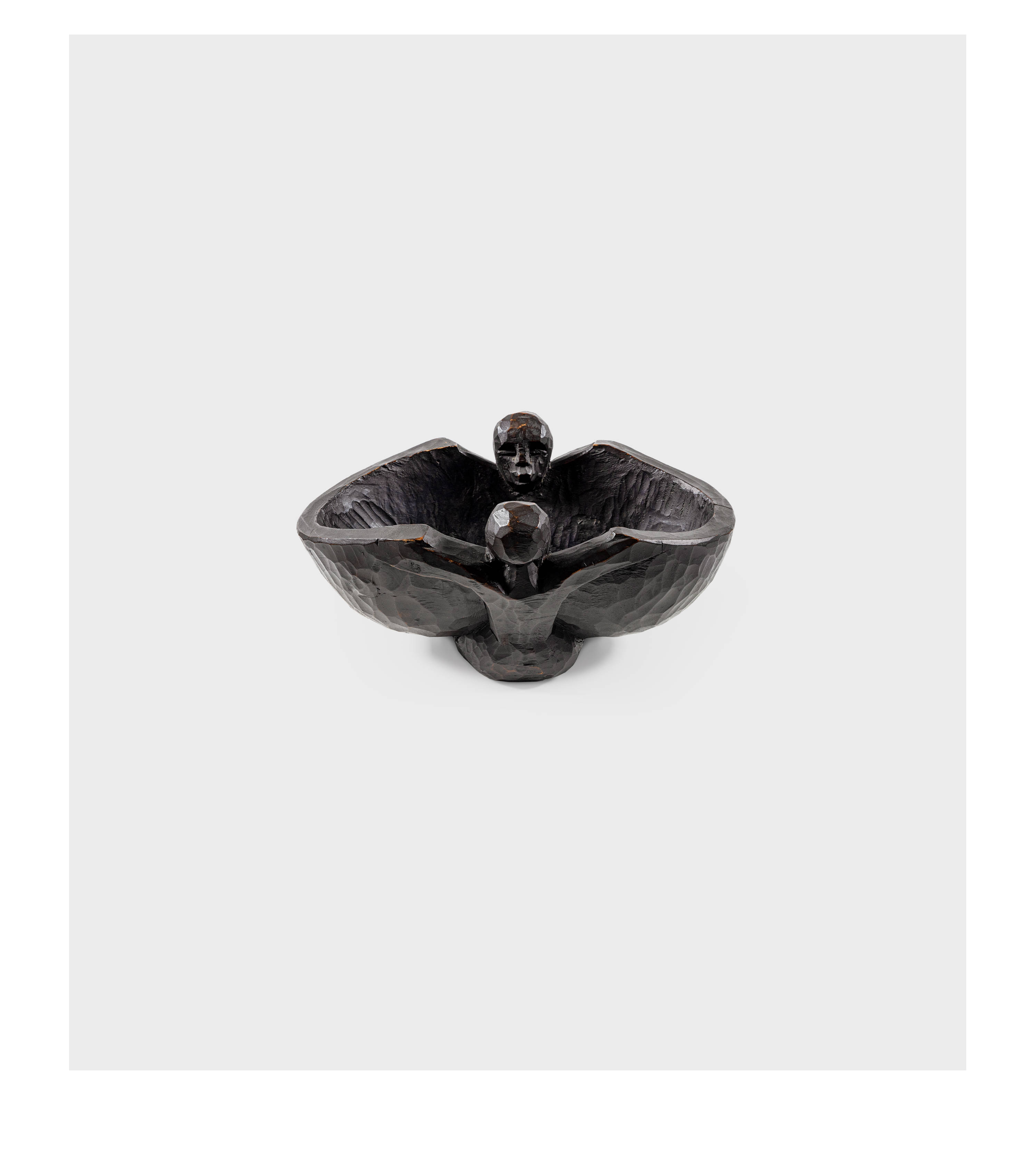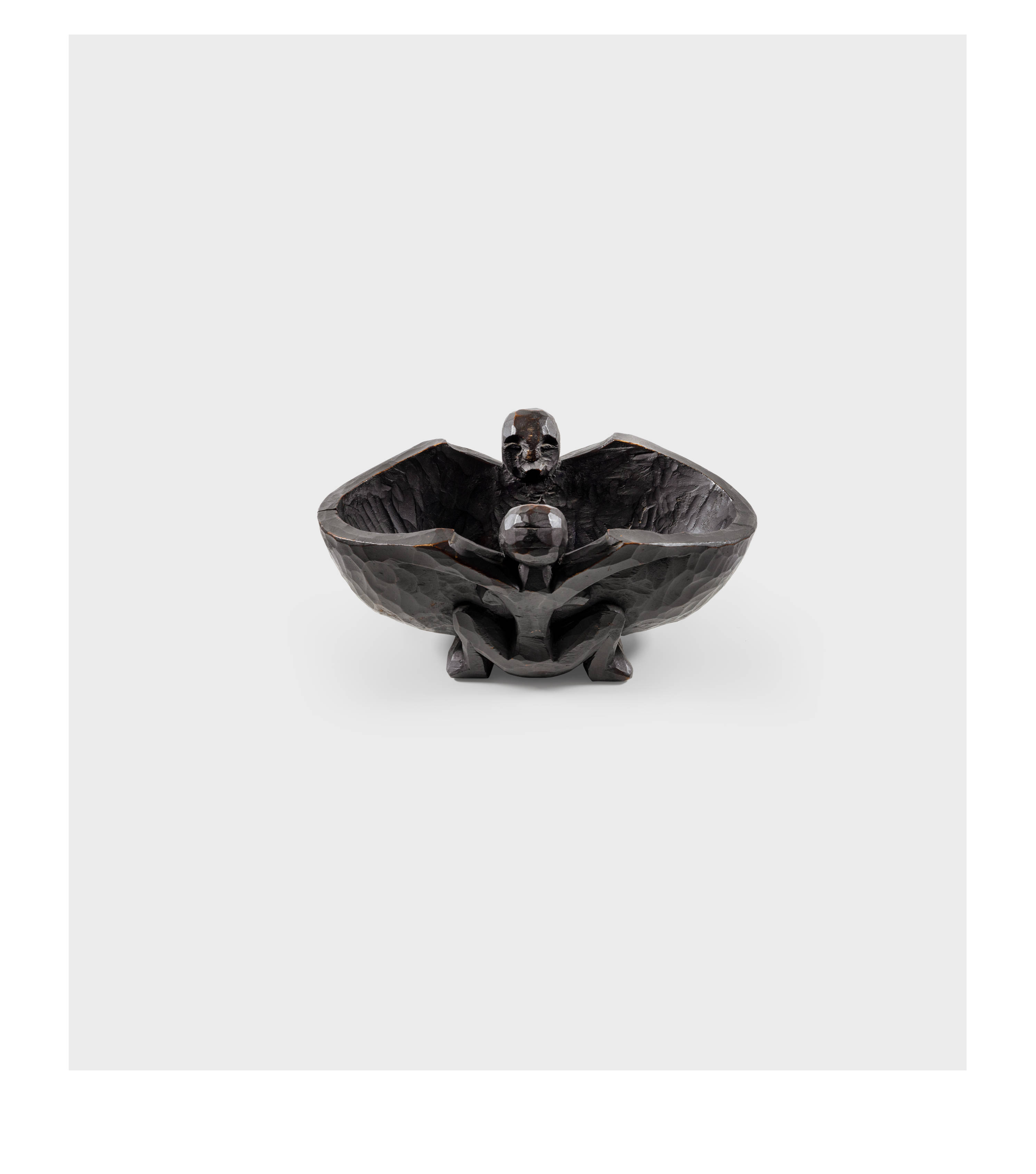 Die aus einem Holzstück geschnitzte, schwarzbraun gefasste Obstschale mit einer kauernden weiblichen Figur und einer sitzenden männlichen Figur gehört zu den kunsthandwerklichen Arbeiten, die Kirchner für seine Atelier-Wohnung in Dresden schuf. Sie ist auf mehreren Gemälden des Künstlers abgebildet. Das früheste Ölgemälde ist "Mädchen mit Katze (Fränzi)" von 1910 (Gordon 124), was auf eine Datierung der Schale um 1910 hindeutet. Kirchner verwendete die Schale weiter als Motiv auf späteren Gemälden wie "Die Holzschale", 1910, (Gordon 126), "Stillleben mit Gefäss", 1912, (Gordon 129), "Stillleben mit Plastiken und Blumen", 1912, (Gordon 130) und auf weiteren Ölgemälden. Auf dem Holzschnitt "Bauernkopf Andreas (Andres Müller)" von 1919 (Gercken 1097) ist die Obstschale wieder im Hintergrund auf dem Tisch dargestellt, was zeigt, wie wichtig dieser Gegenstand für Kirchner auch noch in seiner Davoser Zeit war.