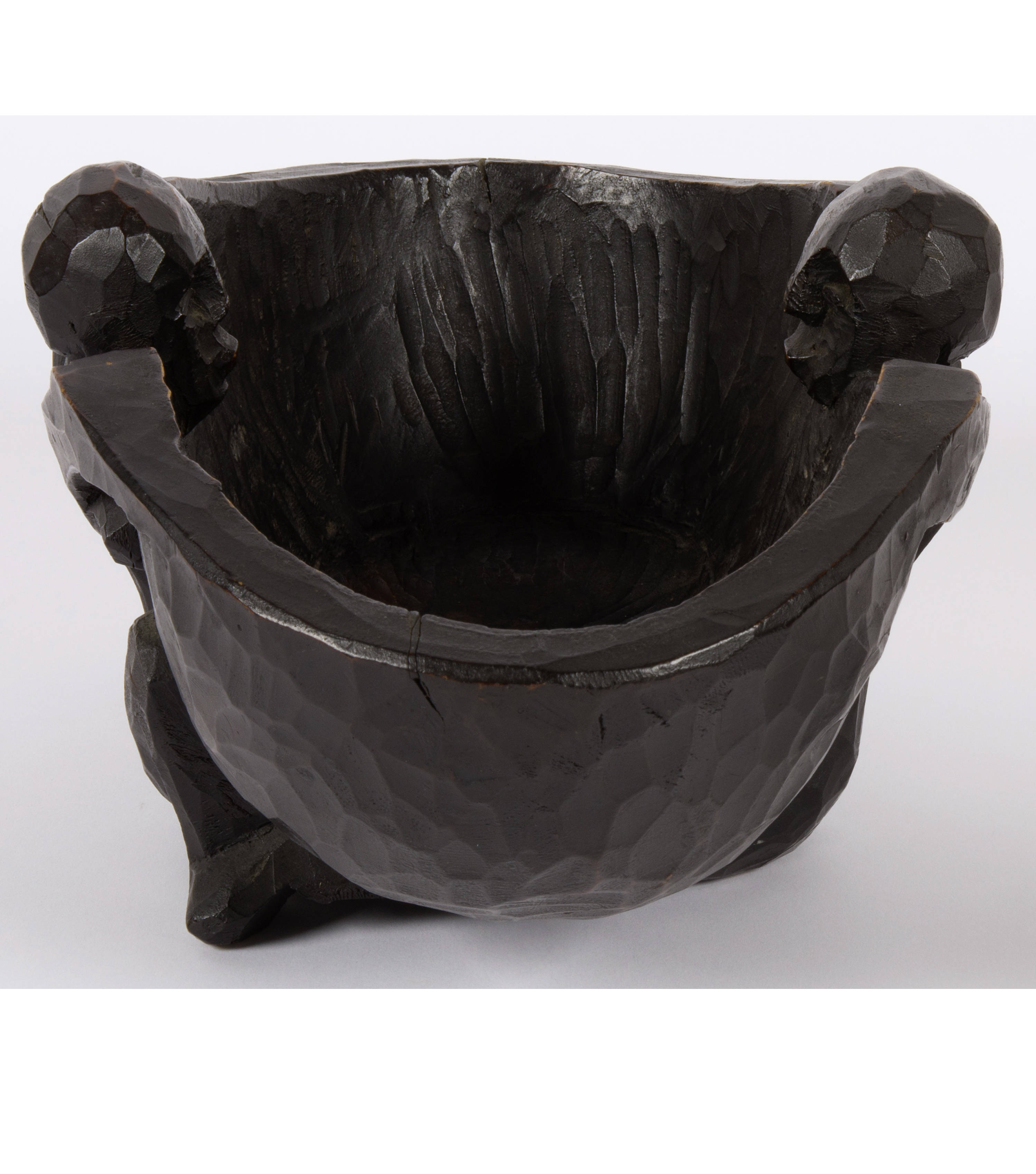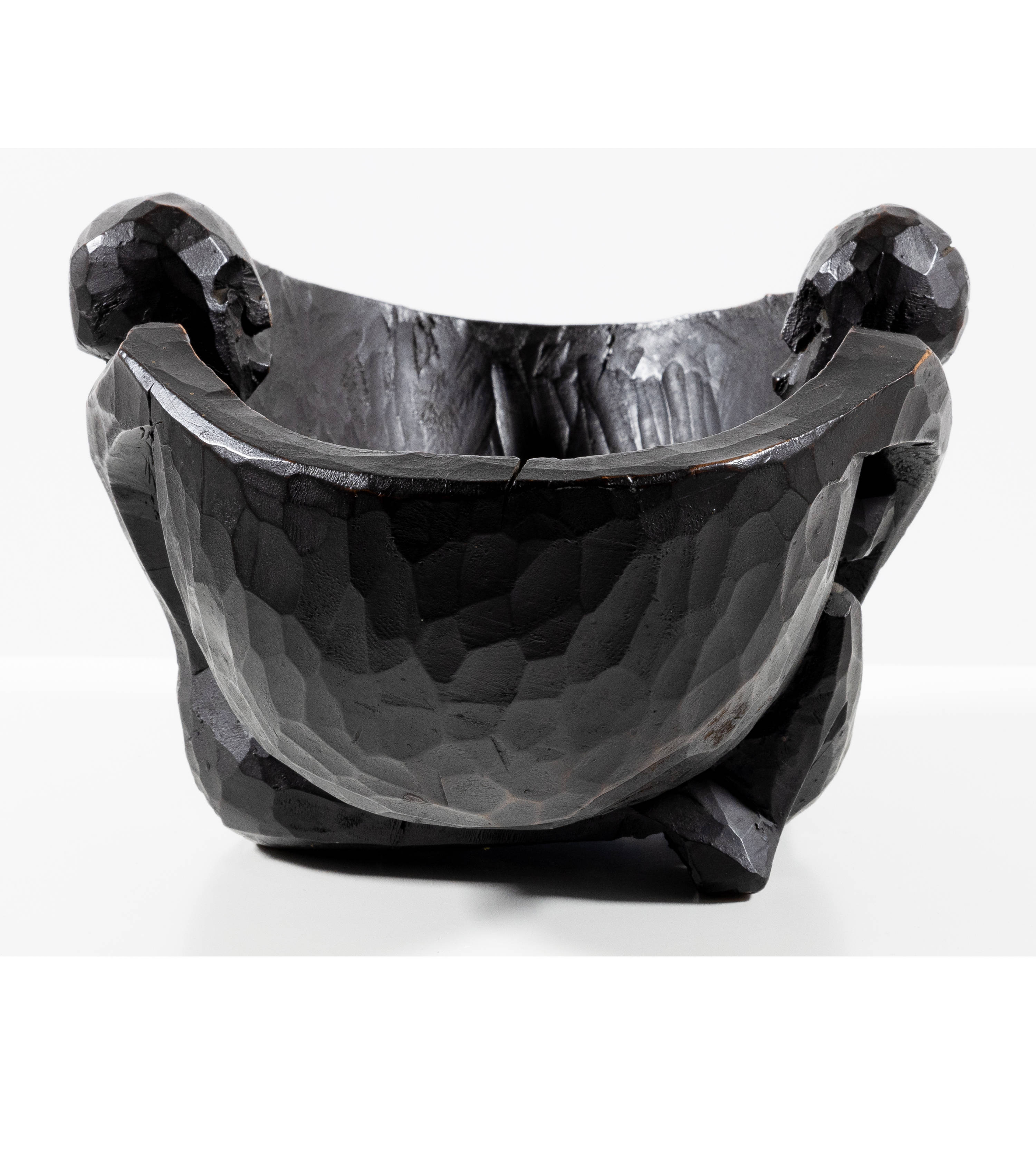 In der ovalen Rundung am Schalenrand mit altem Schwundriss im Holz und am Schalenboden mit einem kleinen Loch. An der Aussenwand sowie an der Standfläche leicht berieben. Mit einer mit einem Nagel wohl vom Künstler selbst ausgeführten Reparaturstelle. In guter Gesamterhaltung.