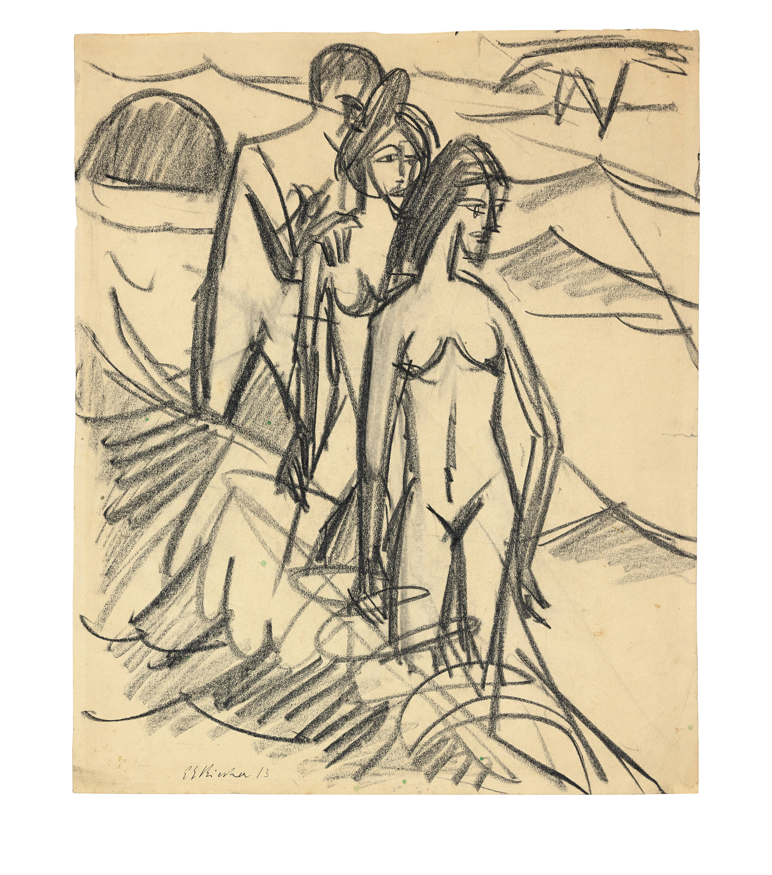 Angeregt durch seine Aufenthalte auf der Ostseeinsel Fehmarn während den Sommermonaten 1912 bis 1914 beschäftigte sich Kirchner mit dem Themenkreis der Badenden. Das vorliegende Blatt kann als Vorzeichnung zum Ölgemälde "Drei Badende" von 1913 (Gordon 356) gesehen werden, das sich heute in der Art Gallery of New South Wales in Sydney befindet. Das Motiv der drei Badenden mit einer heranfliegenden Möwe findet sich in weiteren Werken Kirchners aus demselben Jahr, so in einer Lithographie (Gercken 622), in einem Farbholzschnitt (Gercken 623) und auch auf einer Fotografie (Scotti 22), die von Scotti Kirchner zugeschrieben wurde. Sie muss aber, da er selbst auf der Fotografie abgebildet ist, von einem unbekannten Fotografen sein (aus: Keller, S. 123ff.). Sein letzter Aufenthalt auf der Insel Fehmarn 1914 wurde durch den Kriegsausbruch am 1. August jäh unterbrochen. Kirchner musste die Insel sofort verlassen, da sie zur militär-strategischen Zone erklärt wurde.