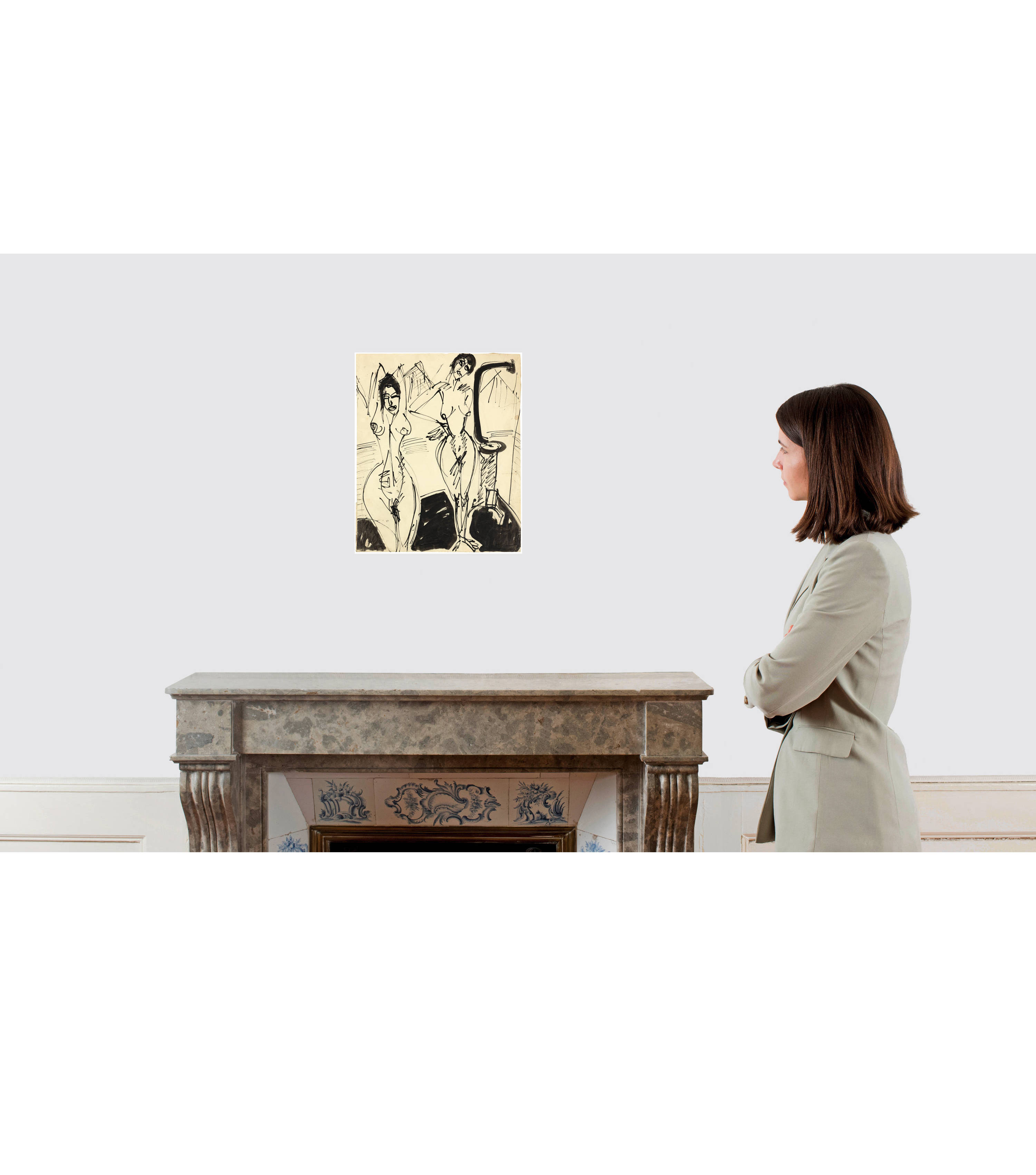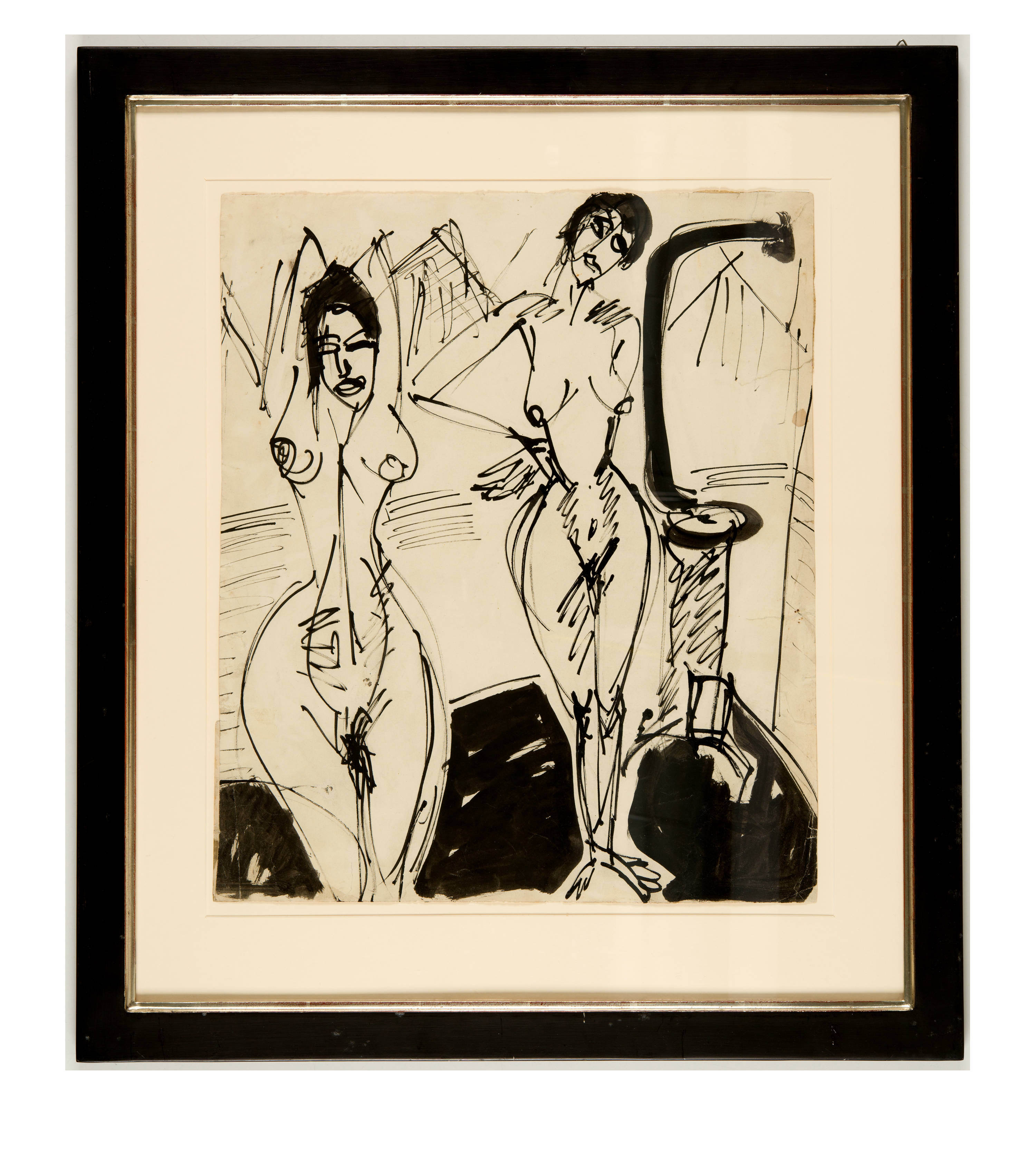 Eine der bedeutendsten Tuschzeichnungen aus dem Jahr 1914, entstanden in Kirchners Wohnatelier in der Körnerstrasse 45 in Berlin-Friedenau. Im Hintergrund ist die Wandbespannung mit Textilapplikationen im Zickzackmuster zu sehen, rechts im Raum steht der markante Bollerofen, auf dem Wasser gekocht werden konnte. Der Raum findet sich auf verschiedenen Fotografien Kirchners aus der Zeit um 1914/15 (vgl. Scotti, Kat. Nrn. 41, 241 und 332). Kirchner wählte dieses Blatt für die Illustration im Textteil der wichtigen Publikation "Das Werk Ernst Ludwig Kirchners" von Will Grohmann, in dem Ölbilder und Skulpturen berücksichtigt wurden. Auf der Zeichnungsrückseite finden sich eigenhändige Grössenangaben Kirchners zur Reproduktion in der Publikation. Das Buch erschien 1926 im Verlag von Kurt Wolff in München. Diese Tatsache zeigt die Bedeutung, die Kirchner dieser Arbeit in seinem Gesamtwerk beimass.
