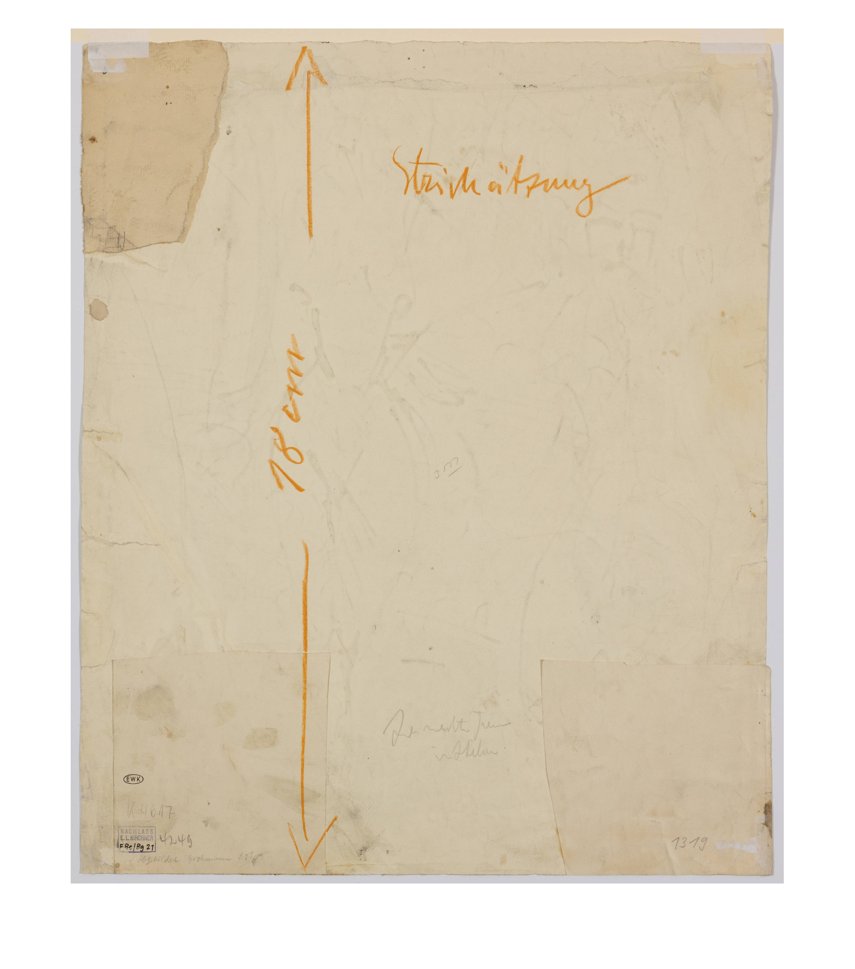 Mit einzelnen Atelierspuren und an den beiden seitlichen Blatträndern mit zahlreichen hinterlegten Einrissen. Oben mittig mit Reisnagellöchern. Rückseitig wohl vom Künstler an drei Ecken hinterlegt.