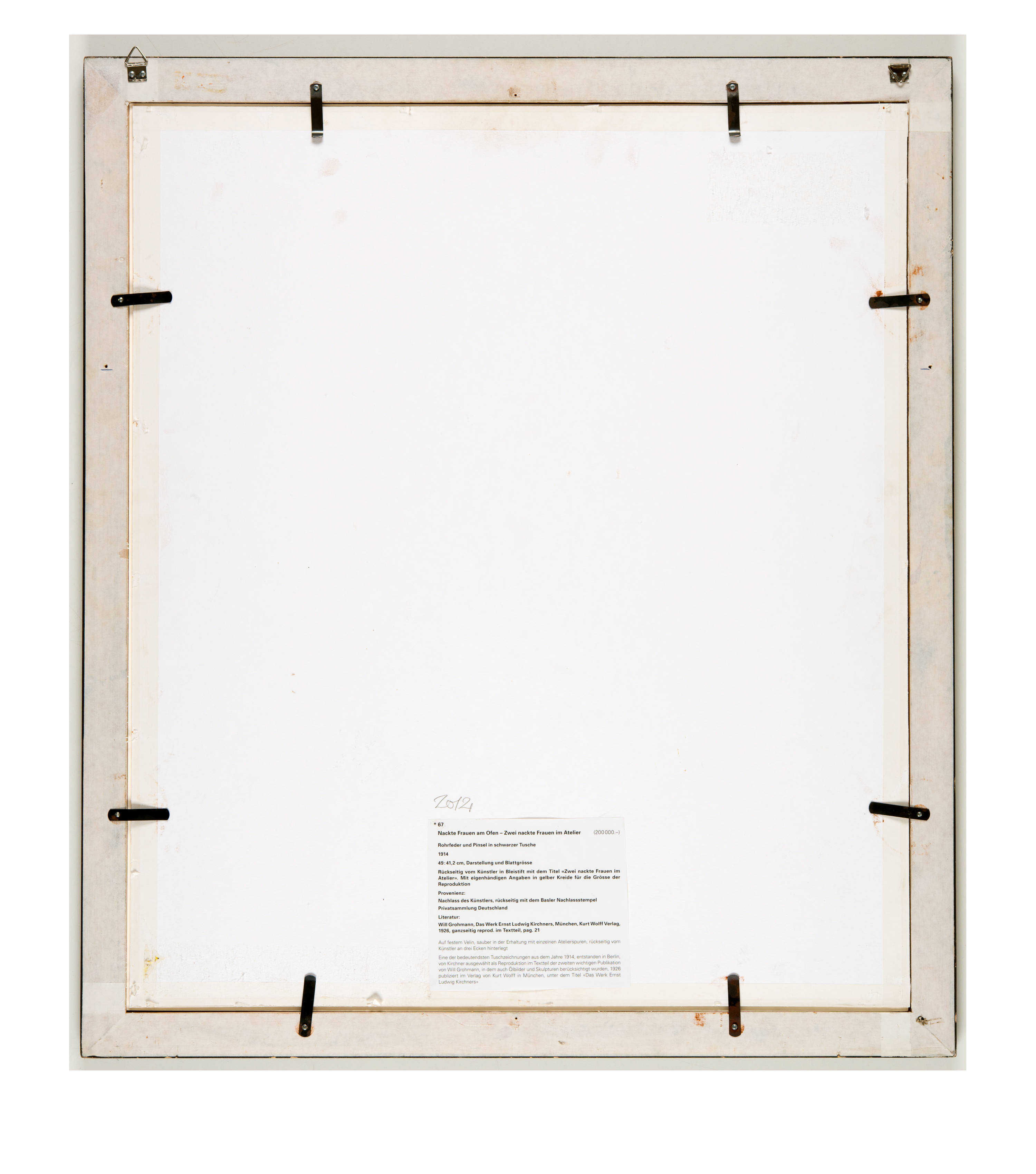 Rückseitig vom Künstler in Bleistift betitelt "Zwei nackte Frauen / im Atelier", mit eigenhändigen Angaben in oranger Fettkreide für die Grösse der Reproduktion. Mit Basler Nachlassstempel und der Bezeichnung "F Be/Bg 21"