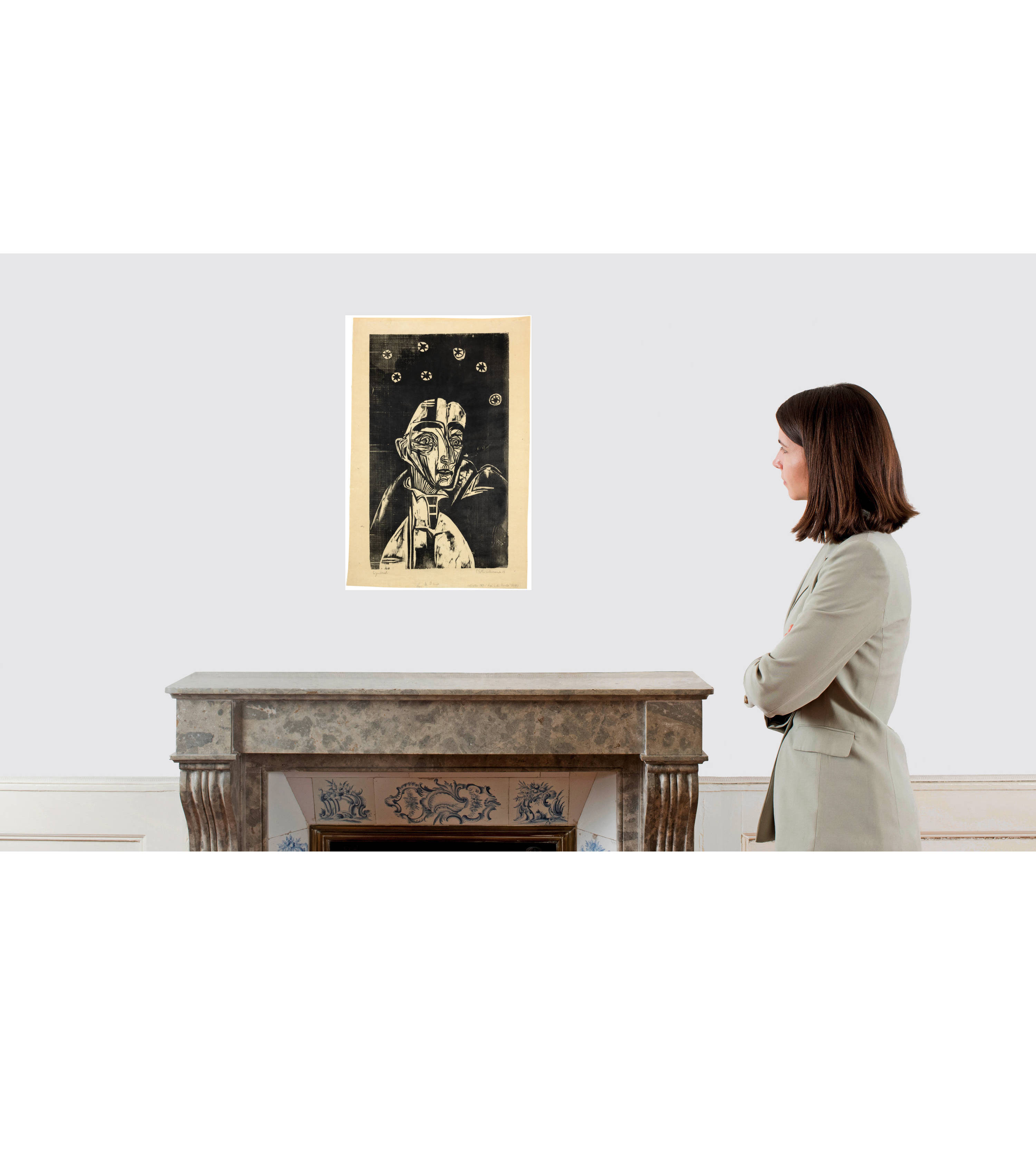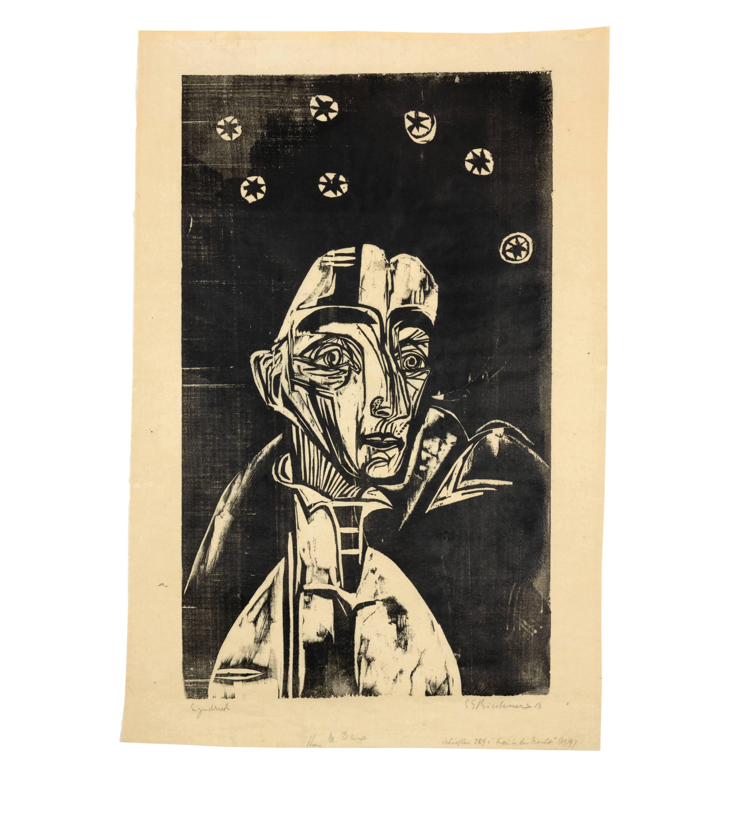 Dargestellt ist Marie-Luise Binswanger-Schlegel (1871–1941), die Witwe des 1910 verstorbenen Psychiaters Dr. Robert Johann Binswanger. Frau Binswanger besuchte Kirchner Mitte Oktober 1919 in Davos Frauenkirch. Kirchner erwähnt die Entstehung des Holzschnittes am 21. Oktober 1919 in seinem Tagebuch: "Holzschnitt Frau Binswanger angefangen" und am 22. Oktober 1919: "Holzschnitt von Frau Binswanger weiter und gedruckt. Er hat etwas Geistiges bekommen, fraglos. Nun will ich ihn farbig drucken, sobald die Platte trocken ist." (Grisebach, S. 56). Dem Tagebucheintrag zufolge druckte Kirchner den Holzschnitt, wie das vorliegende Exemplar, zuerst in Schwarz, um sich dann, wie Los 80 dieser Auktion zeigt, für eine farbige Version zu entscheiden.