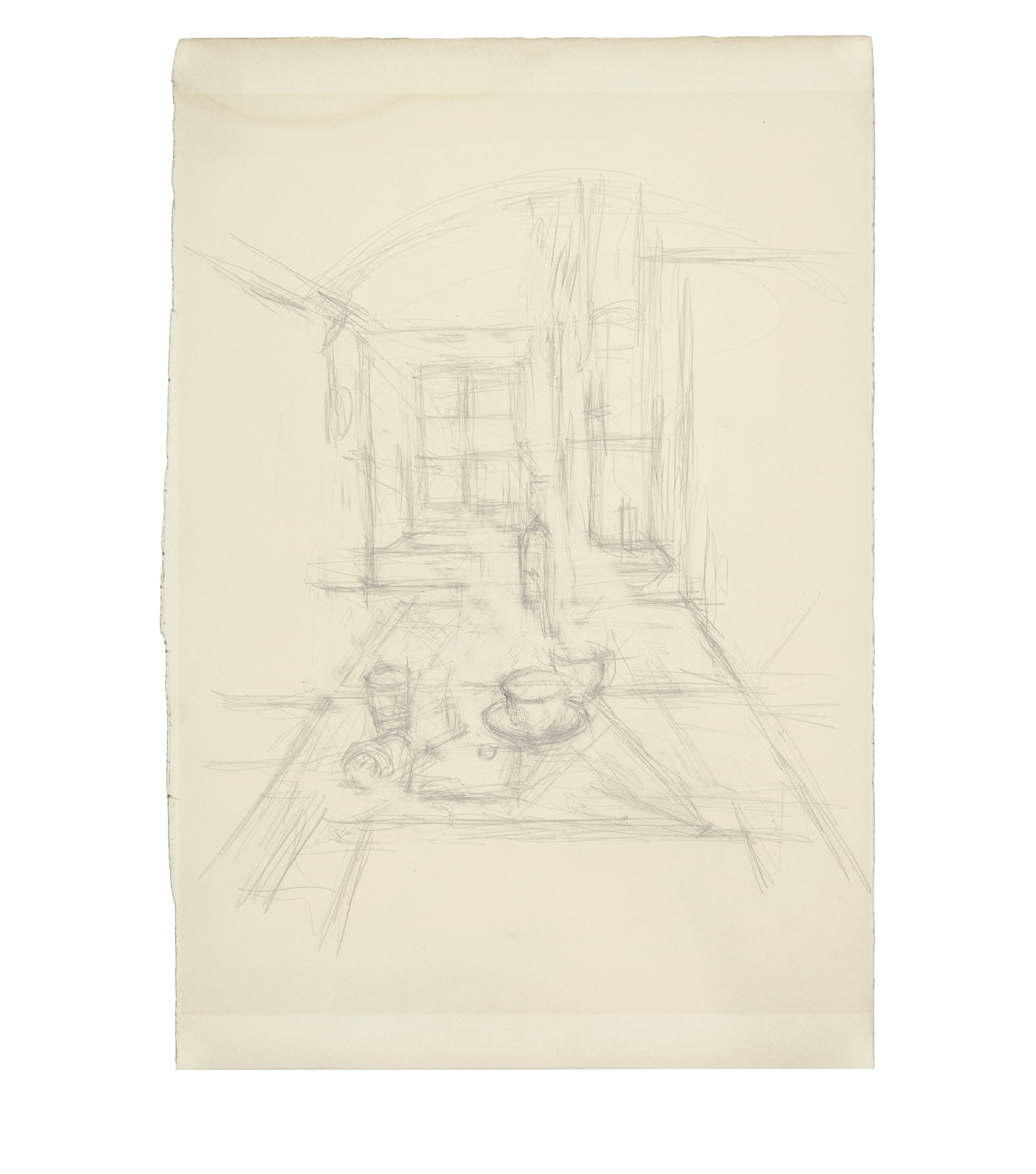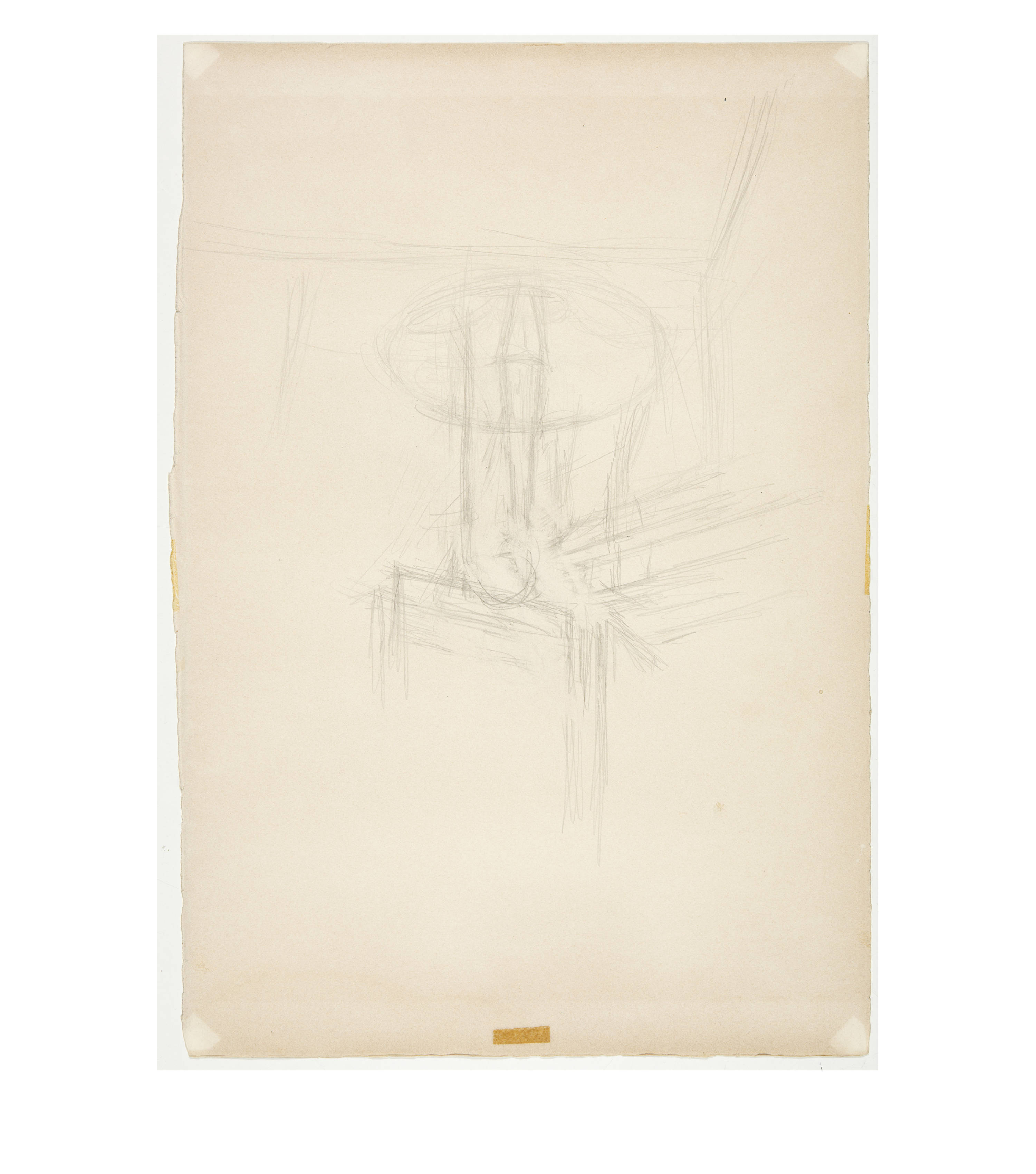 Dr. René Wehrli, Kunsthausdirektor von 1950 bis 1975, organisierte 1962 eine umfassende Ausstellung mit Werken von Alberto Giacometti im Kunsthaus Zürich (2. Dezember 1962 bis 20. Januar 1963). Alberto Giacometti war bei der Einrichtung der Ausstellung persönlich anwesend, wie eine Fotografie während des Aufbaus im Kunsthaus zusammen mit Dr. Wehrli und Hedy Schiess zeigt. Durch den persönlichen Kontakt kam die vorliegende Zeichnung in den Besitz von Dr. Wehrli und später von Hedy Schiess. Sie zeigt auf der Vorderseite ein Stillleben im Elternhaus Giacomettis in Stampa mit der typischen Rundbogendecke.