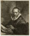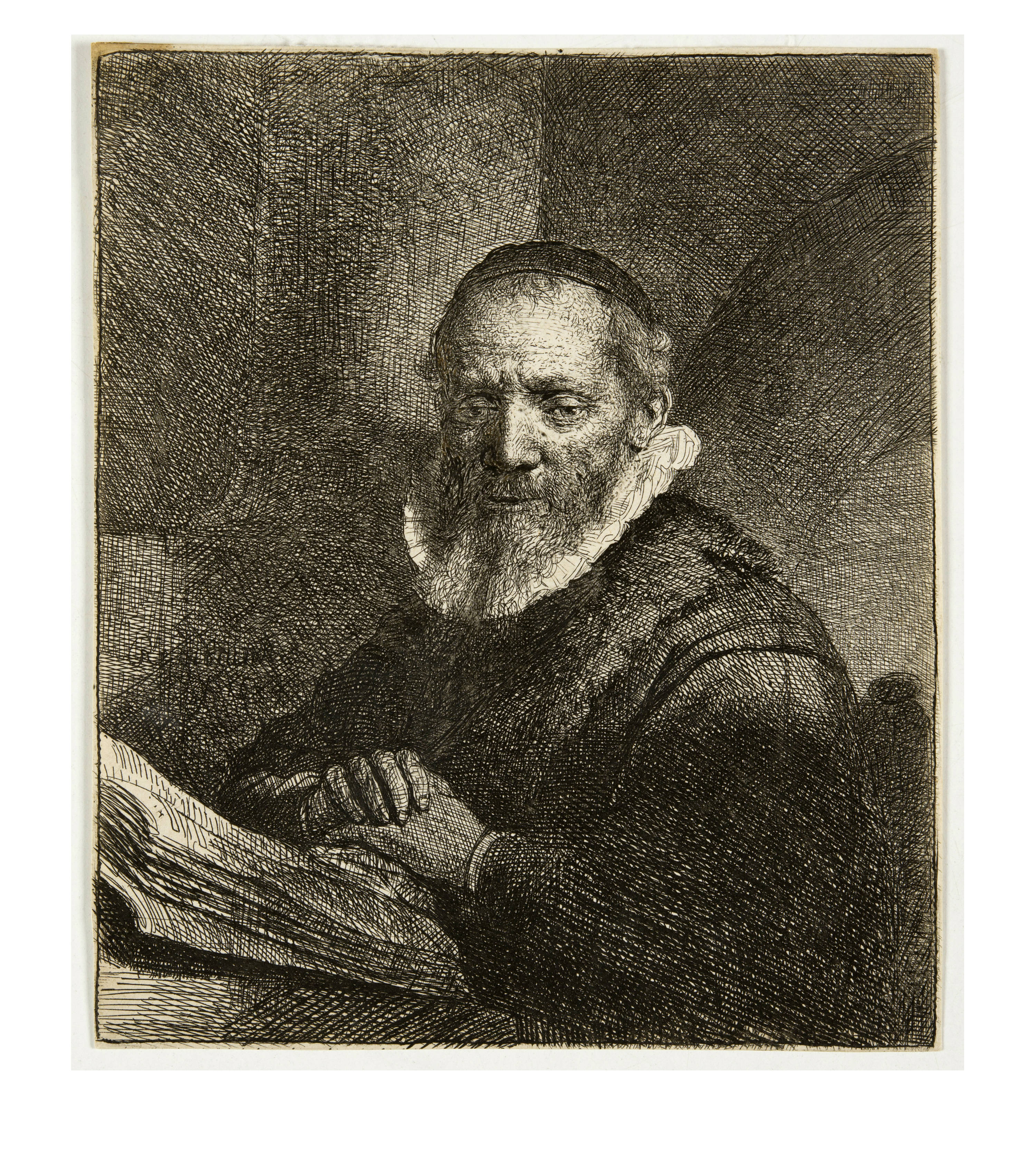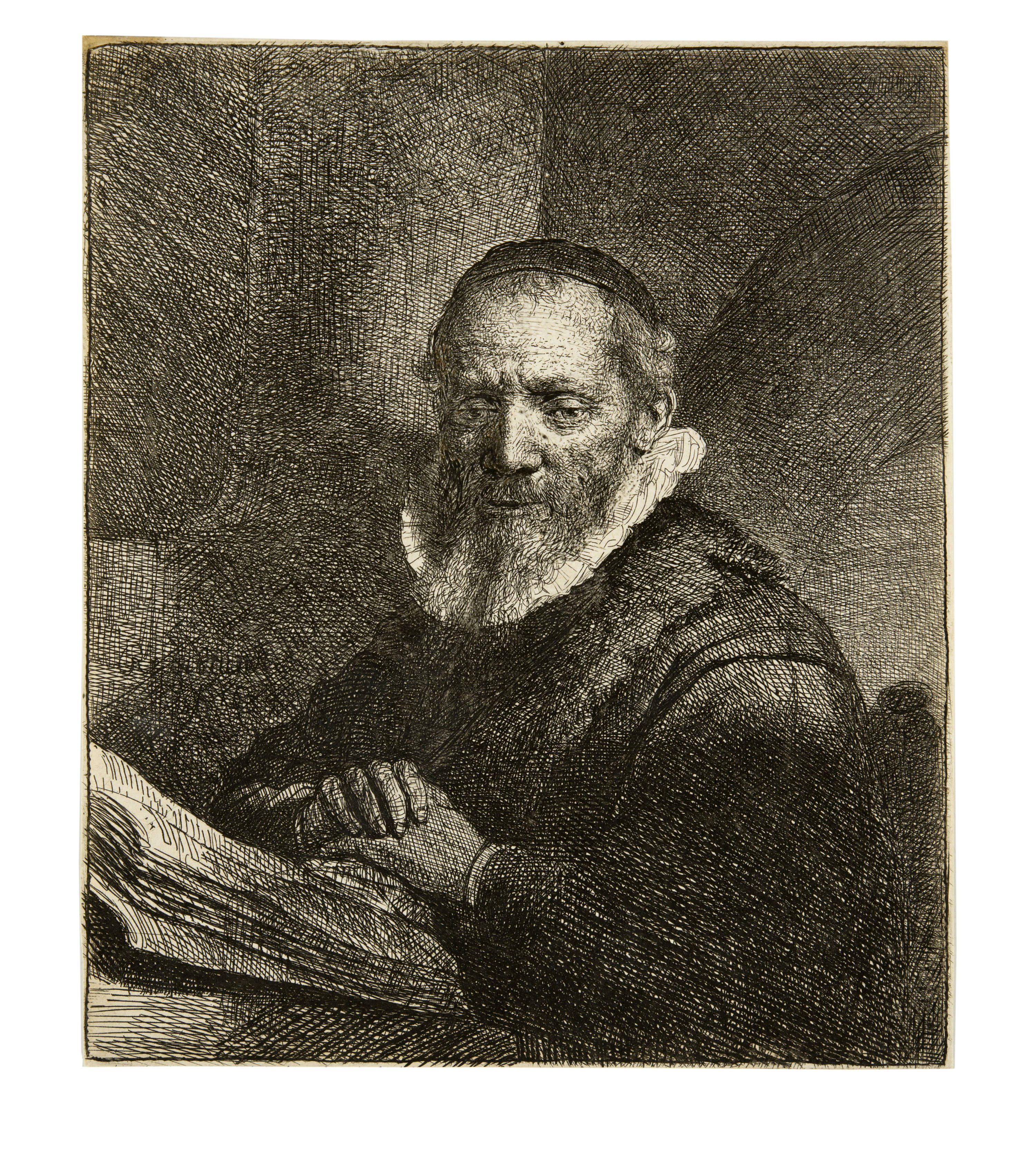 Die frühere Darstellung zeigt den Geistlichen am Tisch vor einem geöffneten Buch, wahrscheinlich der Bibel. Er wendet sich dem Betrachter zu. Seine Augen sind jedoch nach unten gerichtet, als denke er über eine gerade gelesene Passage nach. Aus dem Netz zahlloser Linien, aus denen Rembrandt Raum und Kleidung bildet, sind lediglich das Gesicht mit dem weissen Kragen und das Buch ausgespart, um sie so als wesentliche Elemente der Komposition hervorzuheben.
