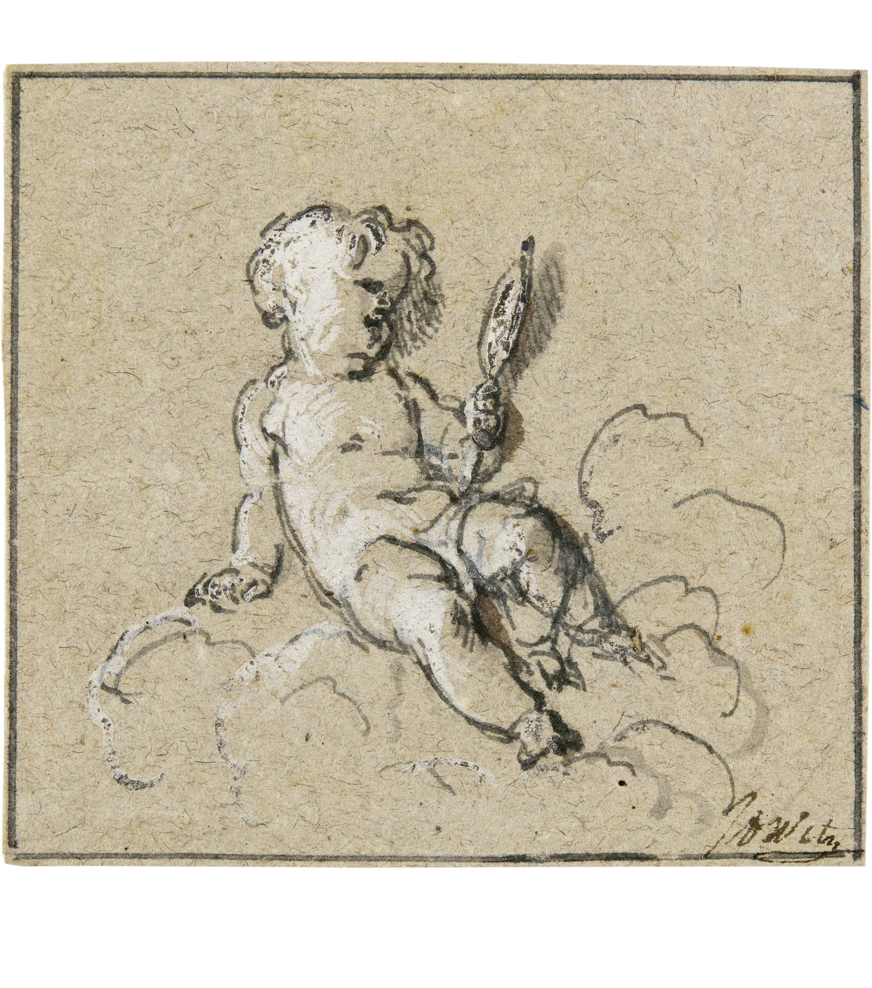 1. Putto. Feder in Tusche, in Weiss gehöht, auf grauem Bütten. 9x9,8 cm. Unten rechts in Feder in Tinte signiert "JdWit".