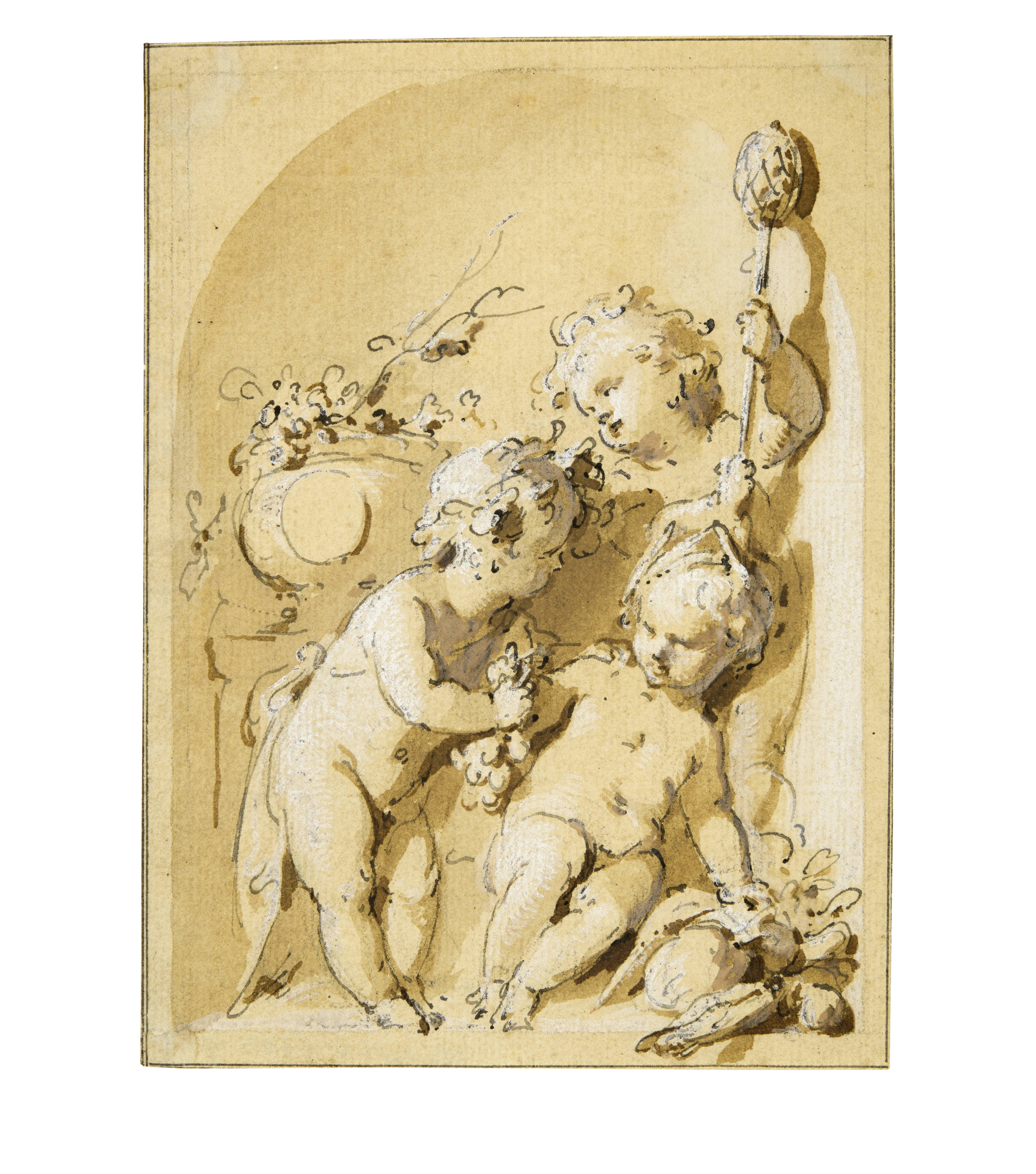 2. Drei Putten. Feder in Tusche, Braun laviert und mit Weiss gehöht auf festem Bütten. 17,5x13 cm. Rückseitig beschriftet und "1745" datiert.