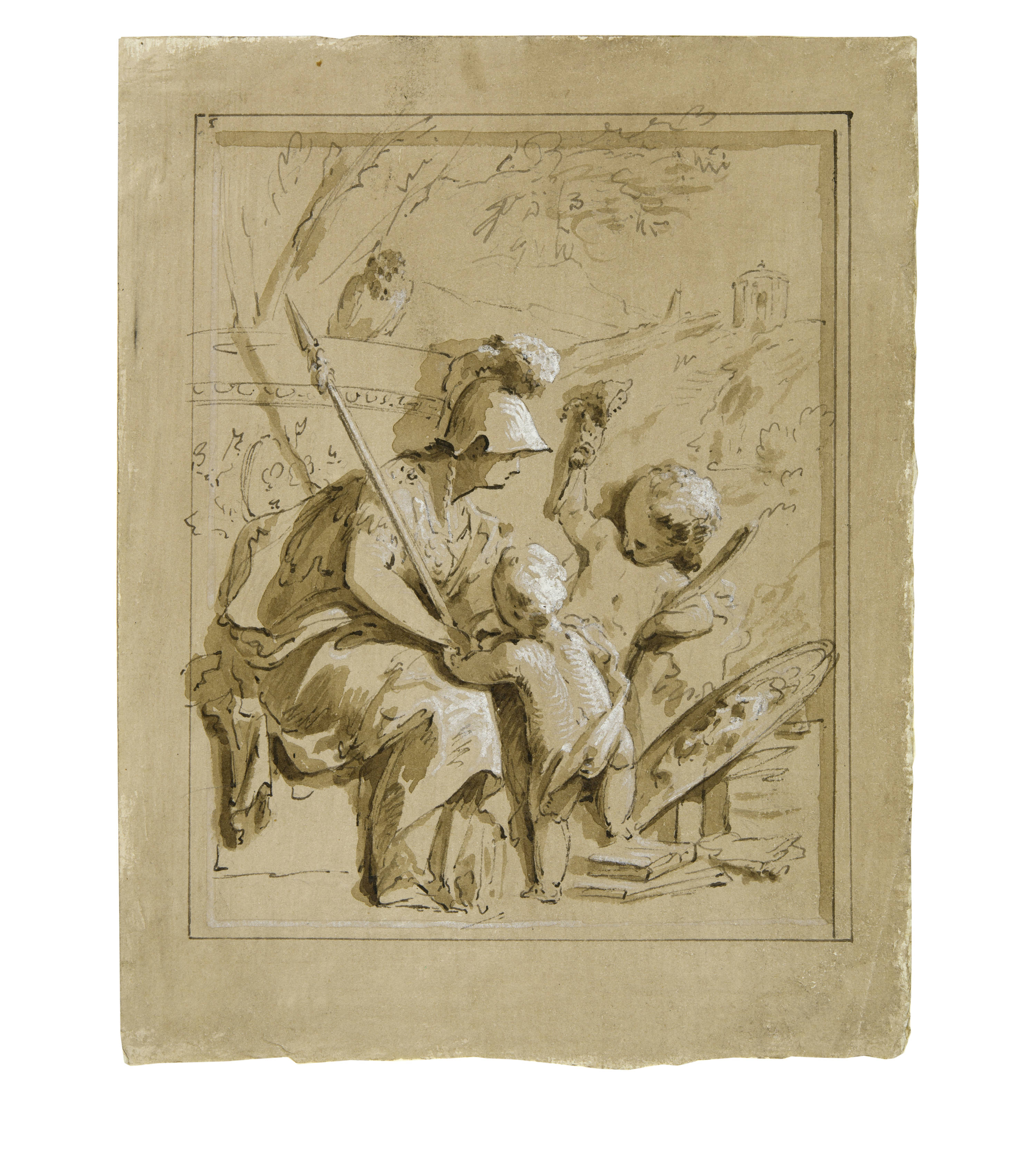 3. Behelmter Roma mit zwei Kindern. Um 1730. Feder in Tusche, mit dem Pinsel in Braun laviert und mit Weiss gehöht. Auf in braun getöntem Bütten mit Wasserzeichen mit Fragment einer Buchstabengruppe. 25x19,3 cm.