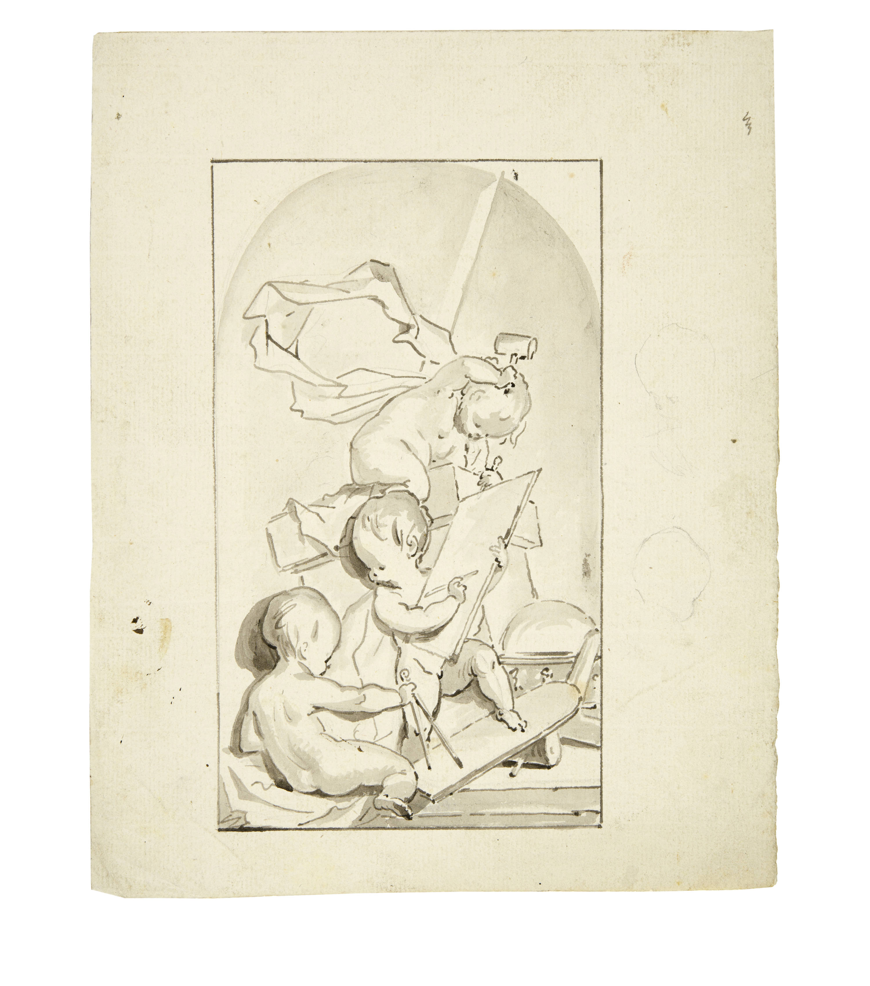 4. Drei Putti, mit Architekturmaterial. Feder in grauer Tinte, mit dem Pinsel in Grau laviert, auf Bütten. 24x19,3 cm