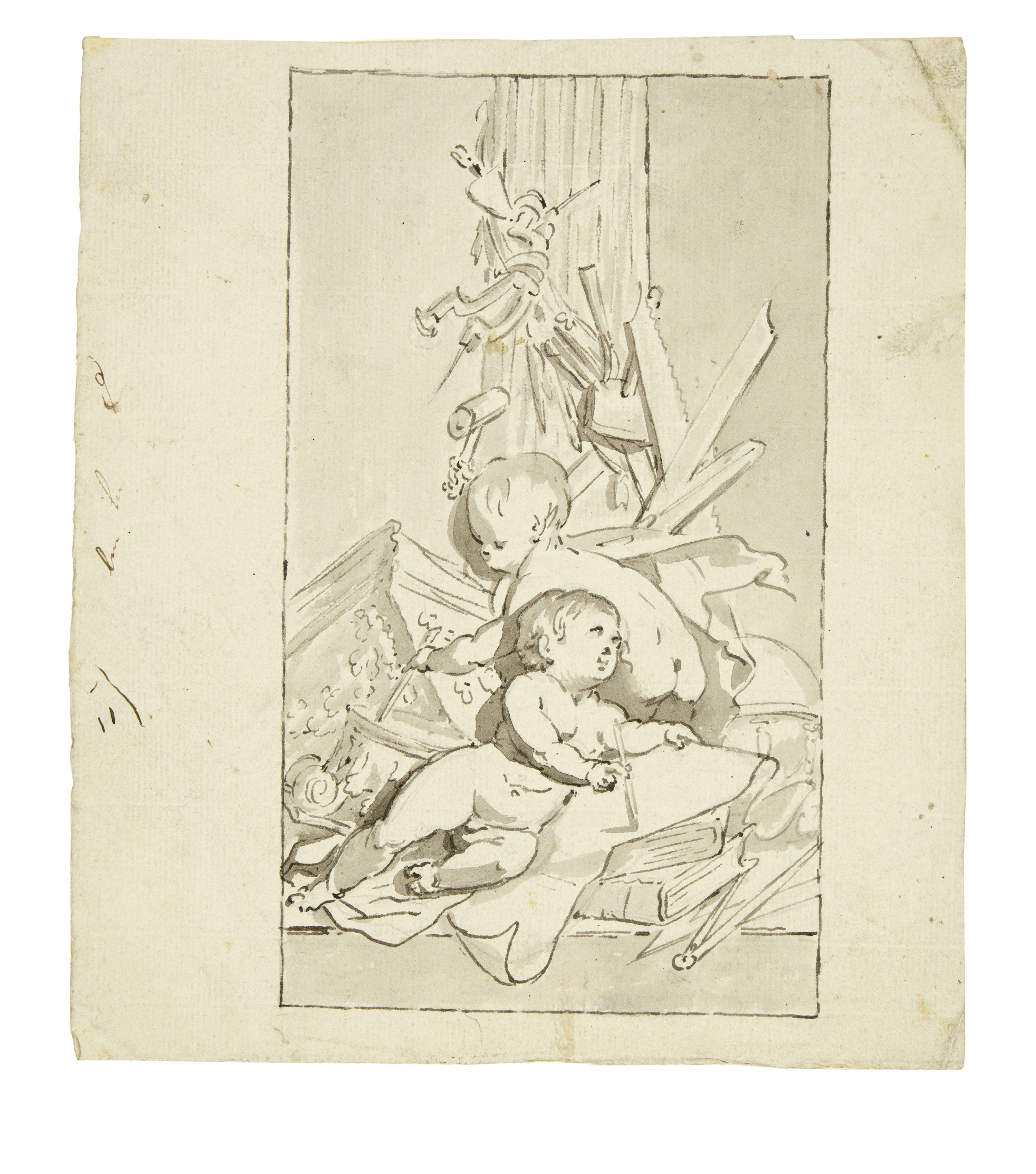 5. Zwei Putten, umgeben von Architekturfragmenten und Werkzeug. Feder in schwarzer Tusche, mit dem Pinsel in Grau laviert, auf Bütten. 21x18,3 cm