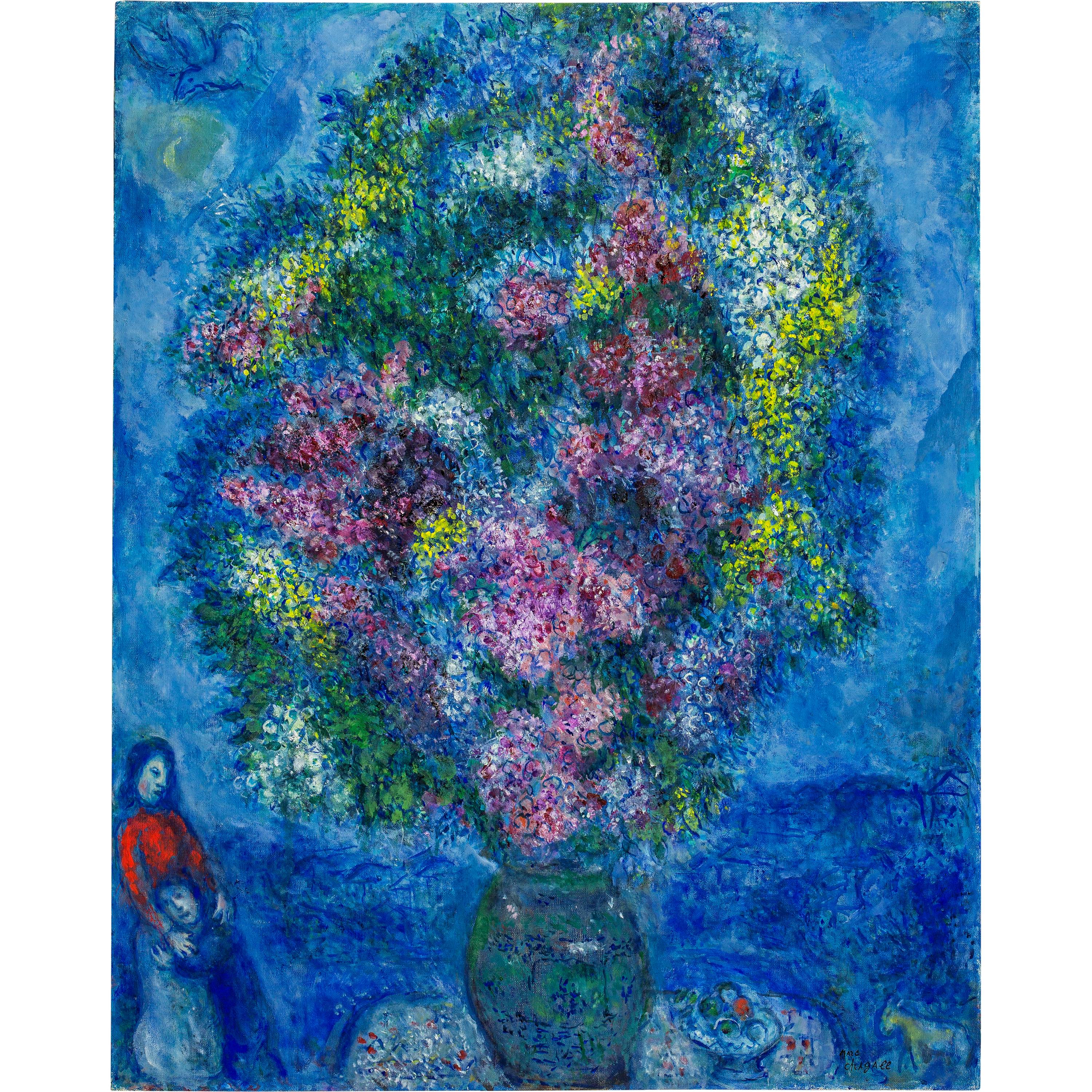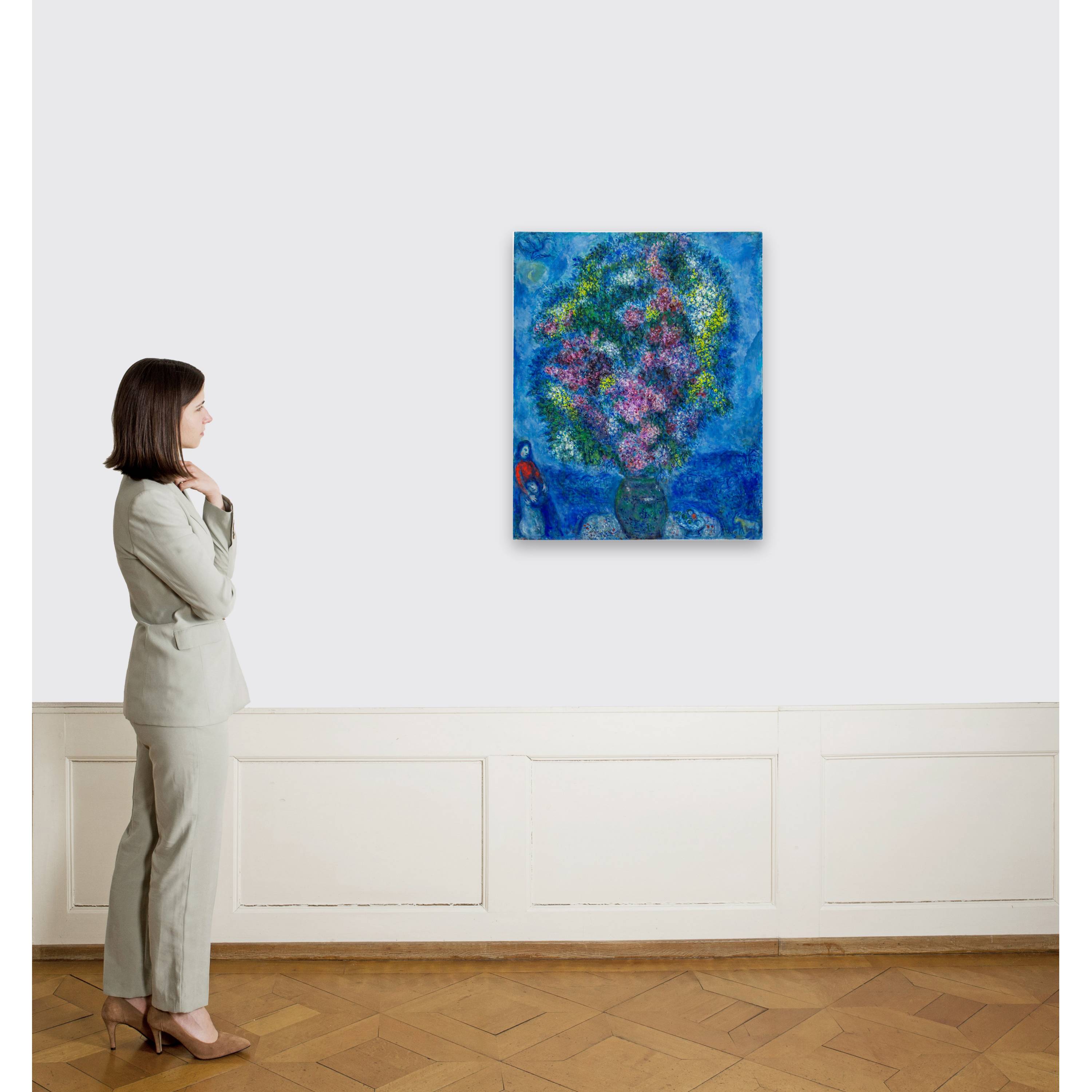 Blumen nehmen im Œuvre von Chagall eine Hauptrolle ein. Das Blumenbouquet steht als ephemere Inspirationsquelle, das die Grenze vom Aussen- zum Innenraum fliessend macht und sogar aufhebt, so auch im vorliegenden Gemälde: Auf einem Tisch mit Früchteschale steht eine Vase, aus welcher ein üppiger Strauss in die Höhe ragt und den ganzen Bildraum einnimmt. Die Blumen werden zu einem unvergleichlichen Feuerwerk und leuchten vor dem blauen Grund. Beinahe zeichnerisch hat der Künstler mit dem Pinsel die bekannten Häuser seiner weissrussischen Heimatstadt Witebsk am Horizont angedeutet, links ist ein innig umschlungenes Liebespaar zu sehen. Es ist eine Reminiszenz an frühere Zeiten; oben leuchtet der «Sonnen-Mond» und lässt es offen, ob der Tag anbricht oder die Nacht, rechts unten ist das mystische Tier zu sehen, das, wie die Blumen, ebenso für Inspiration steht. Selten dominieren die Blumen ein Gemälde wie im vorliegenden Fall. Trotz der Dominanz des Bouquets versteckt Chagall viele kleine Zitate aus seiner Lebensgeschichte