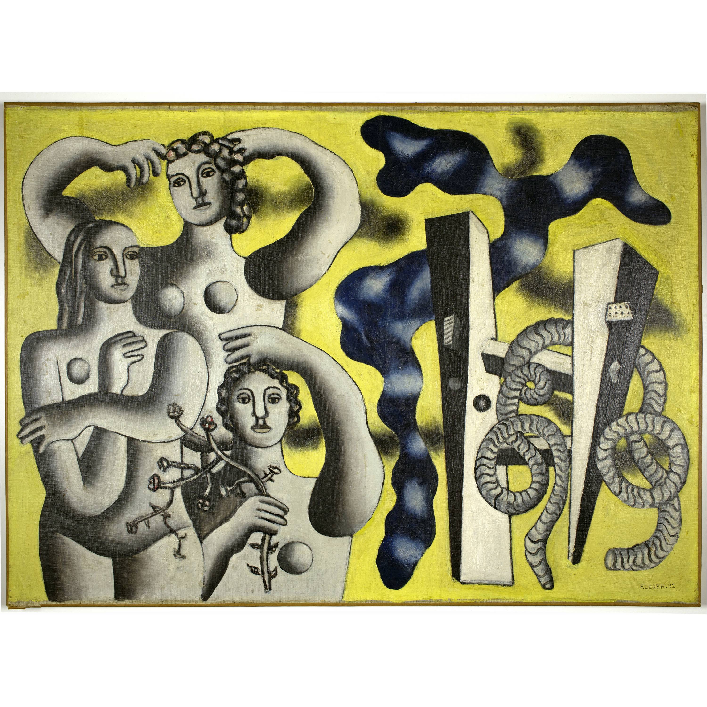With this composition, Léger returned to large-format paintings and resumed the depiction of women in hieratic postures with sacred faces. Against a yellow background, the left half of the painting shows three women in a monumental frontality with sinuous arms, like dancers. The right side is dominated by two poles or a ladder around which a rope winds. A long, sinuous cloud-like form separates the two halves of the painting