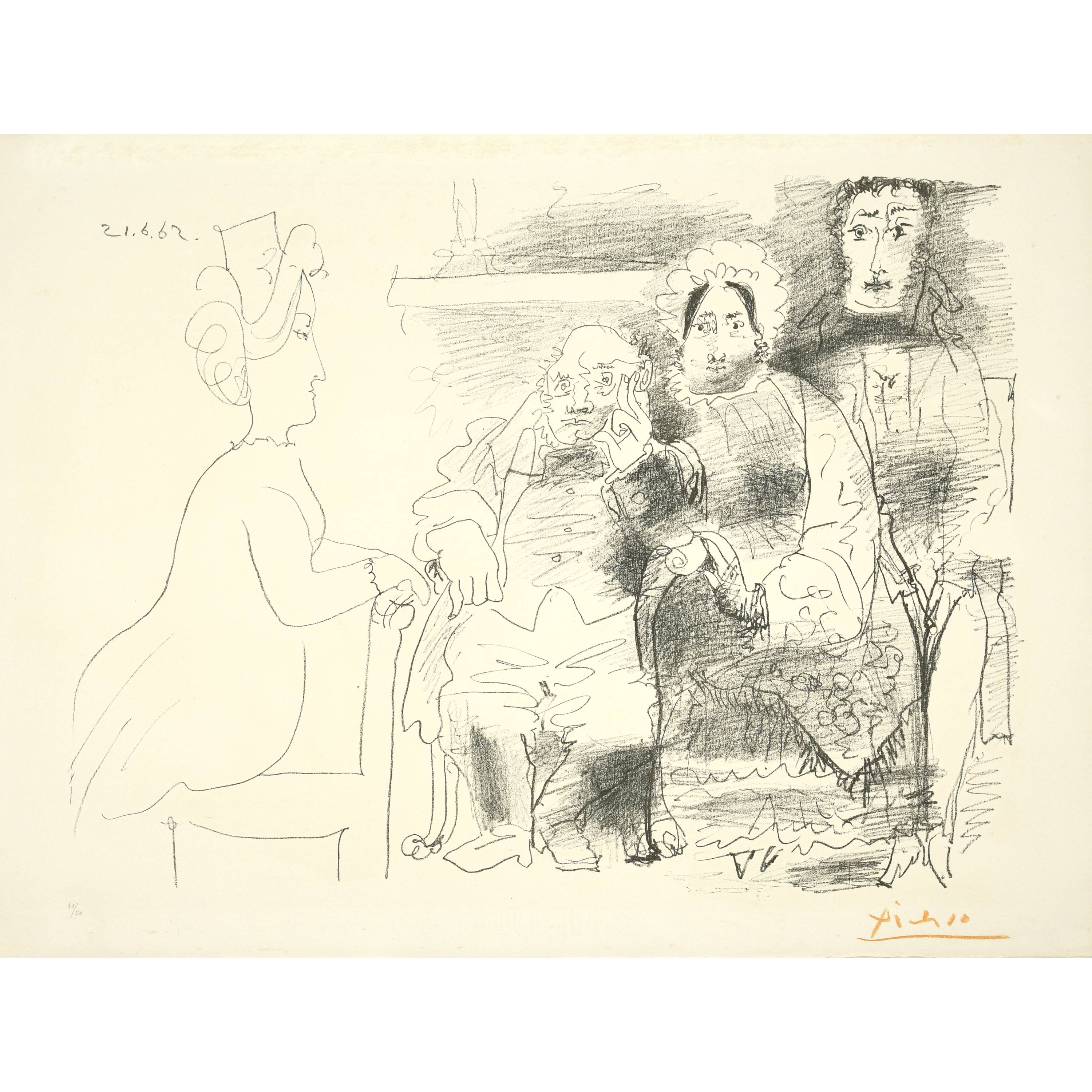 Unten rechts vom Künstler in oranger Kreide signiert "Picasso", links nummeriert "41/50".