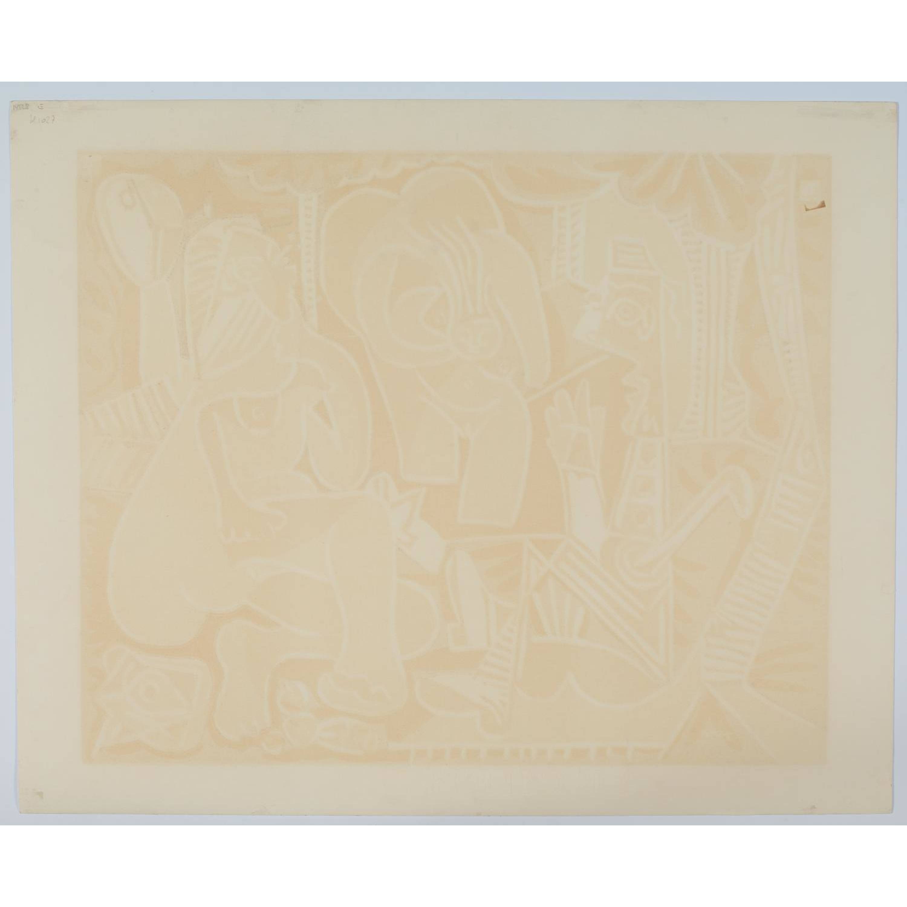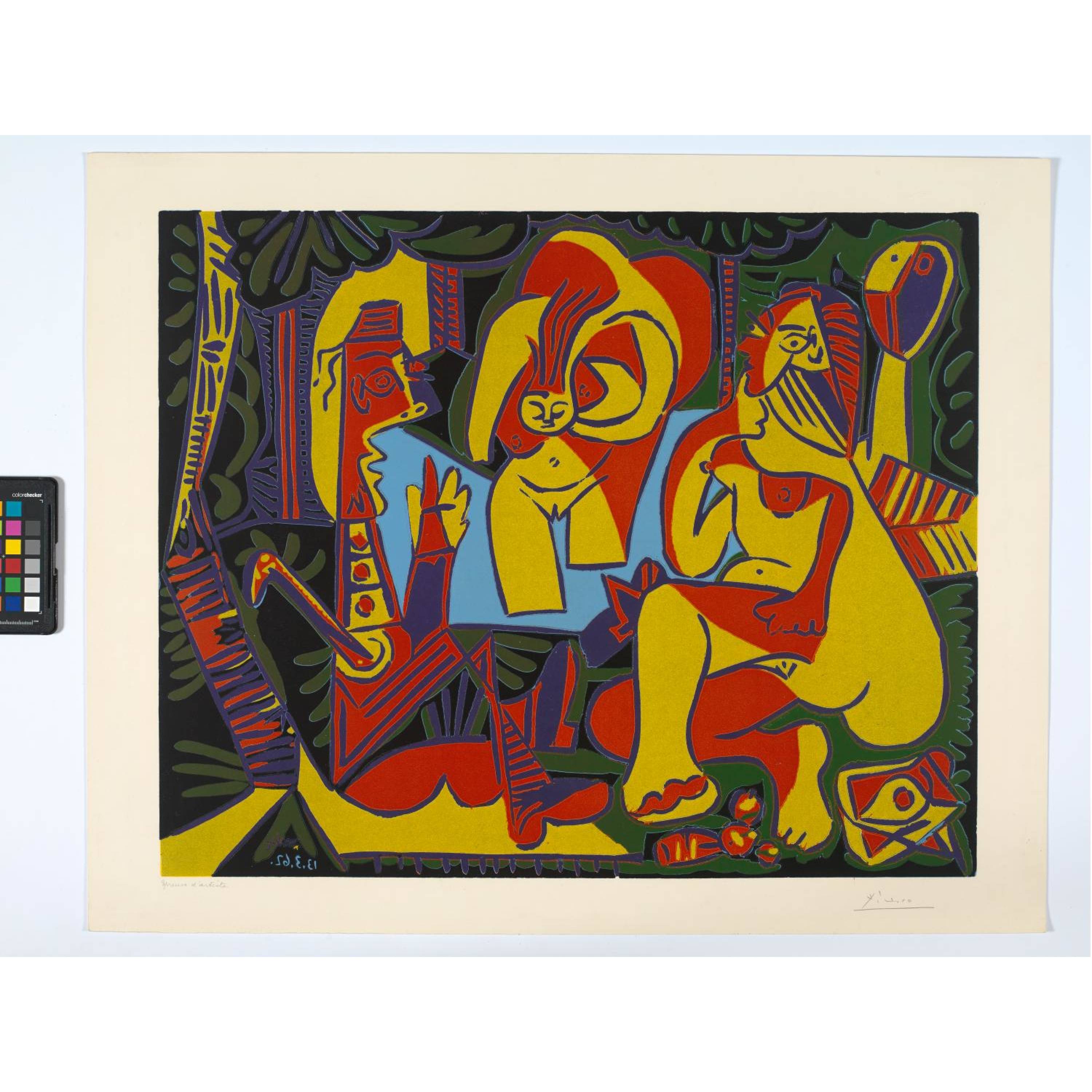 Picasso beschäftigte sich oft mit kunsthistorischen Vorbildern und zitierte sie vielfach in eigenen Werken. Dem 1863 entstandenen und sich heute im Musée d'Orsay in Paris befindlichen "Déjeuner sur l'Herbe" von Edouard Manet widmete er zahlreiche Zeichnungen und Gemälde. Es entstanden auch drei Linolschnitte zum Thema, wobei das hier angebotene Blatt in seiner Farbenpracht und kompositorischen Anlage das Hauptblatt dieser Gruppe darstellt. Anekdotisch ist die "Ameise" oberhalb der Datierung, sie zeugt vom Humor des Künstlers. Einer der bedeutenden Linolschnitte des Meisters, entstanden in Mougins