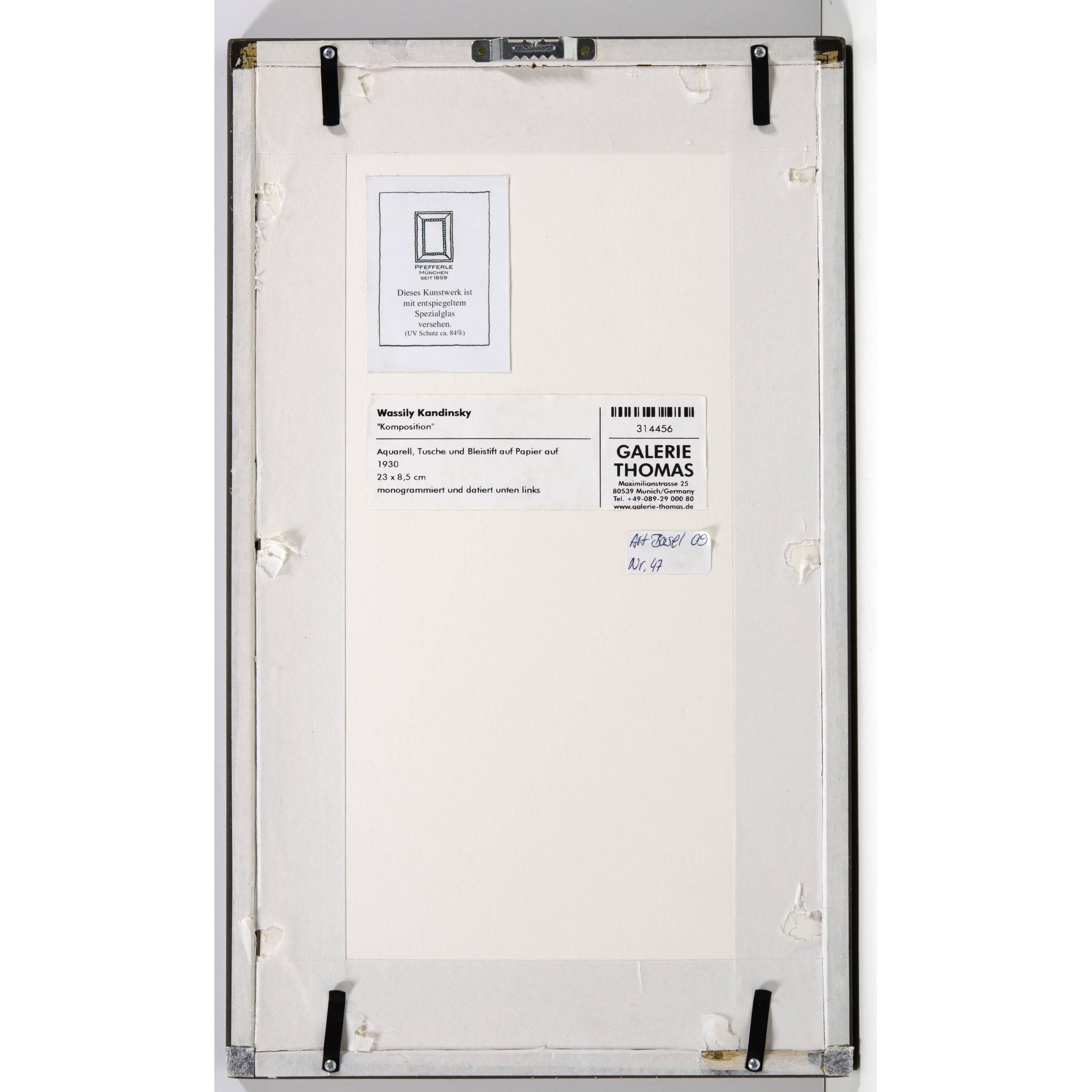In 1930, Kandinsky created a series of smaller watercolours, which, however, cannot be traced in his inventory nor in his hand list. According to Endicott Barnett, the artist gave some of these works as New Year's wishes to the members of the Kandinsky Society, others found their way into the first 8 copies of the special edition of the publication "Will Grohmann, Kandinsky", published in 1930 by Editions Cahiers d'Art in Paris. The author of the catalogue raisonné suspects that the present work may have originally come from this book