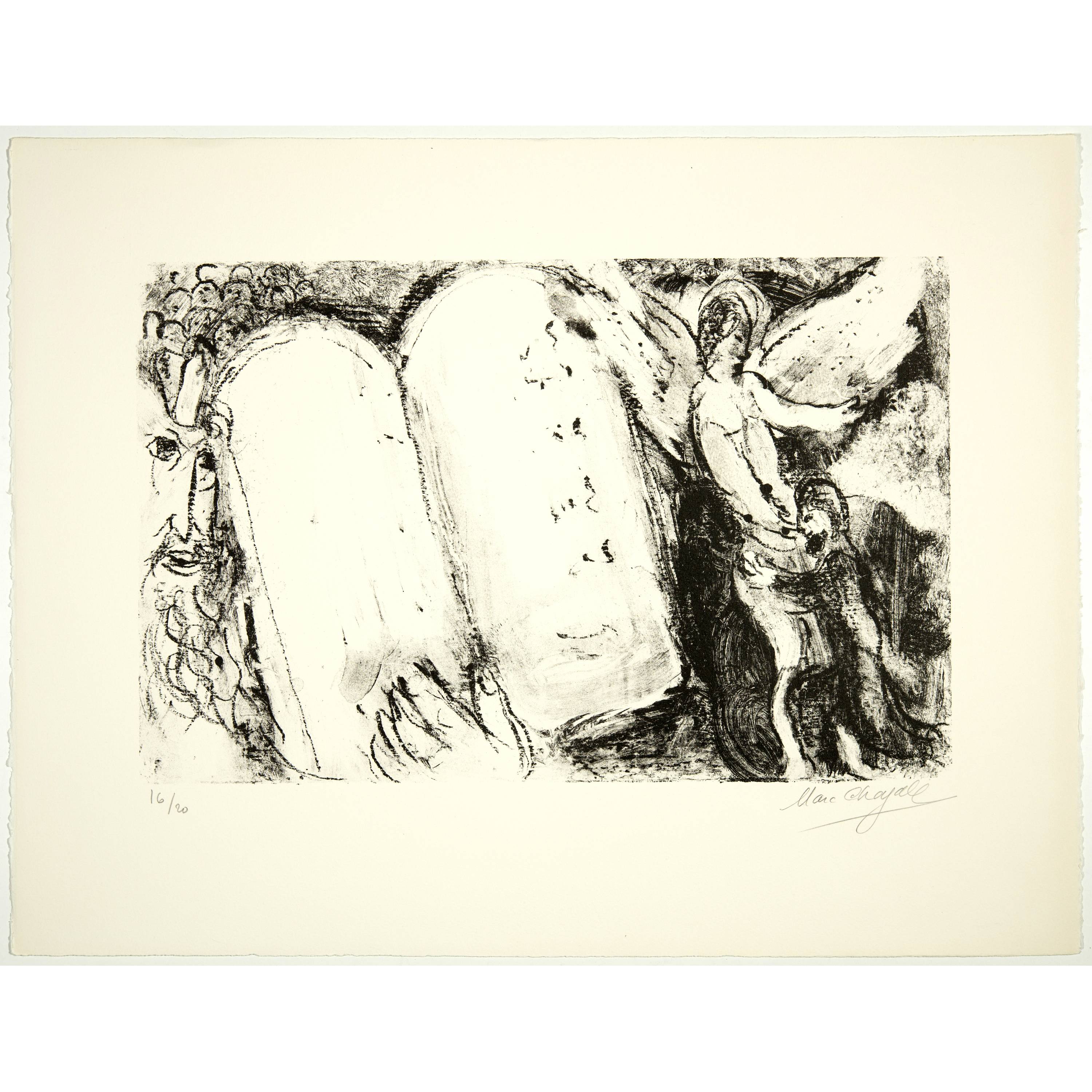 Von der "Vision des Moses" hat Chagall zwei Zustände geschaffen, der vorliegende 1. Zustand wurde in Schwarz/Weiss in lediglich 20 Exemplaren gedruckt, vom 2. Zustand, mit ergänztem Sujet, existiert eine Auflage von 75 Exemplaren