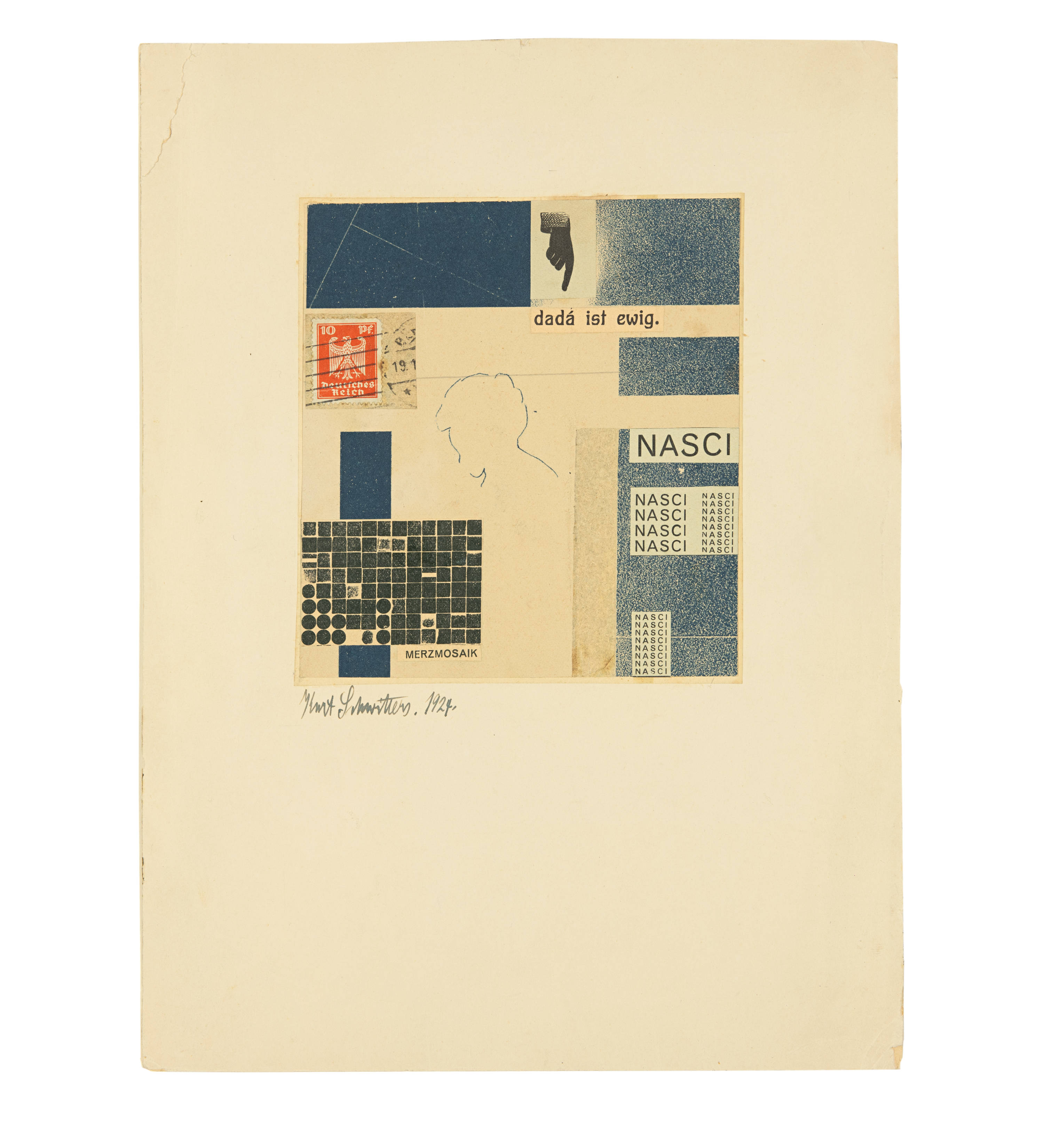 Kurt Schwitters verwendet seit 1918 den Begriff "Merz" (laut Eigenaussage vom Wort "Kommerz" abgeleitet) für seine Collagen und Assemblagen. Der Terminus wird fortan zum Synonym für seine vielseitigen künstlerischen Aktivitäten. 1919 finden erste Gruppenausstellungen mit seinen Merzbildern statt, u. a. in der Galerie "Der Sturm", Berlin. Er veröffentlicht Texte wie "Anna Blume. Dichtungen", die in den Kanon der Literaturwissenschaft eingehen, oder schreibt Essays zu seinem Verständnis von "Merz"-Kunst. Im Januar 1923 erscheint die erste Ausgabe der von ihm herausgegebenen Zeitschrift "Merz", weitere folgen in unregelmässigen Abständen in verschiedenen Formaten bis 1932. Für die vorliegende Collage verwendet er einen Teil einer Lithographie, die in der ersten Merzmappe von 1923 erscheint (vgl. Blatt 4 aus: "MERZ 3. MERZ MAPPE. ERSTE MAPPE DES MERZVERLAGES", Orchard/Schulz 1194.5.) und collagiert diesen mit diversen graphischen und textlichen Elementen. Neben einer abgestempelten Briefmarke, einem Merzmosaik, dem Satz "dadá ist ewig." kommt auch das Wort "NASCI" vor: ein Begriff, der sich auch auf dem Titelblatt der Merzzeitschrift 8/9, die er in Zusammenarbeit mit El Lissitzky 1924 publiziert hat, wiederfindet. Die Merzzeichnung besticht durch die ausgewogene Komposition, in der Mitte platziert er ein Gesichtsprofil in blauer Tusche
